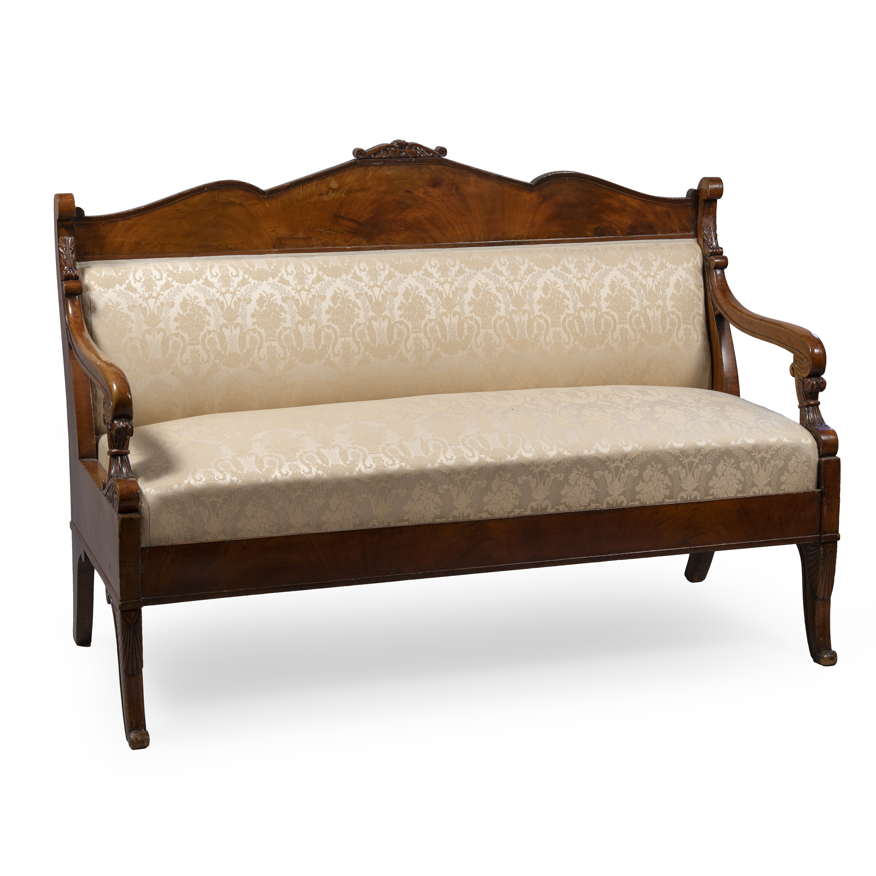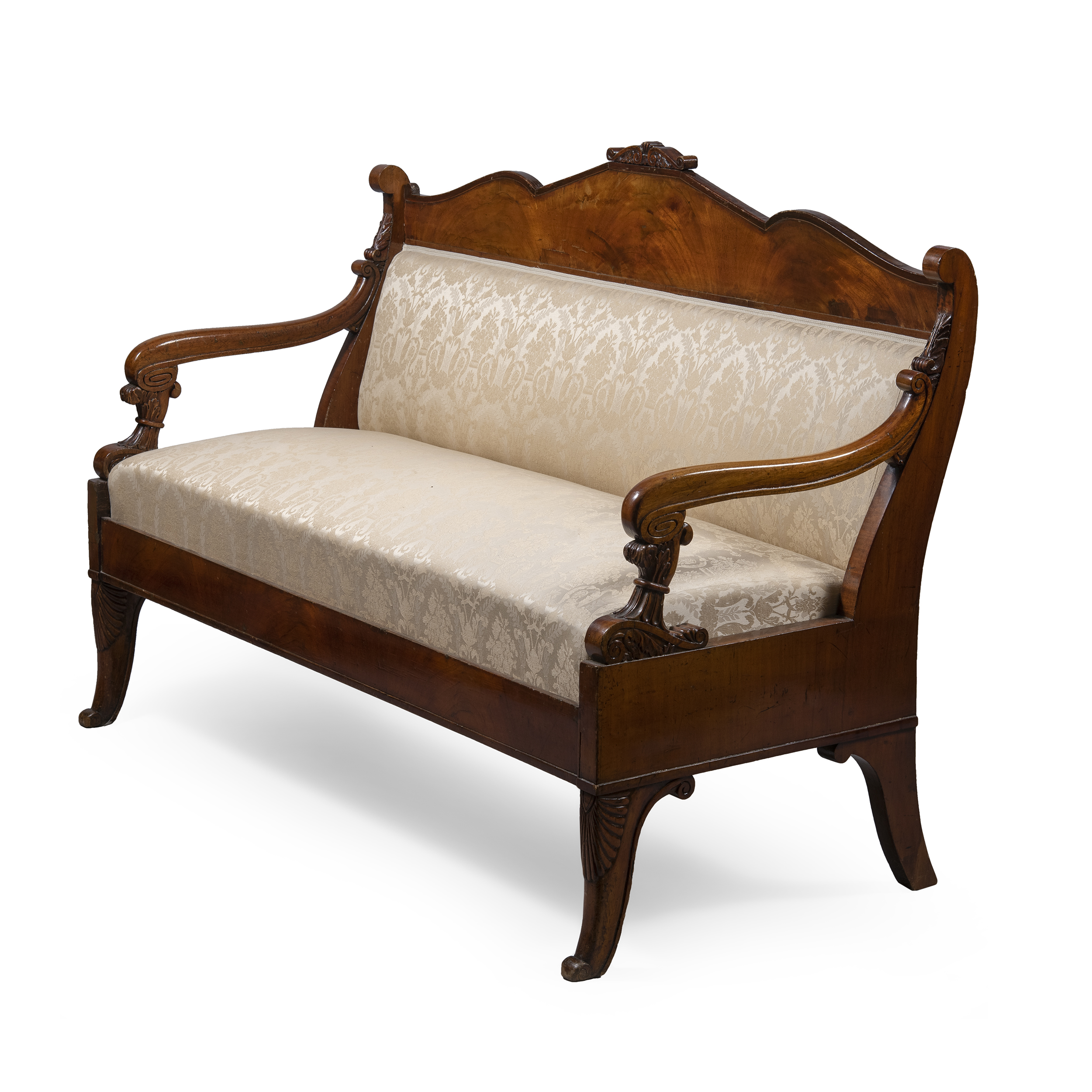 Массив дуба (основа), фанерование шпоном красного дерева; резьба, ткань, Россия, середина XIX века, размеры (д/ш/в): 150 х 67 х 106 см