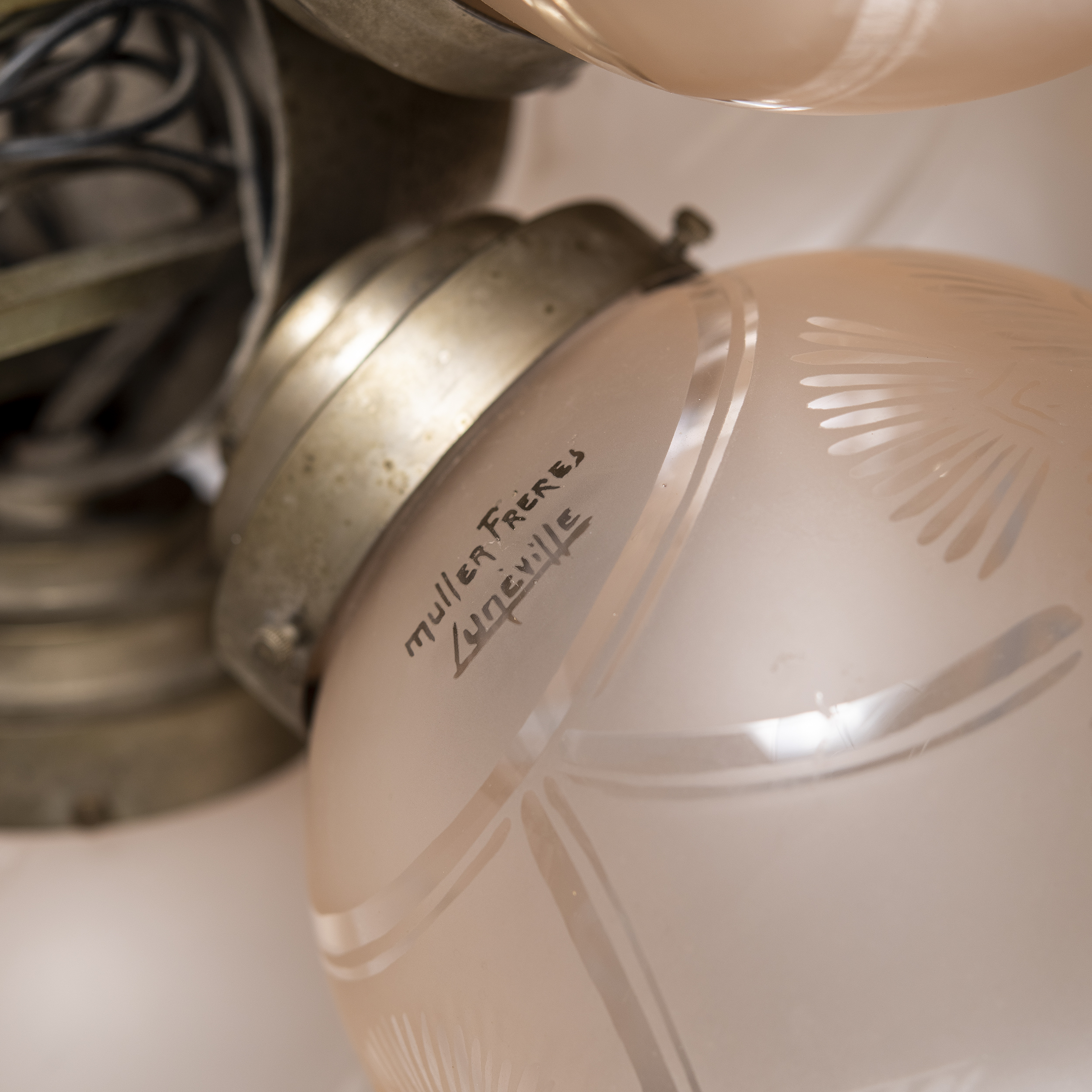 Металл, литье, плафоны - матовое многослойное прессованное стекло розового цвета, матирование, на плафоне «Muller Freres Luneville», фирма братьев Мюллер, Франция, Лотарингия, 1920-ые годы, высота - 96 см