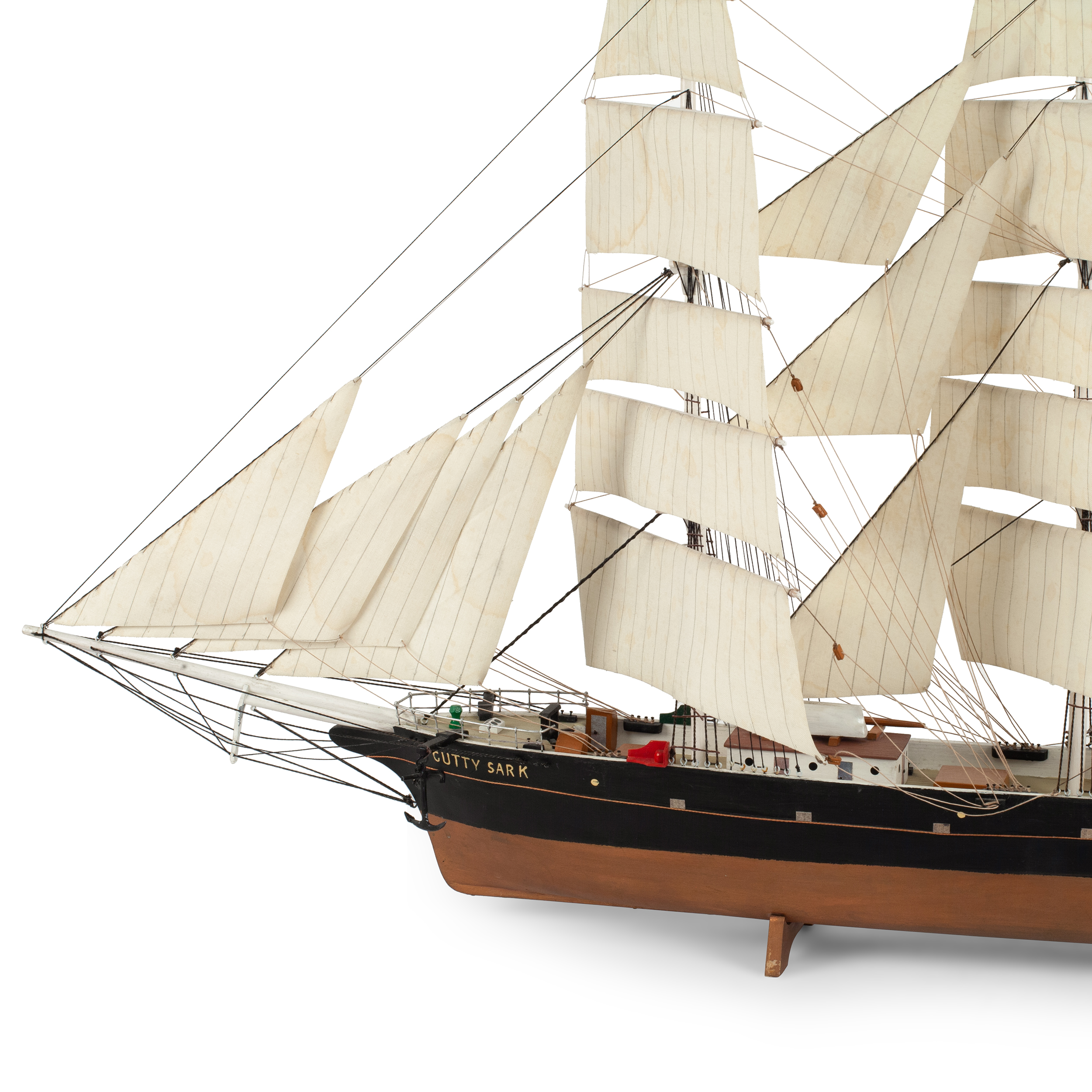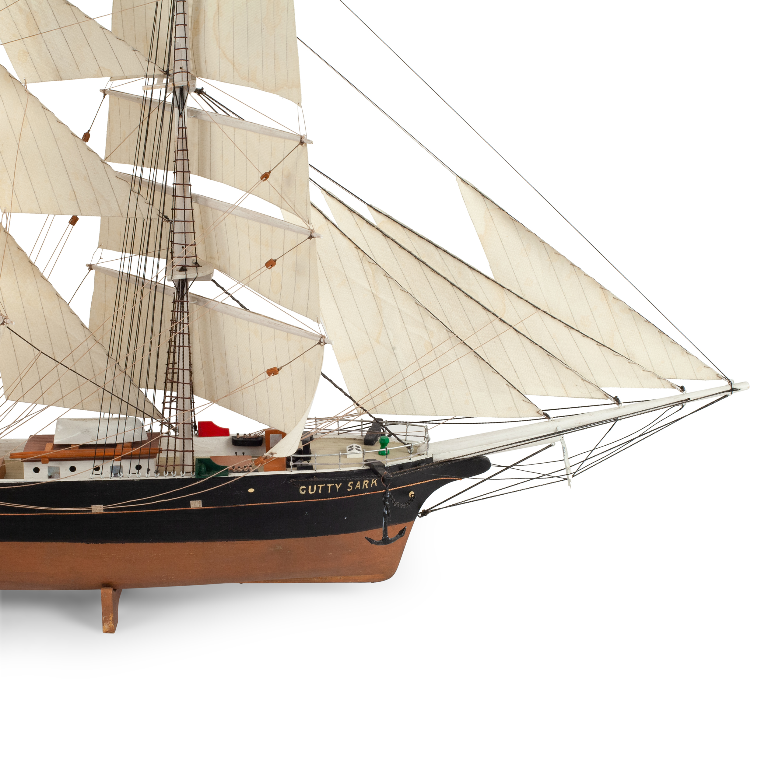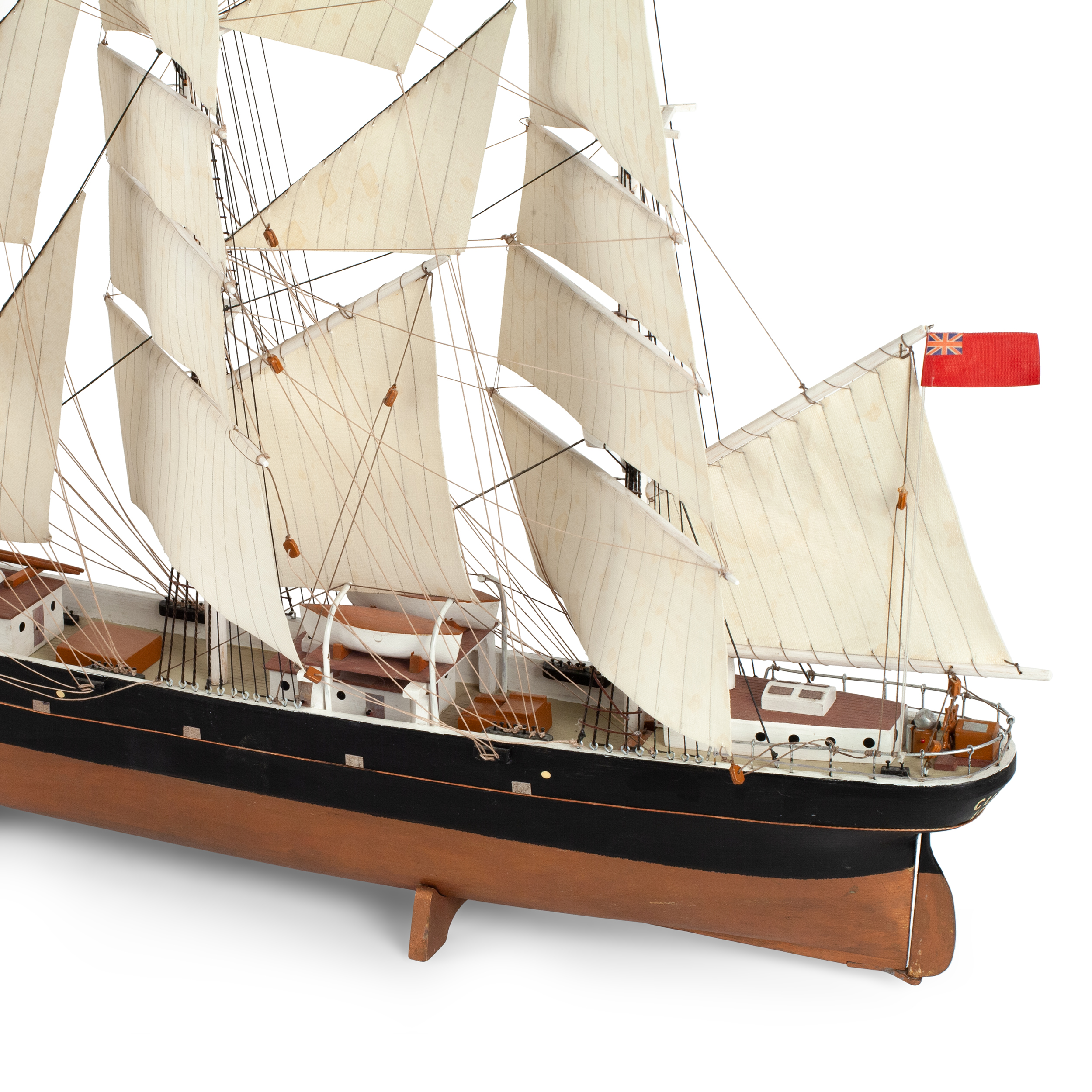 Модель корабля знаменитого британского клипера «Cutty Sark», построенного в 1869 году. Деревянная корма, использование различных пород дерева, окрашивание, шпатлевка, смолы, металл, ткань, название по борту «Cutty Sark», Европа, вторая половина XX века, размер (в/ш/г): 42 х 53 х 14 см