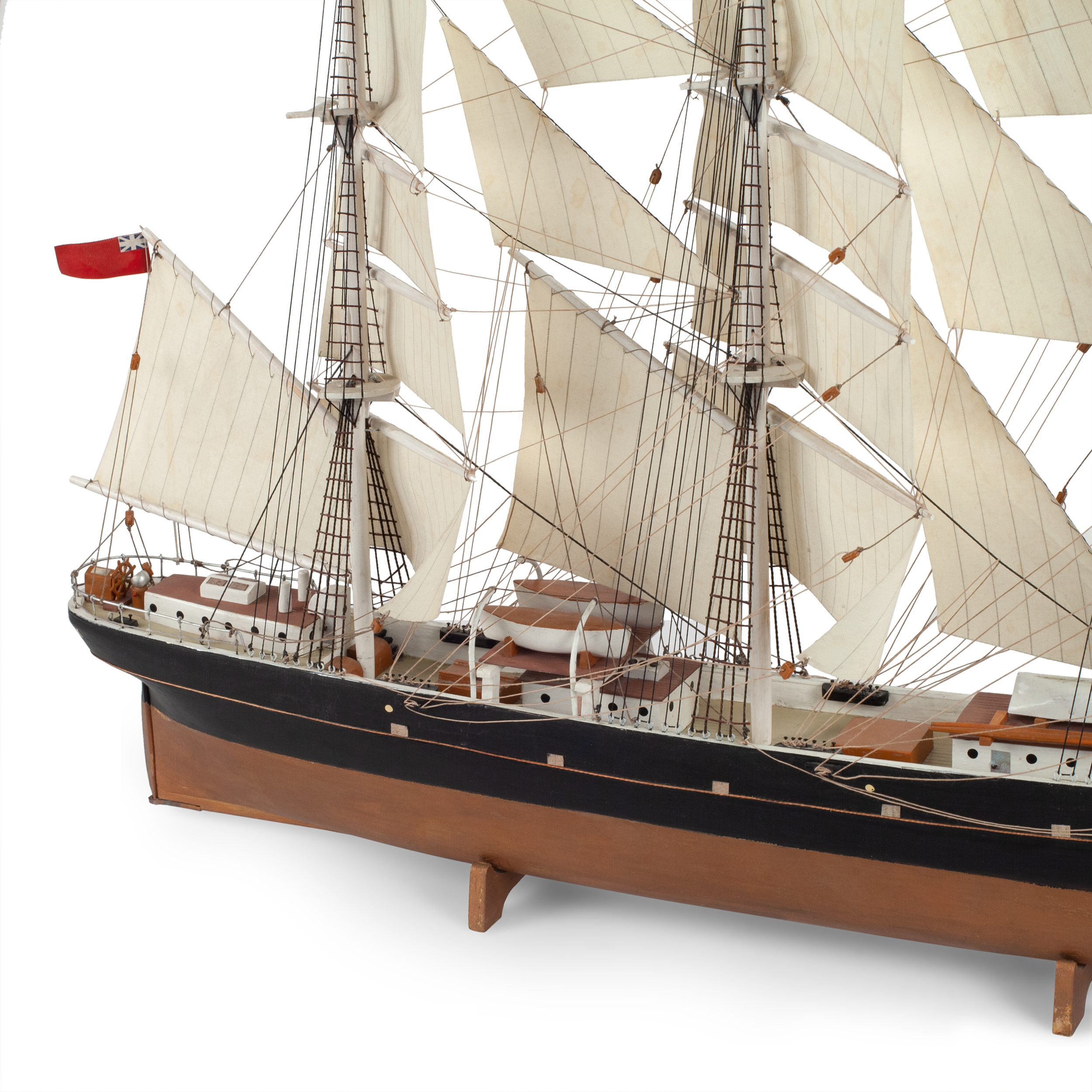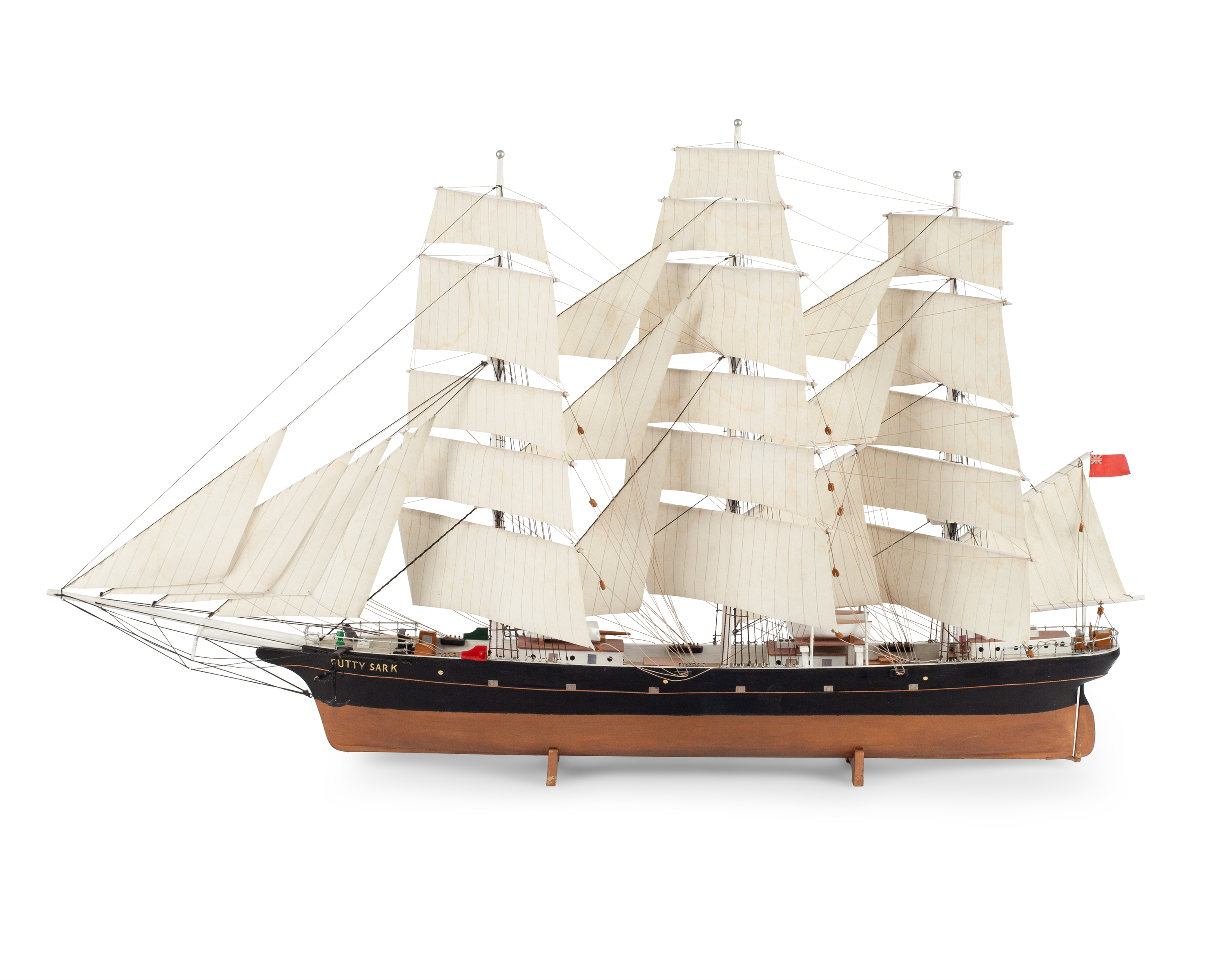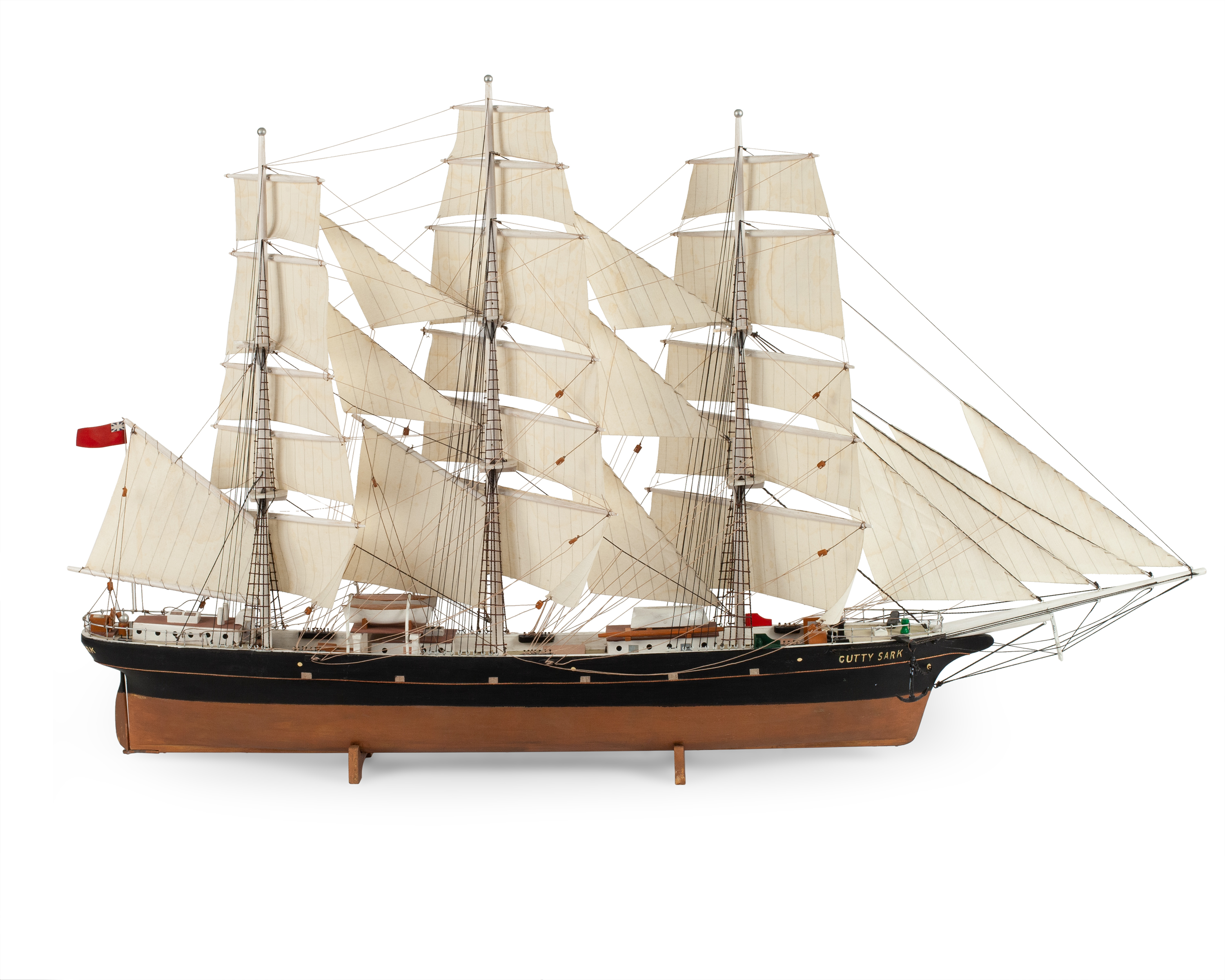 Модель корабля знаменитого британского клипера «Cutty Sark», построенного в 1869 году. Деревянная корма, использование различных пород дерева, окрашивание, шпатлевка, смолы, металл, ткань, название по борту «Cutty Sark», Европа, вторая половина XX века, размер (в/ш/г): 42 х 53 х 14 см