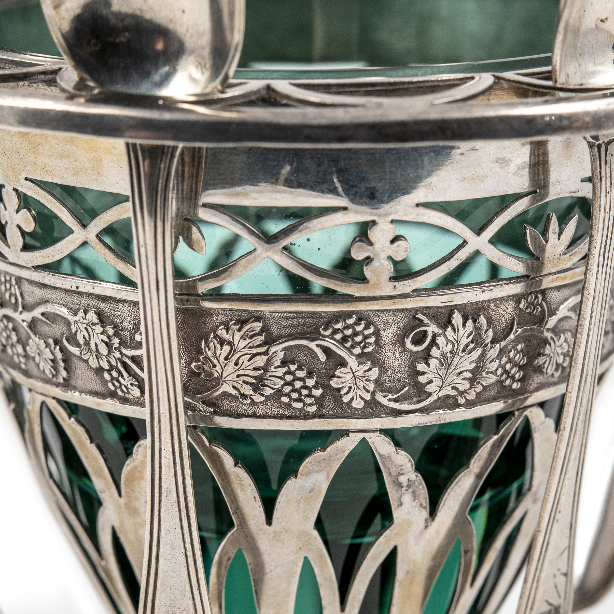 Серебро, литье, чеканка, ручная проработка, изумрудное стекло;