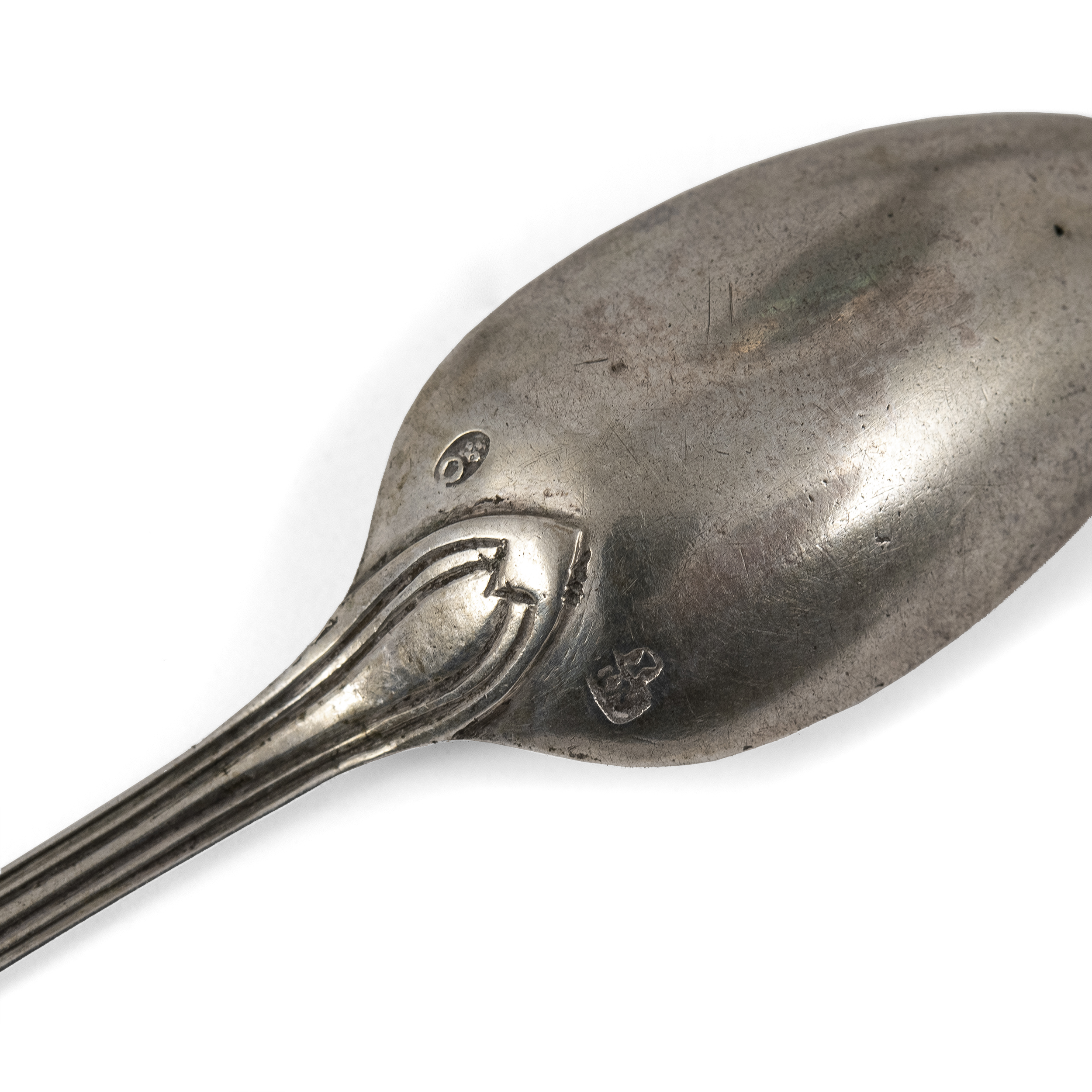 Клеймо мастера «CHRISTRINER» Иоганна Зигмунда Кристайнера (Christeiner Johann Sigmund, ок.1776 – 1831), годовое клеймо «R под шишкой» в фигурной щитке; клейма на ложках 800 (перепробир.), мастера гравера «IEN» - Иоганн Эсайас Ниггус (Johann Esaias Niggus, 1768-1815), «Q» под короной;