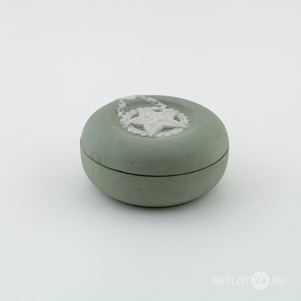 Шкатулка-пудреница со знаком «Готов к труду и обороне». Белый и зеленый неглазированный фарфор - бисквит, рельеф, клеймо синее печатное штампом Дмитровской фарфоровой фабрики, 1946-1954 годы, диаметр – 9,5 см, высота – 4,5 см