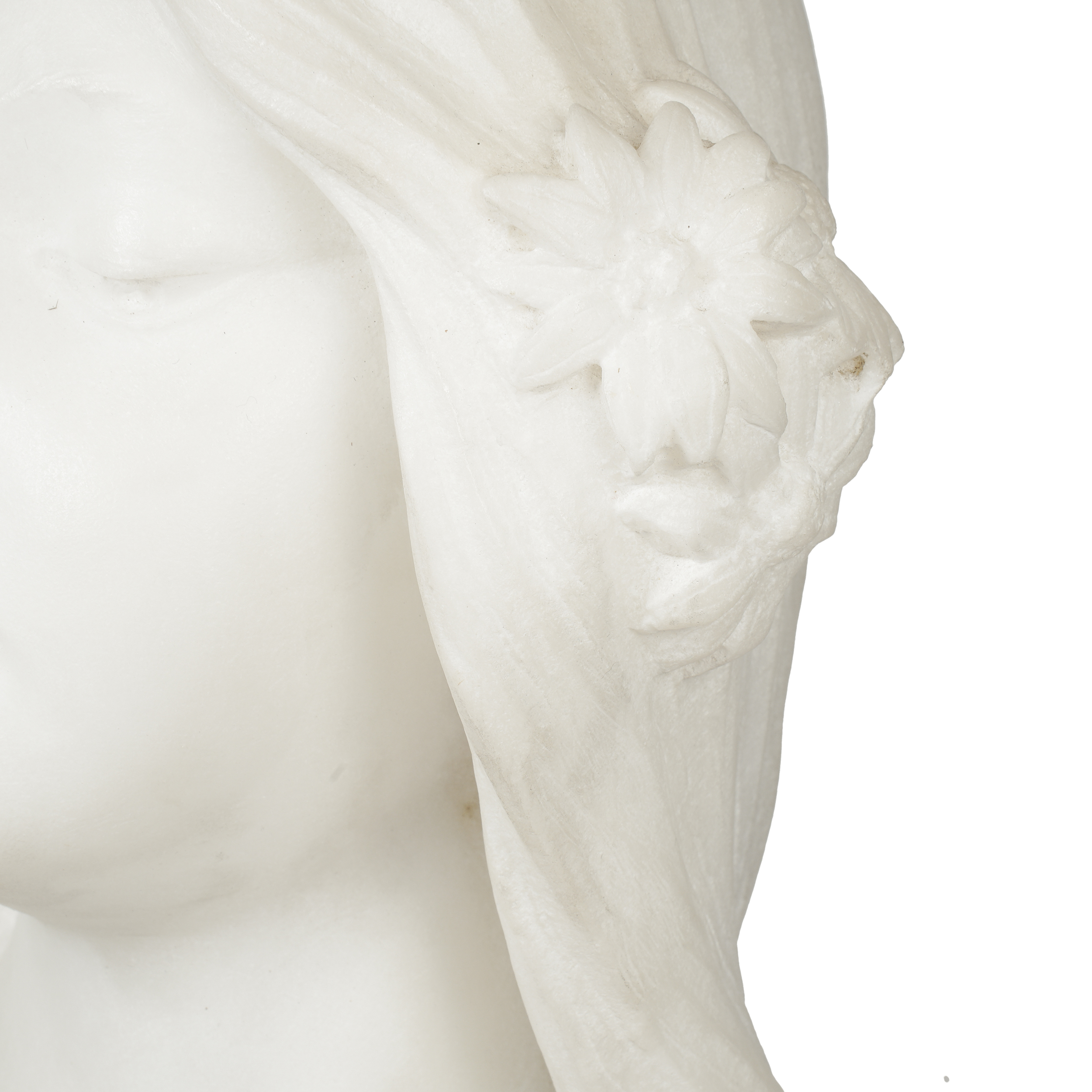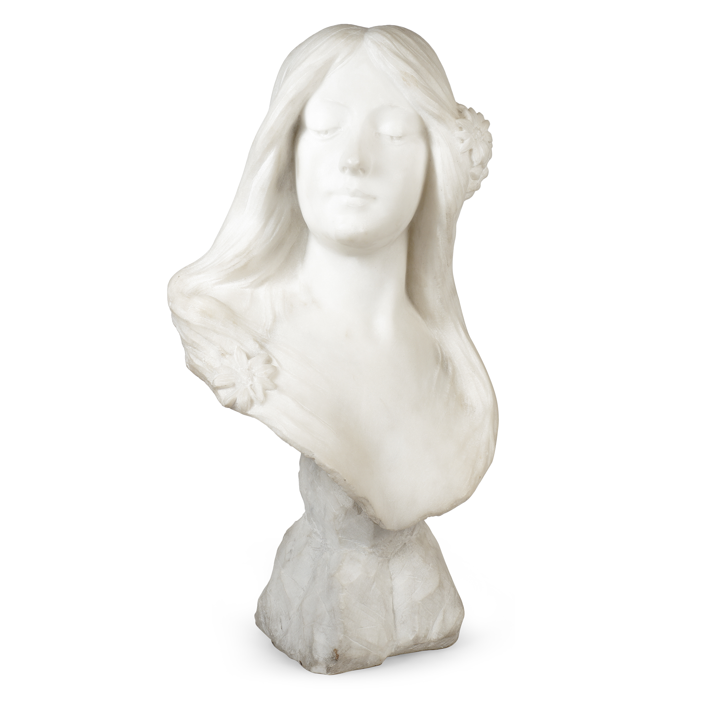 Работа выполнена из белого мрамора, материала, который в этот период особенно ценился за способность передавать мягкие, почти перламутровые переходы света. Скульптор использует сочетание тщательной рубки с последующей шлифовкой, благодаря чему черты лица трактованы чисто и гладко, а волосы и цветочная деталь — более рельефно, с подчеркнутой фактурностью. Такой контраст поверхностей является одним из ключевых выразительных средств пластики модерна.