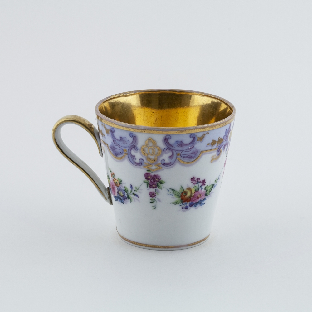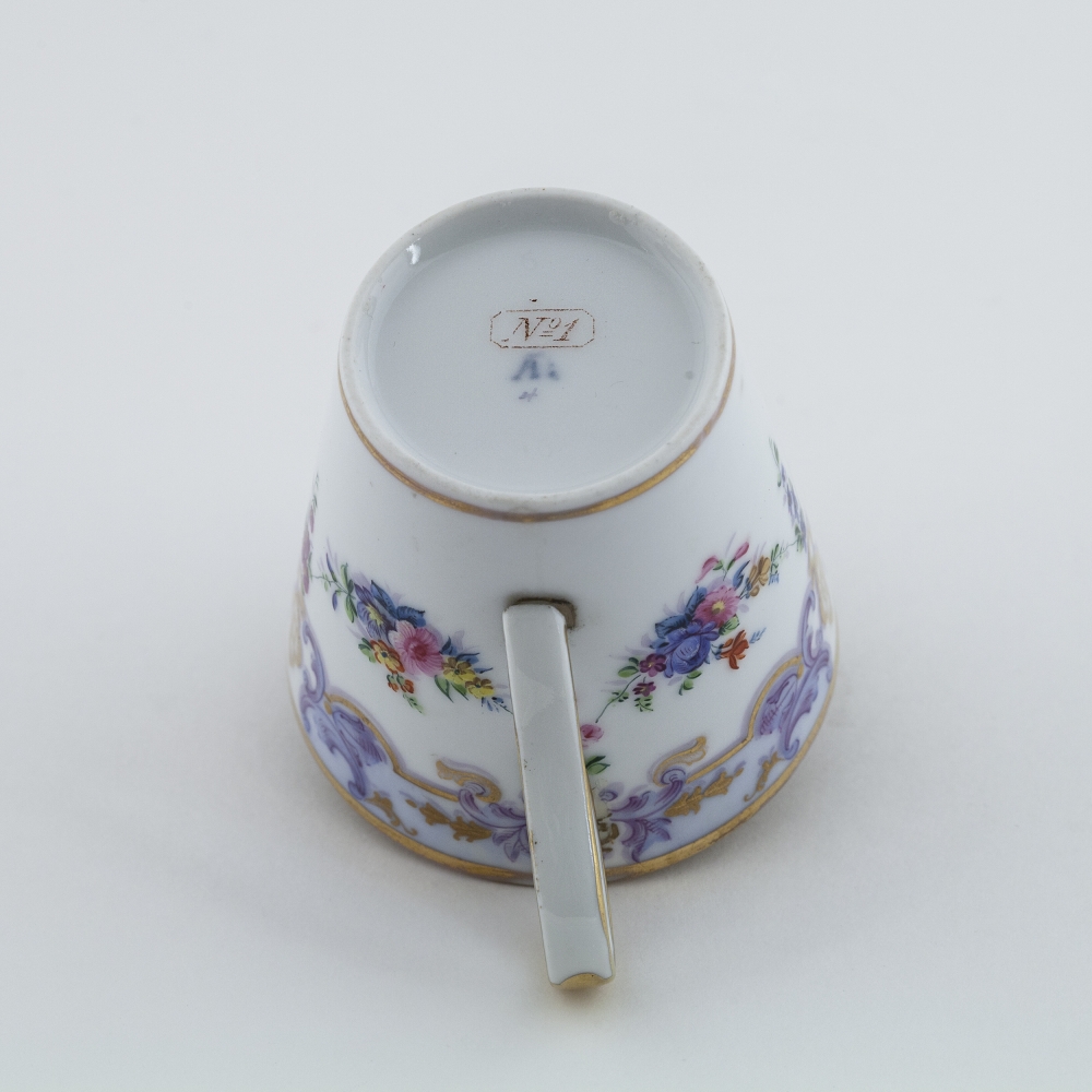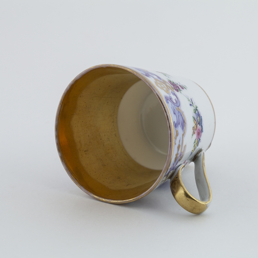 Фарфор, надглазурная полихромная роспись, золочение, марка подглазурная кобальтом - совмещенное «АП» завода А. Г. Попова, Россия, село Горбуново Дмитровского уезда Московской губернии, 1840-1850-е годы, высота - 6,8 см, диаметр - 7 см