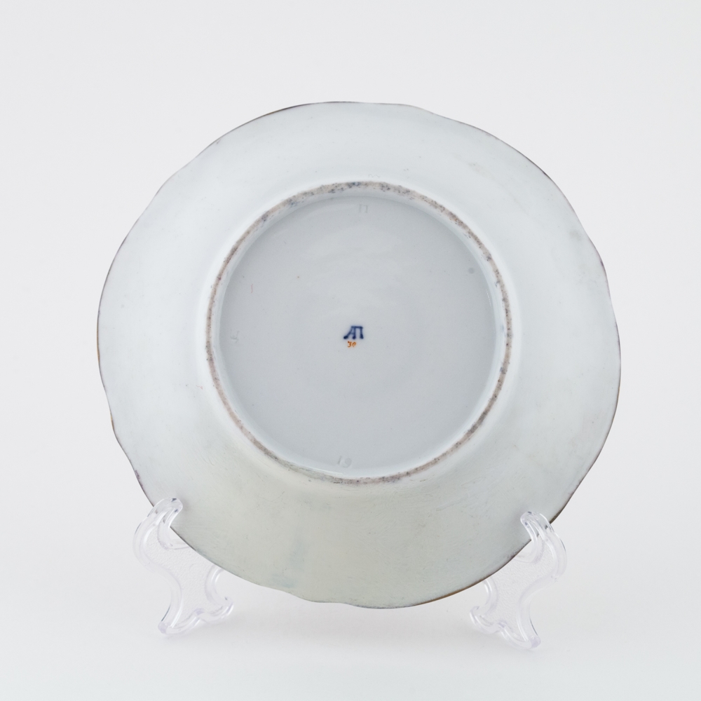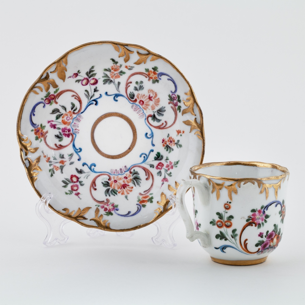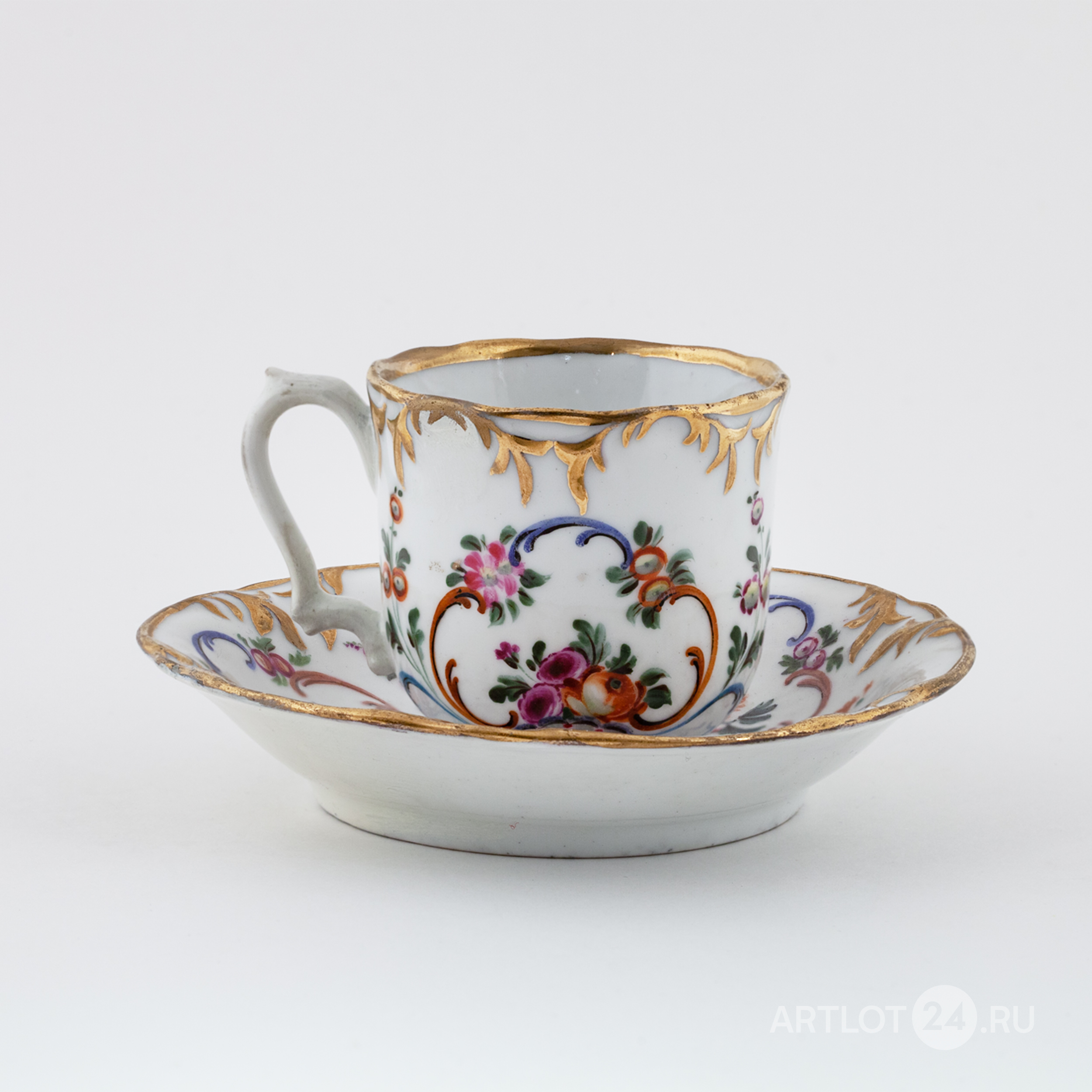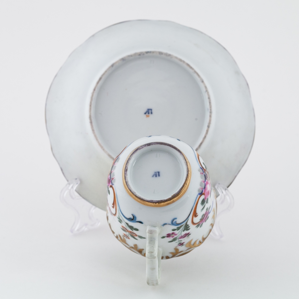 Фарфор, полихромная надглазурная роспись, золочение, марка подглазурная кобальтом - совмещенное «АП», а также «19» и знаки в тесте (на чашке «А», «II», на блюдце «Щ», «II»), завод А. Г. Попова, Россия, первая треть XIX века, высота – 6,5 см