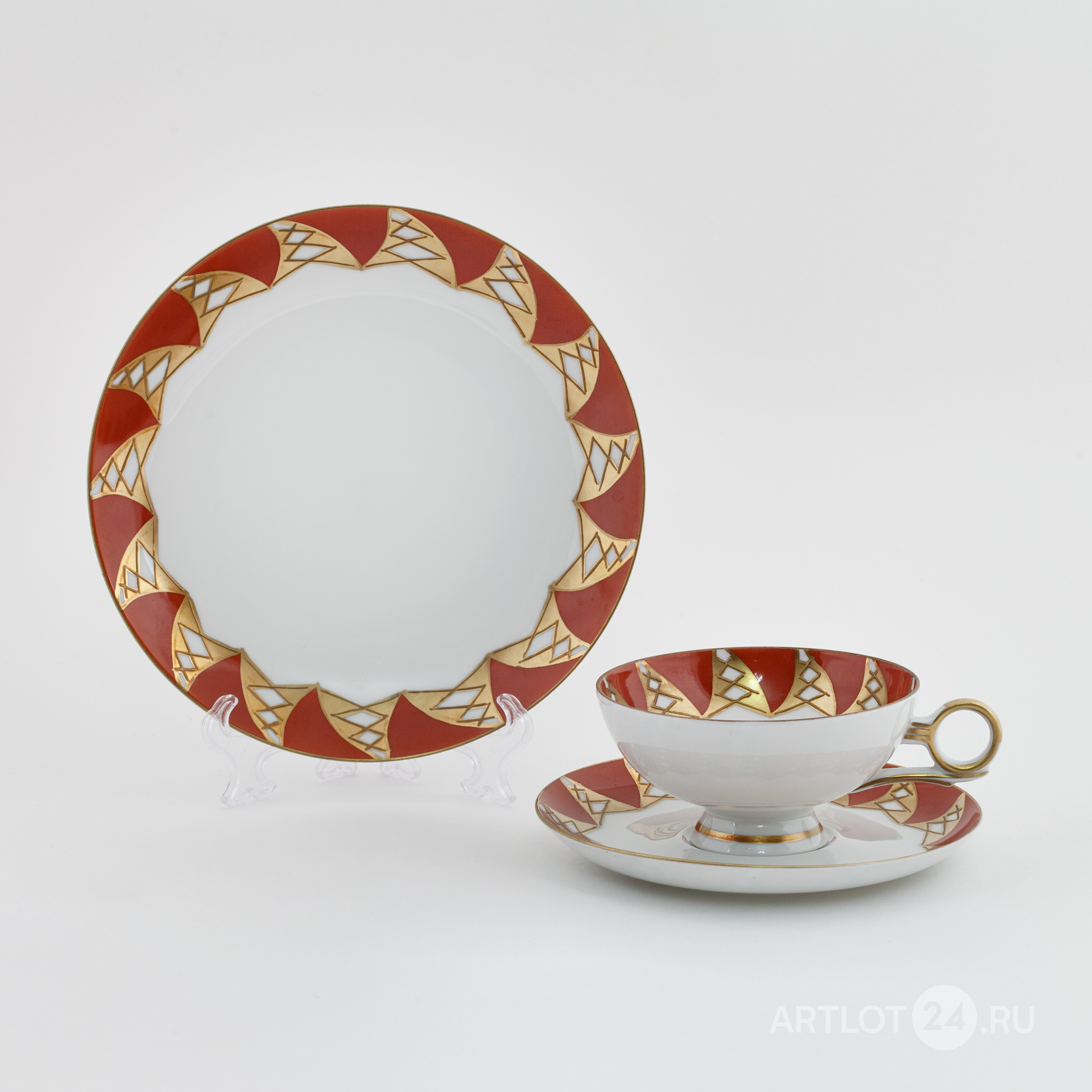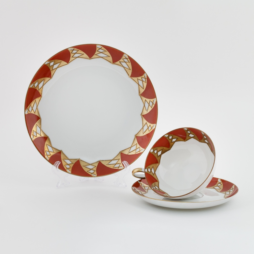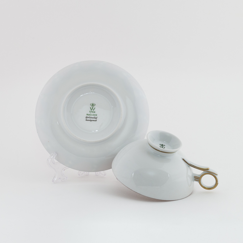 Фарфор, темно-красное крытье, золочение, клеймо печатное зеленое надглазурное «W 1764 made in GDR» под короной, а также «Goldrelief Handgemalt», Валлендорф, Тюрингия, Германия, 1964-1970-е годы, высота – 5,5 см, диаметр десертной тарелки – 19,4 см