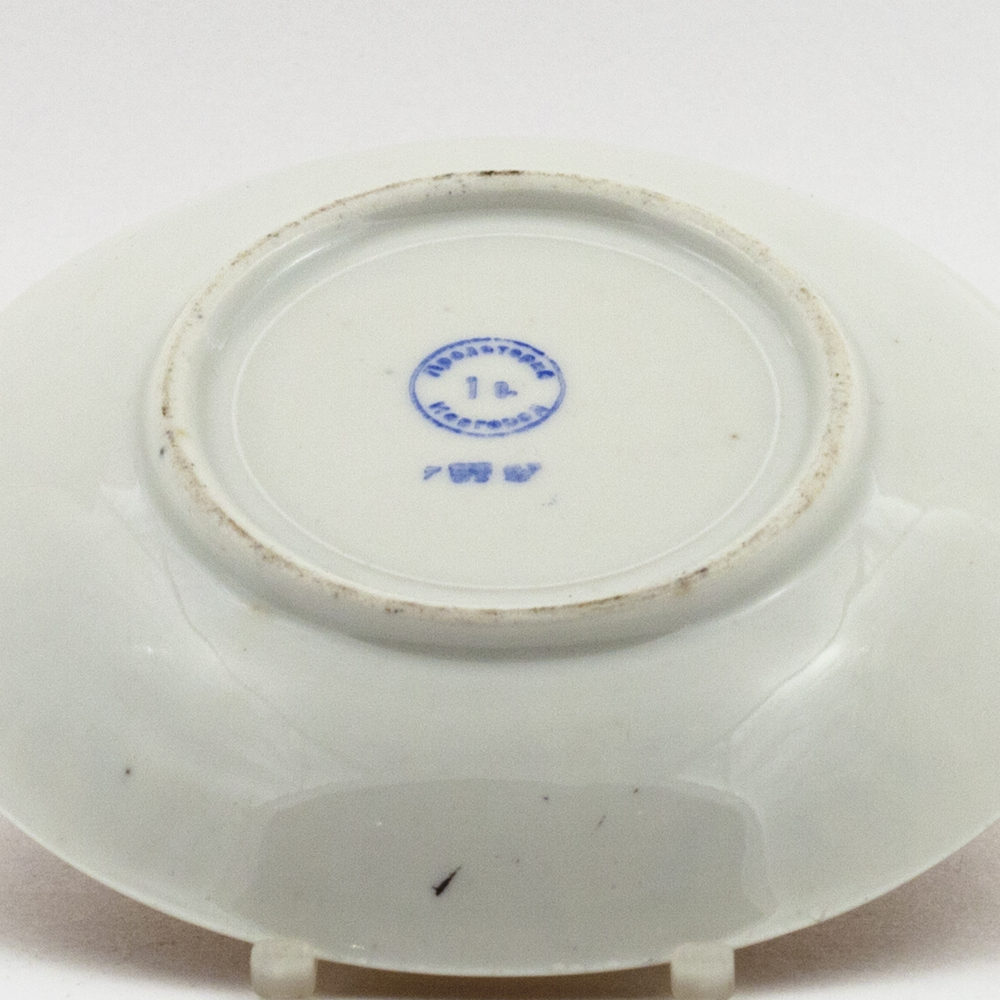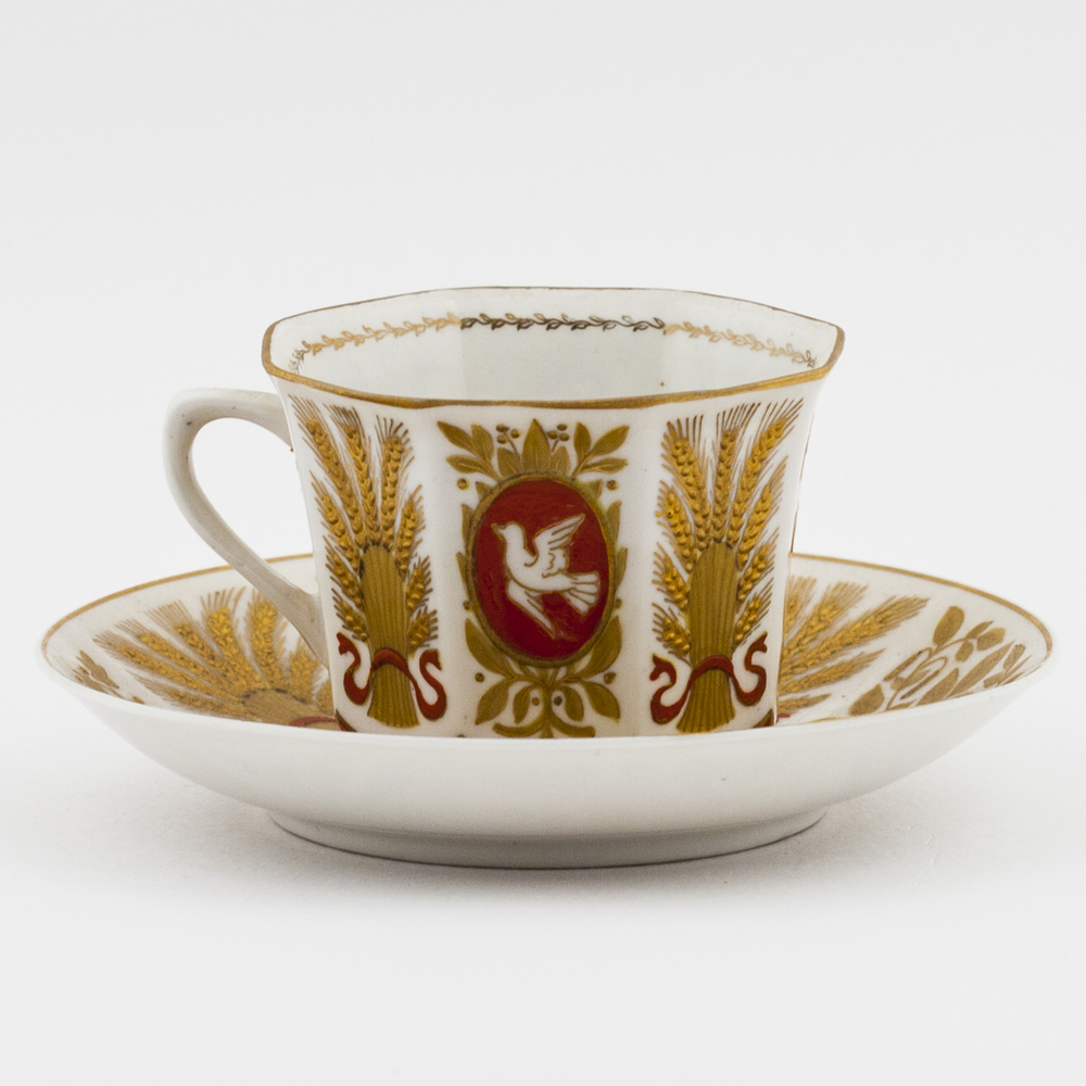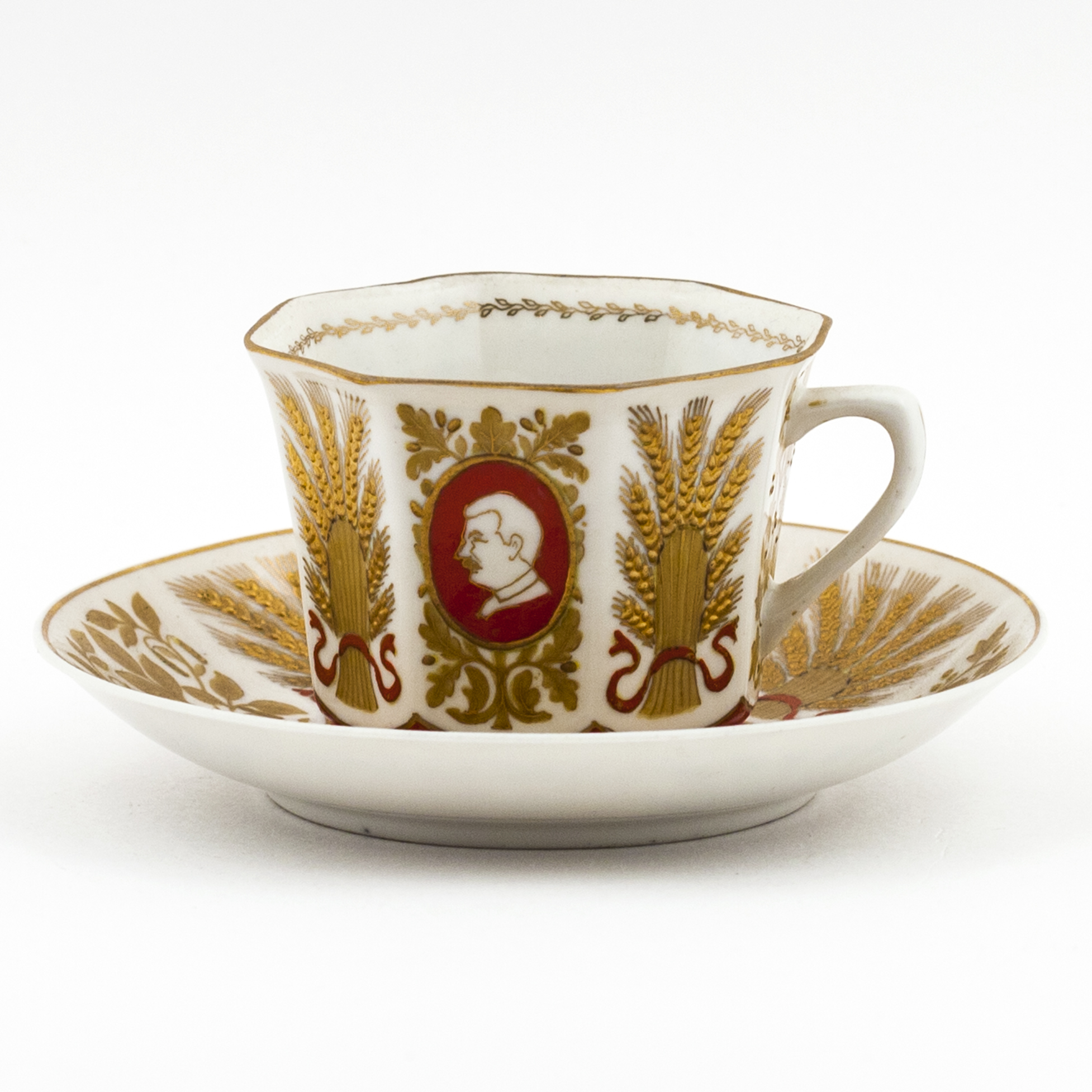 Чайная пара из сервиза "Сталинский план преобразования природы" с силуэтом профиля И.В. Сталина. Фарфор, роспись, золочение, автор Чекулина Александра Алексеевна (1906–1986), фарфоровый завод «Пролетарий»,СССР, РСФСР , 1952 год, размеры: высота чашки– 7 см.