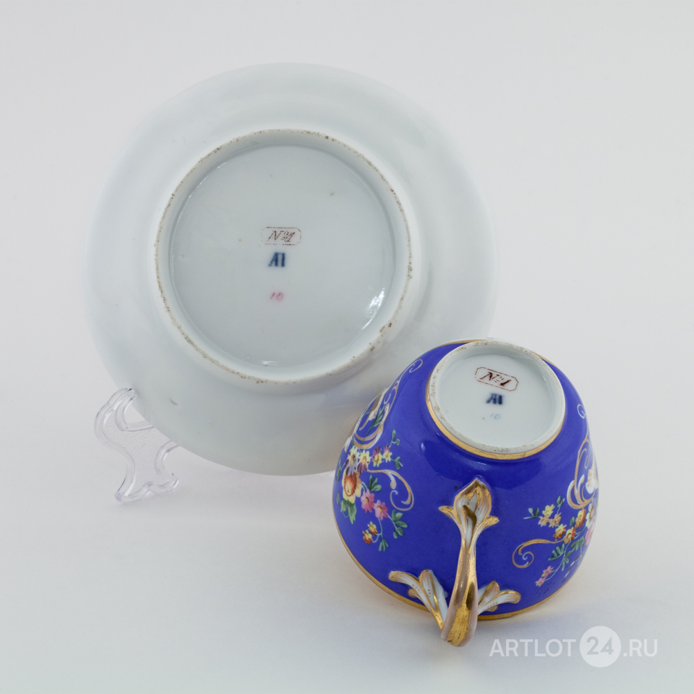 Состояние: Трещина на чашке (сквозная), небольшая реставрация по борту блюдца
