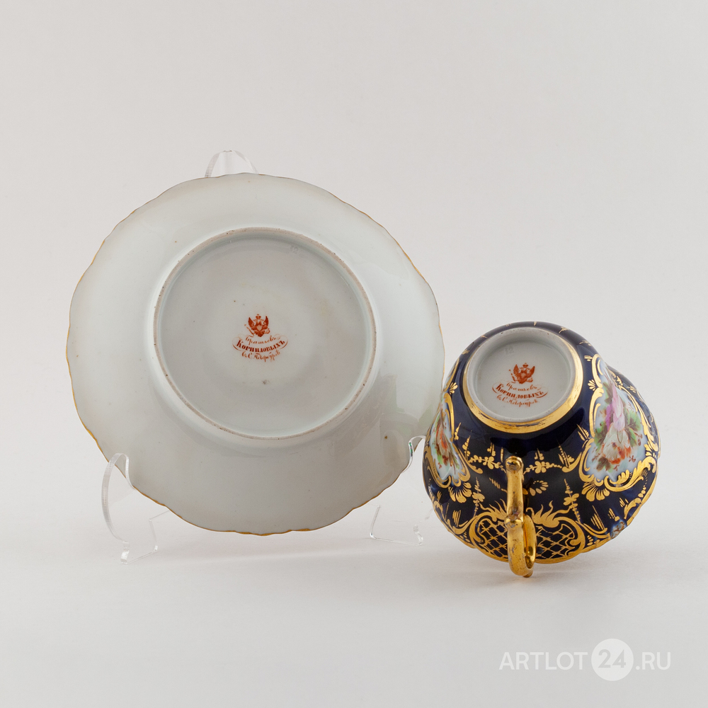 Фарфор, кобальтовое монохромное крытье, надглазурная полихромная роспись, золочение, марка: красная печатная под двуглавым орлом "Братьев Корниловых въ Петербурге" , Россия, 1861-1884 годы, высота – 7 см, диаметр чашки – 9,2 см, блюдца – 15,1 см.