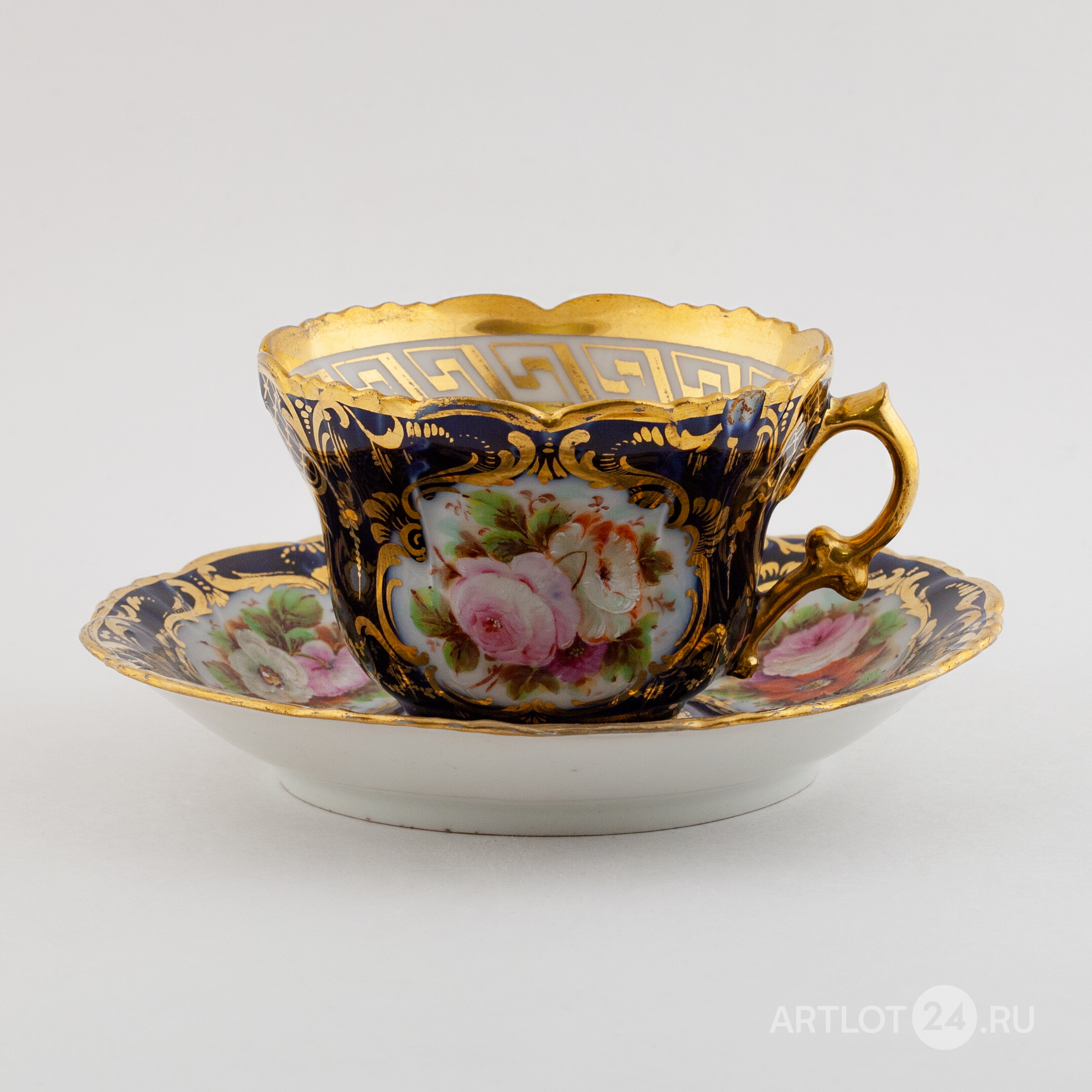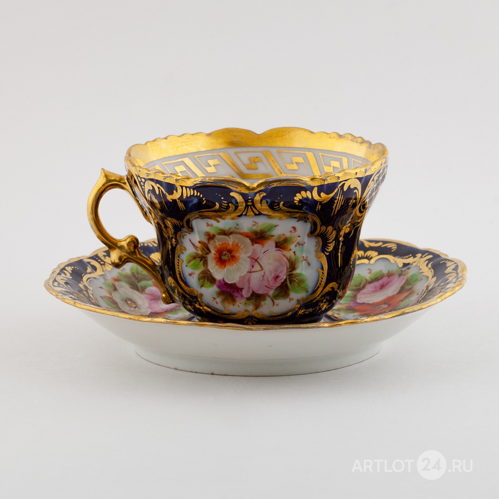 Состояние: Потертости золочения, скол по борту чашки с внешней стороны, небольшая реставрация по борту блюдца