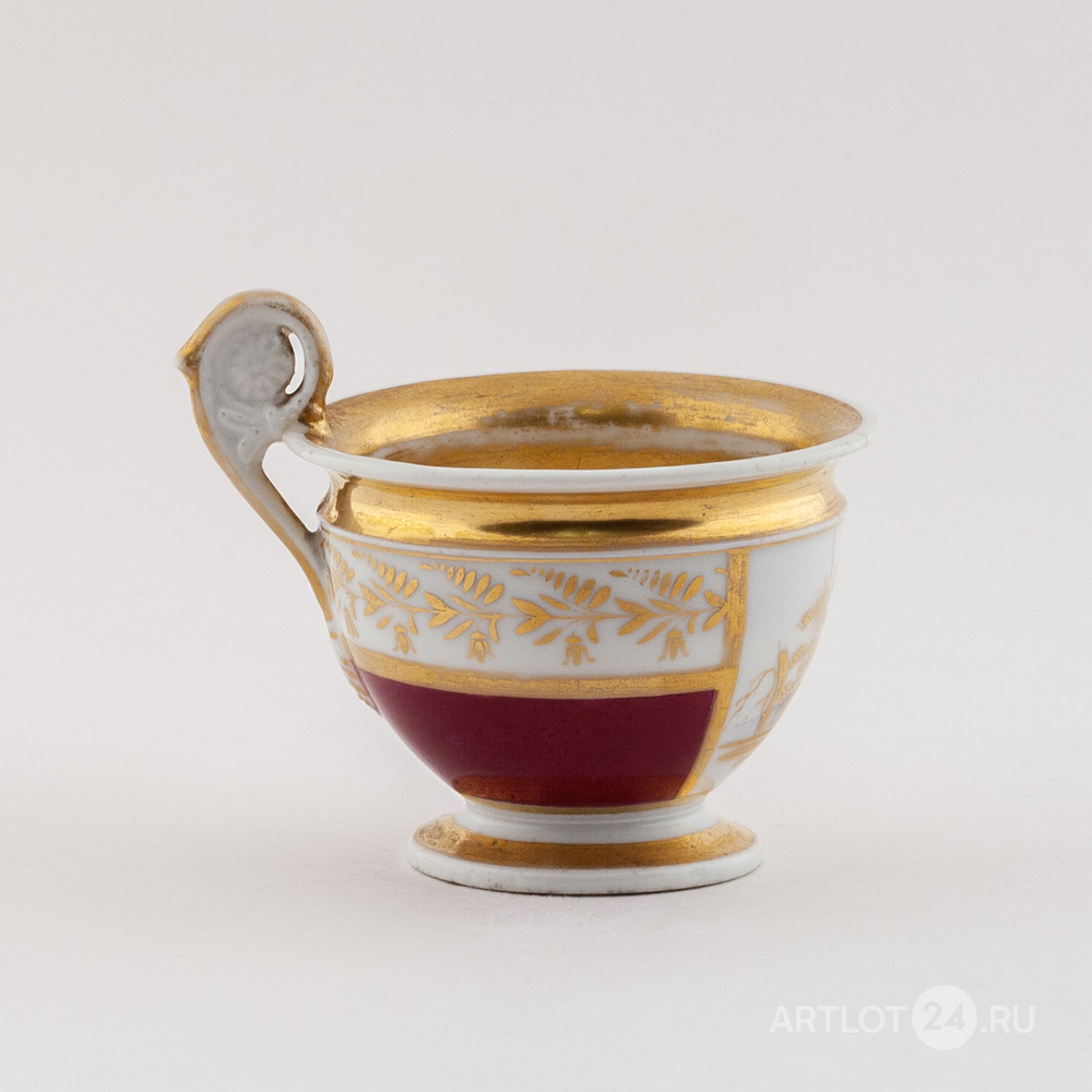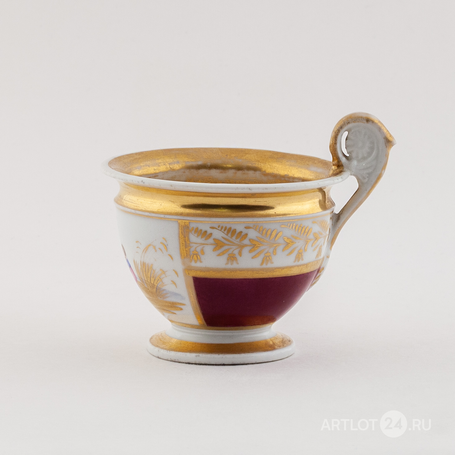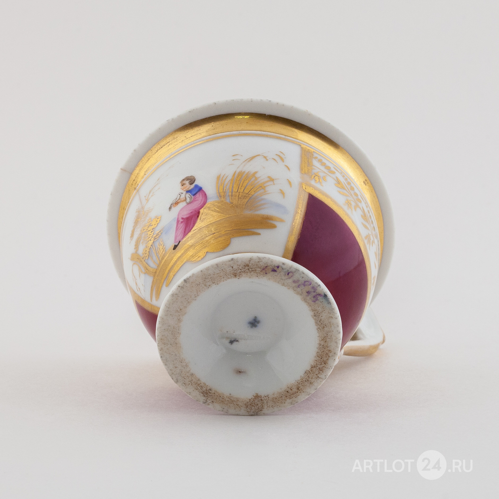 Фарфор, монохромное крытье, надглазурная полихромная роспись, золочение, цировка, клеймо кобальтом подглазурное «х» и штамп в тесте «фиванановаго» фабрики братьев Новых, Россия, д. Кузяево Богородского уезда Московской губернии, 1818-1832 годы, высота – 8