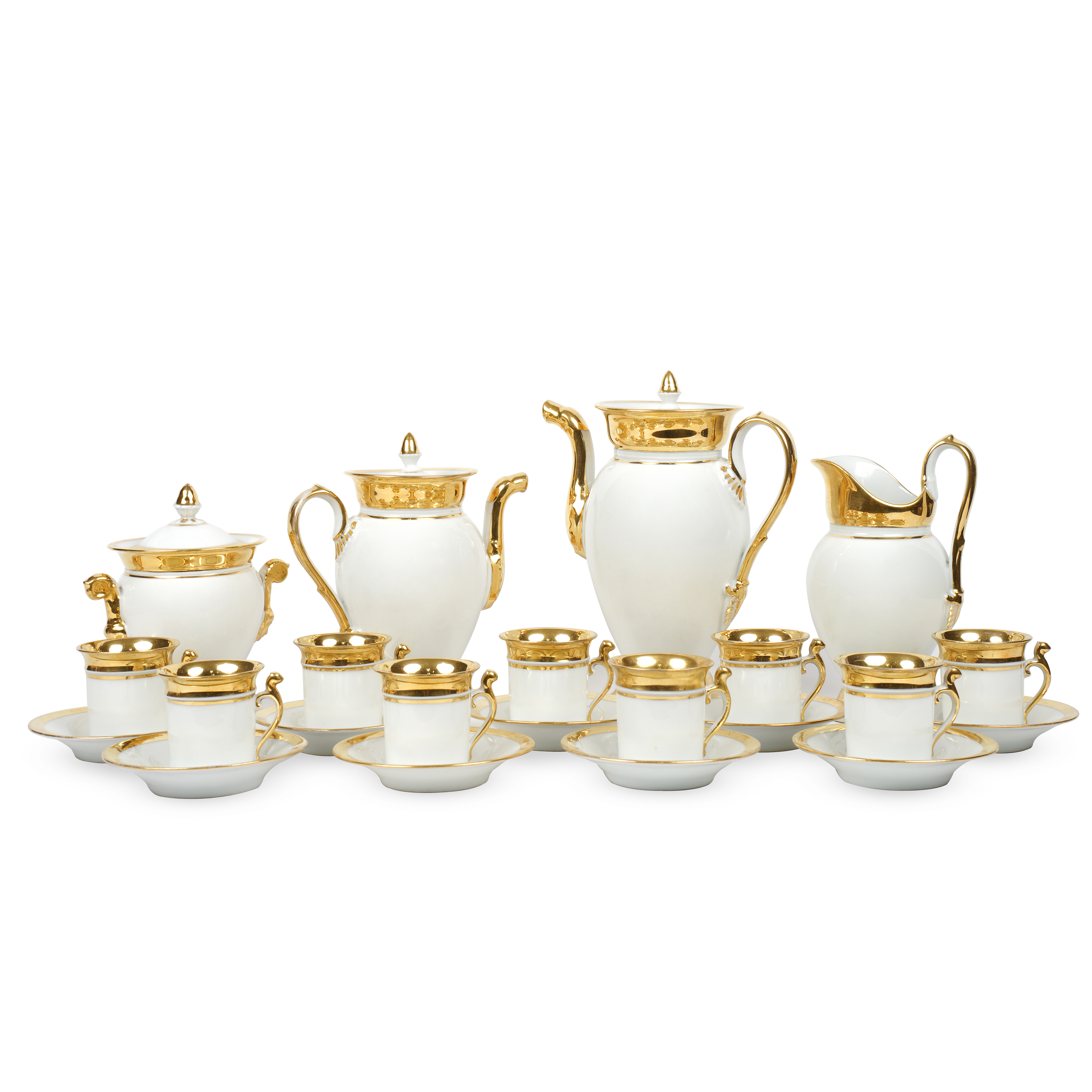 Чайник и кофейник, сахарница, молочник и 11 кофейных пар. Фарфор, бесцветная глазурь, разделка золотом, фигурные ручки выполнены в виде листьев аканта, носики чайника и кофейника - в виде лебедей; подглазурное клеймо кобальтом на сахарнице в виде «С», Европа, вторая половина XIX века, высота чайника – 25,5 см, кофейника – 22 см, молочника – 21 см, сахарницы – 17,5 см, чайной/кофейной пары – 6,4 см, диаметр блюдца – 12,7 см