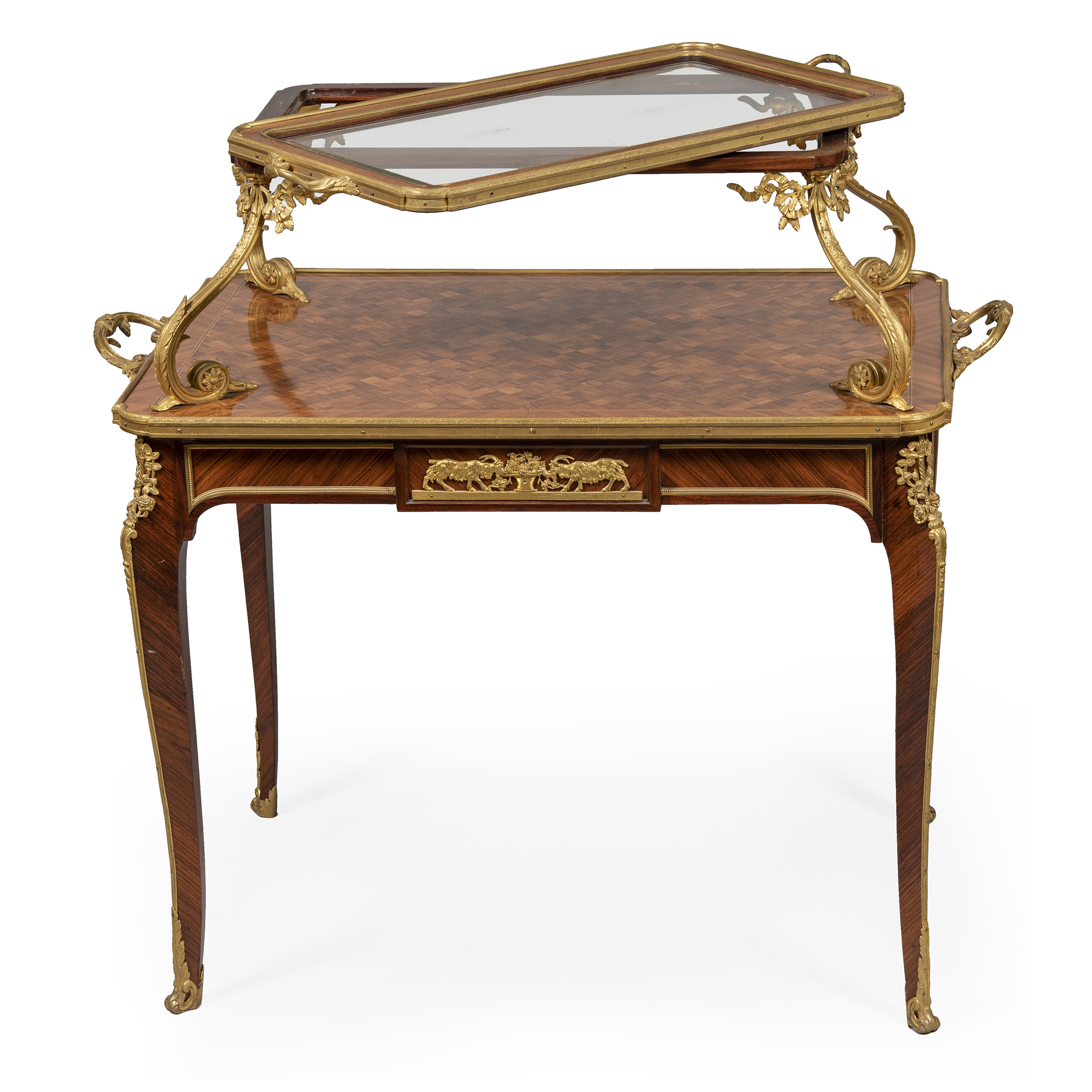 Двухъярусный столик со стеклянным подносом в бронзовой оправе. Выполнен в манере французского мастера Франсуа Линке (1855-1946). Палисандр, набор из различных пород, шпонирование, бронза, чеканка, золочение, стекло с фацетом, размер (в/ш/г): 91 х 79 х 54 см
