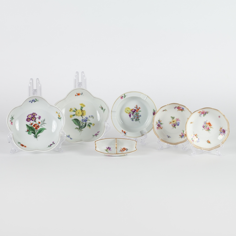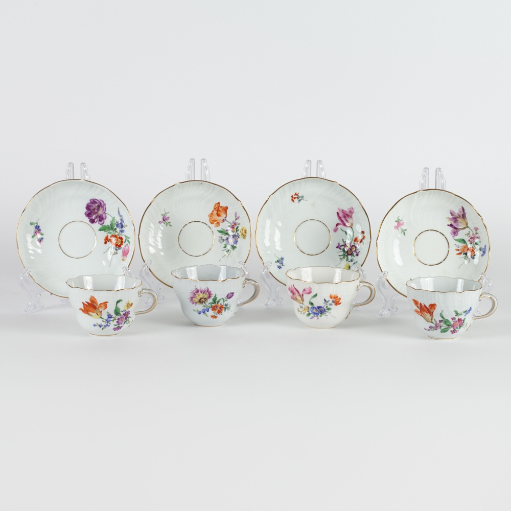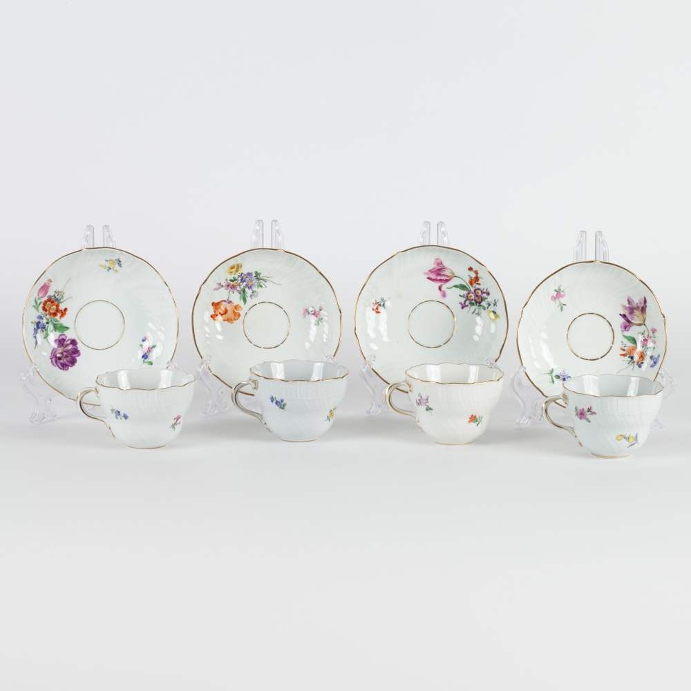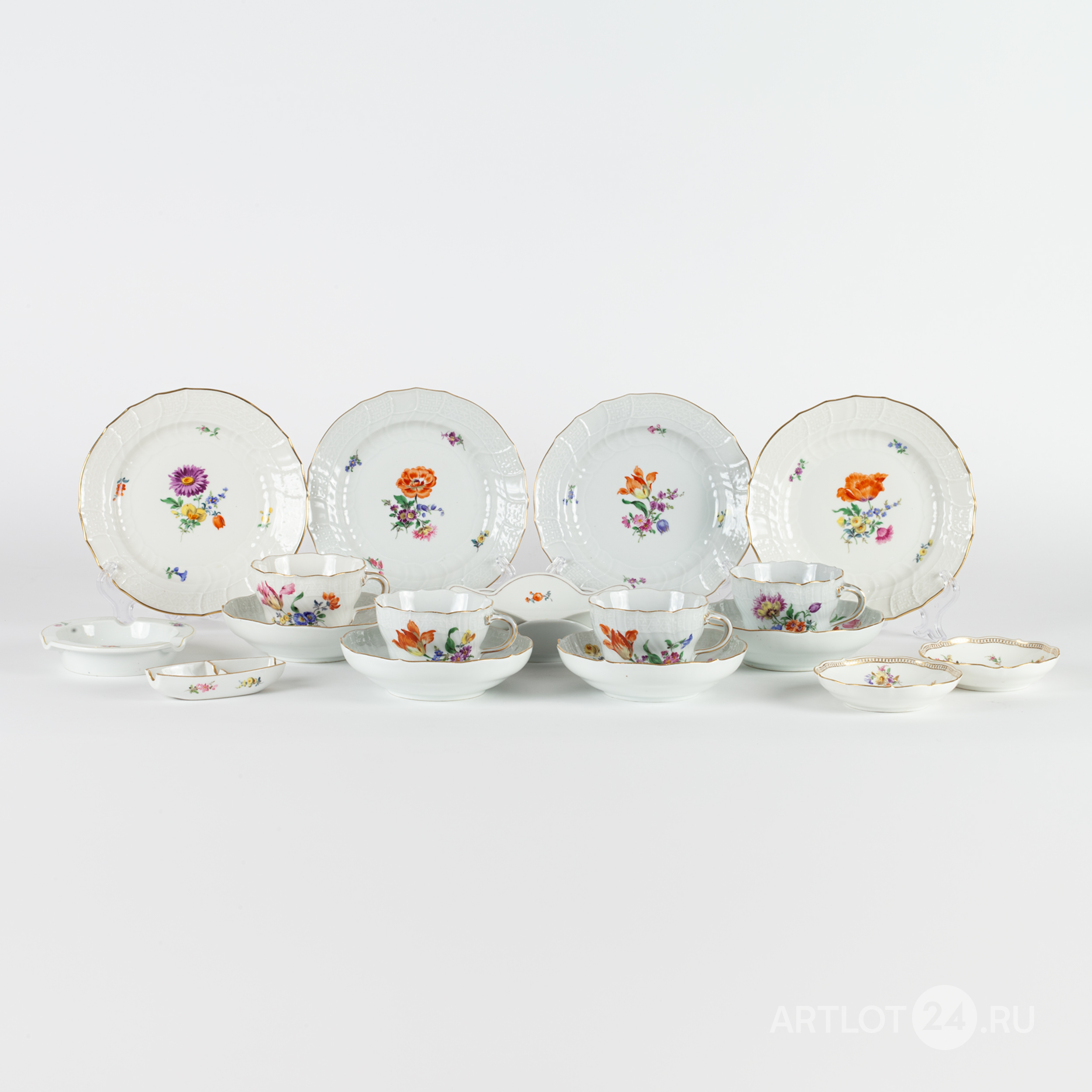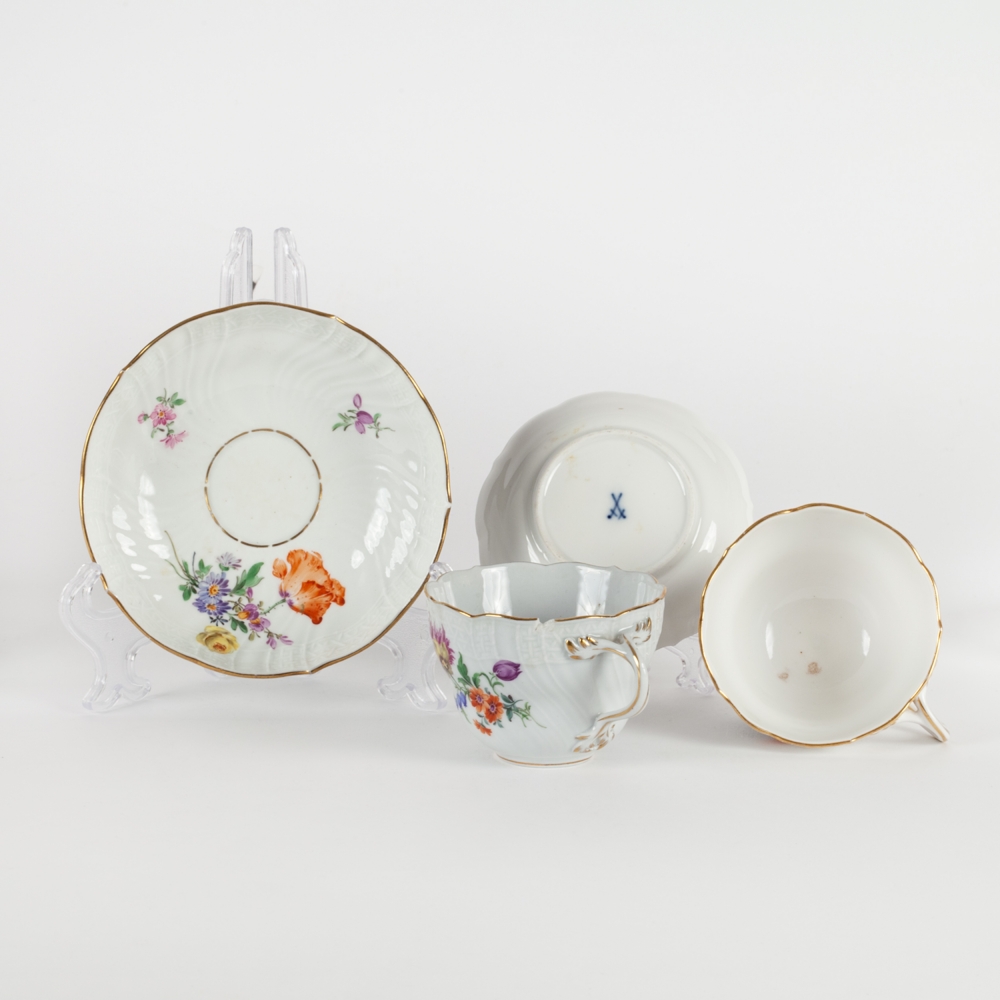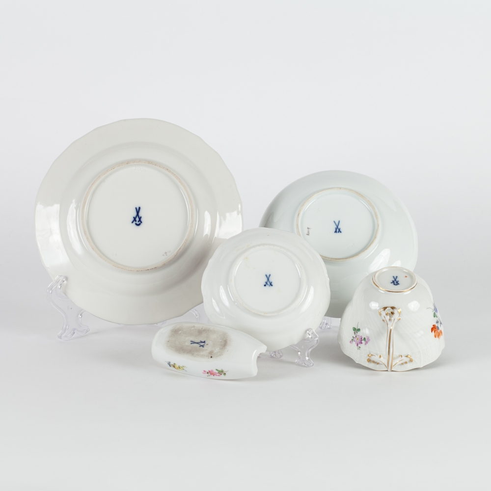 4 чайные пары, 4 десертные тарелки, 2 блюдца фигурной формы, пепельница, лоток и 2 розетки с изображением насекомых и цветов. Фарфор, полихромная надглазурная роспись, форма «Neuer Ausschnitt» (новый вырез краев), рельеф, марка подглазурная кобальтом «скрещенные мечи», Мейсенская фарфоровая мануфактура (Meissen), Германия, первая половина ХХ века, размеры: диаметр тарелок – 18 см, фигурных блюдец – 14,5 см, пепельницы – 11, 8 см; длина лотка – 10 см; высота чайной пары – 7 см