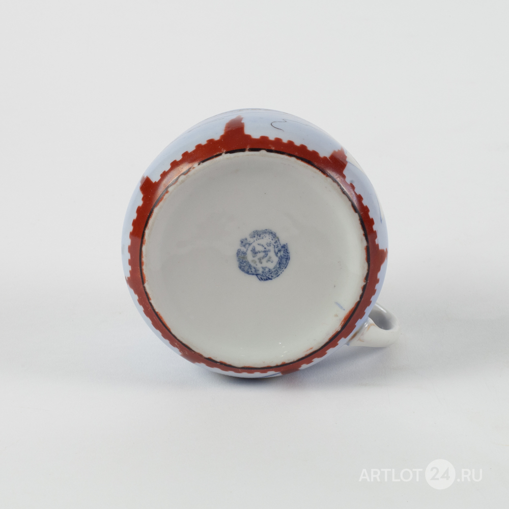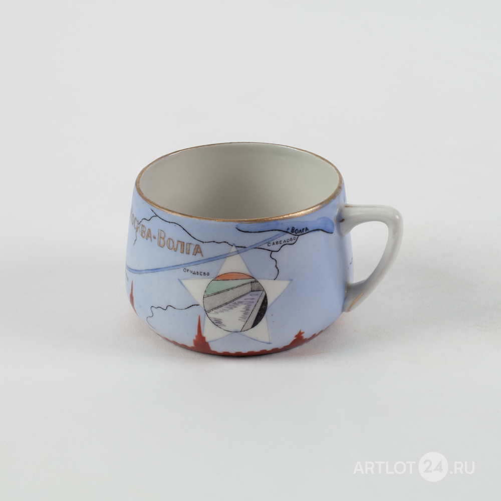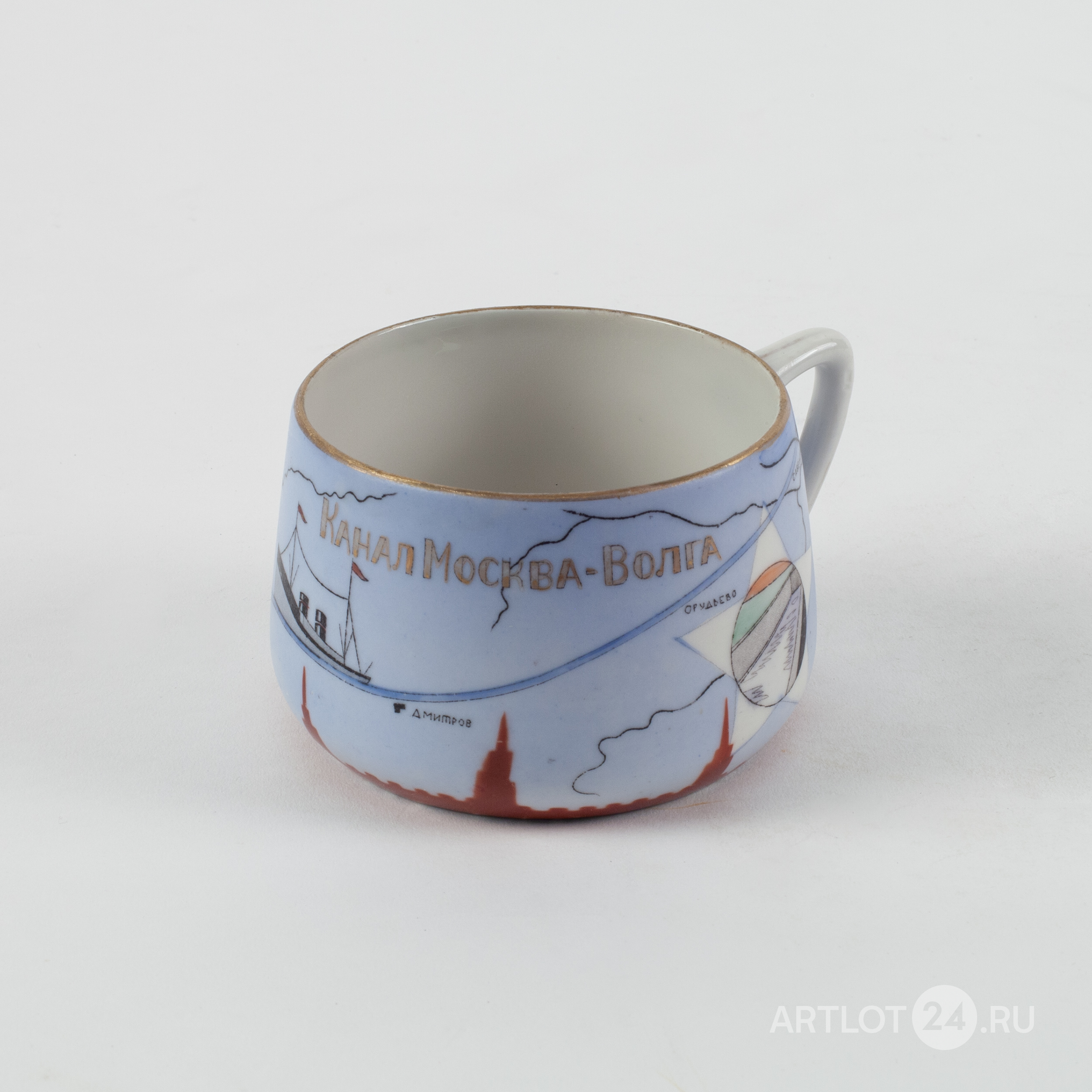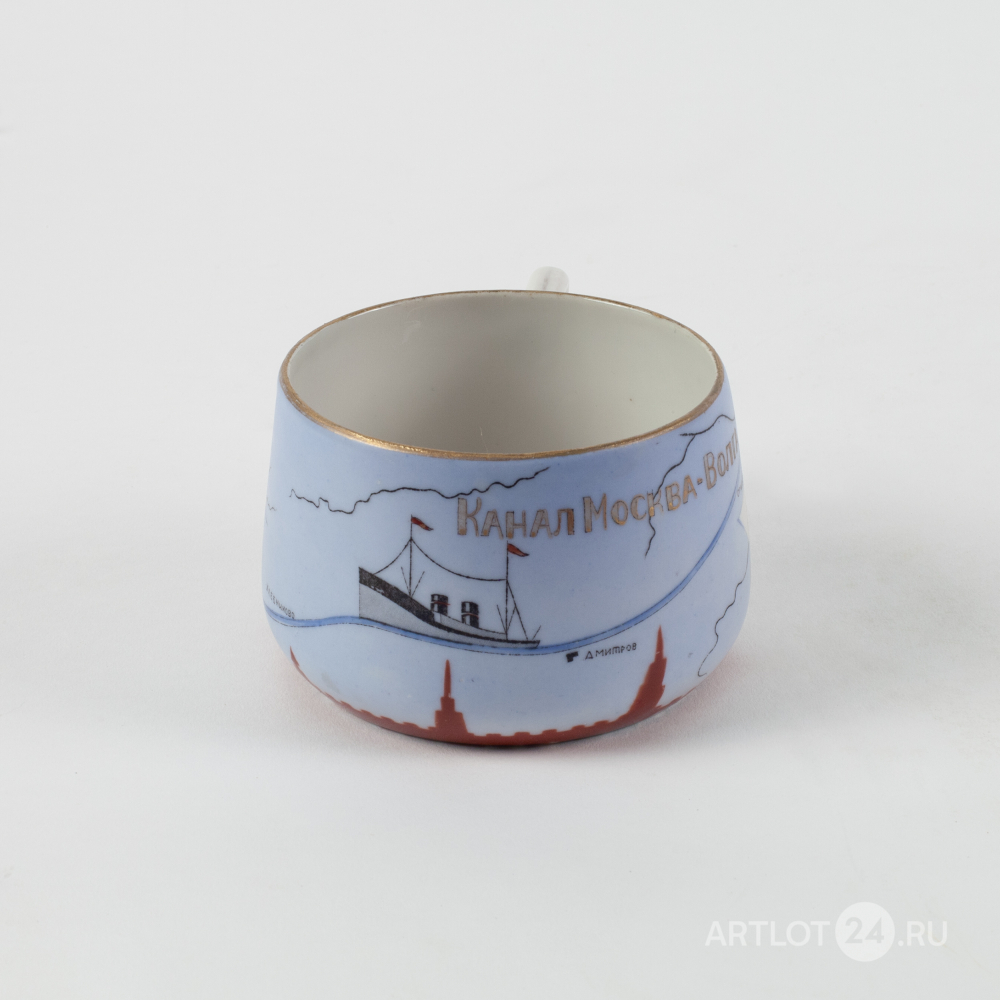 Фарфор, аэрография, надглазурная роспись и деколь с подрисовкой, золочение, художник Иван Михайлович Харитонов (1892–1969), клеймо печатное синее надглазурное Дмитровского фарфорового завода в Вербилках, 1932-1934 годы, диаметр чашки – 9 см, высота – 6,9 см