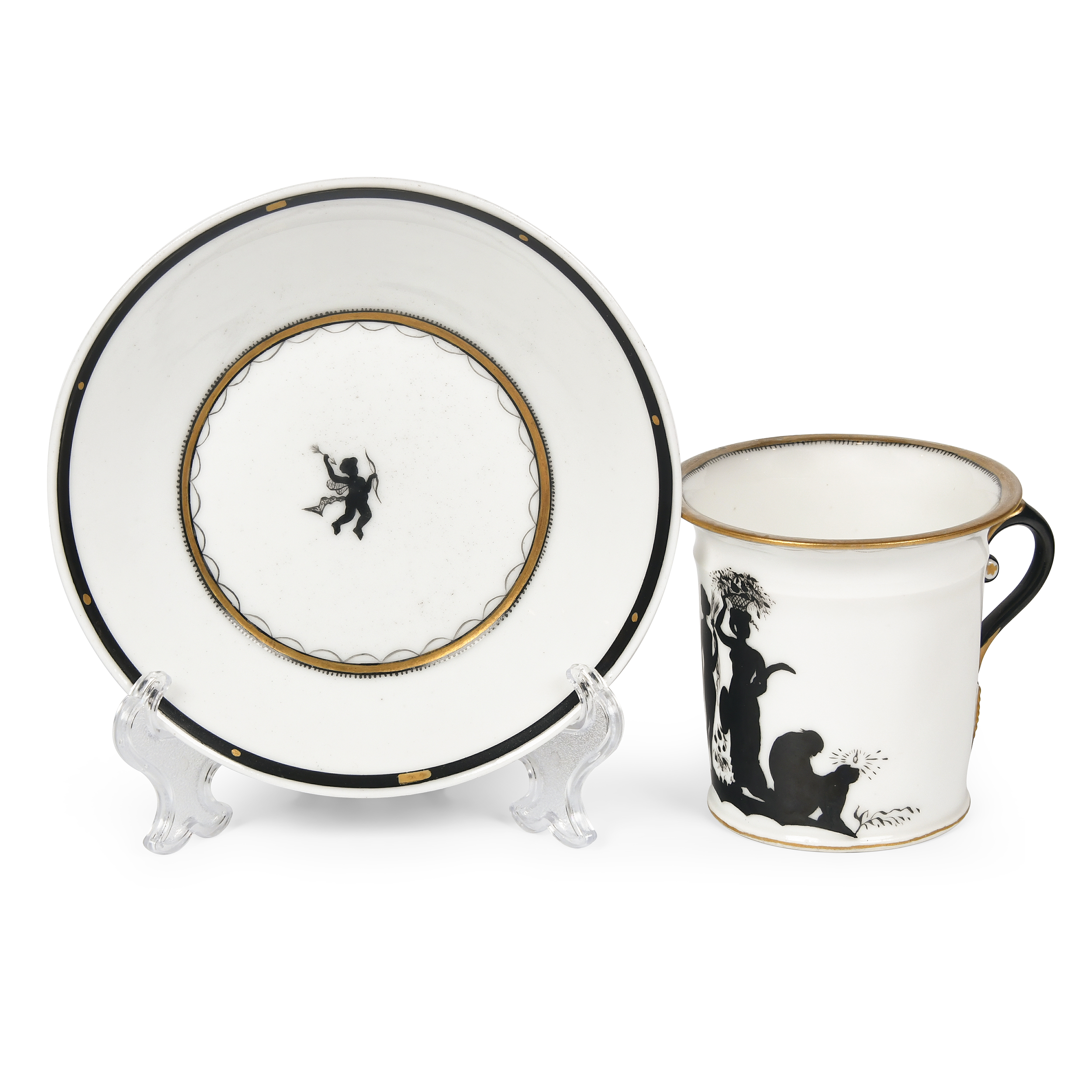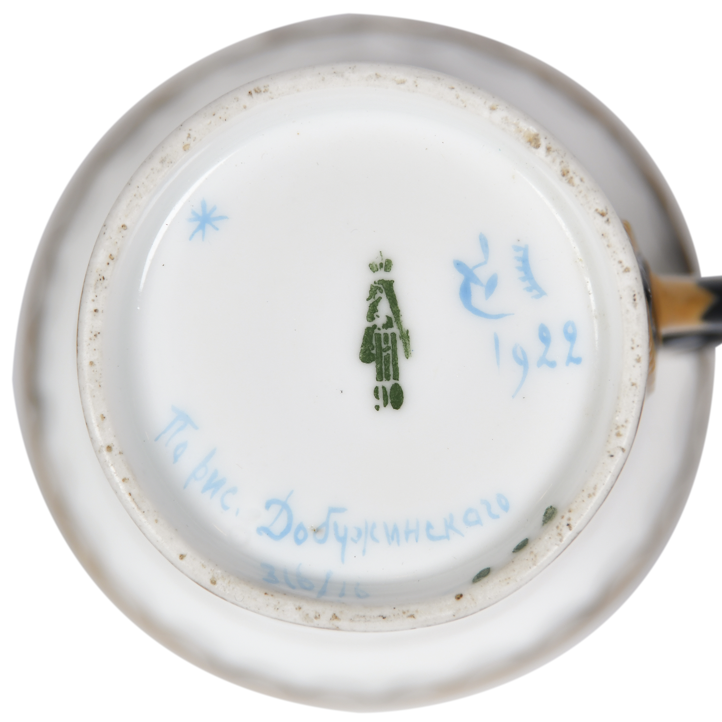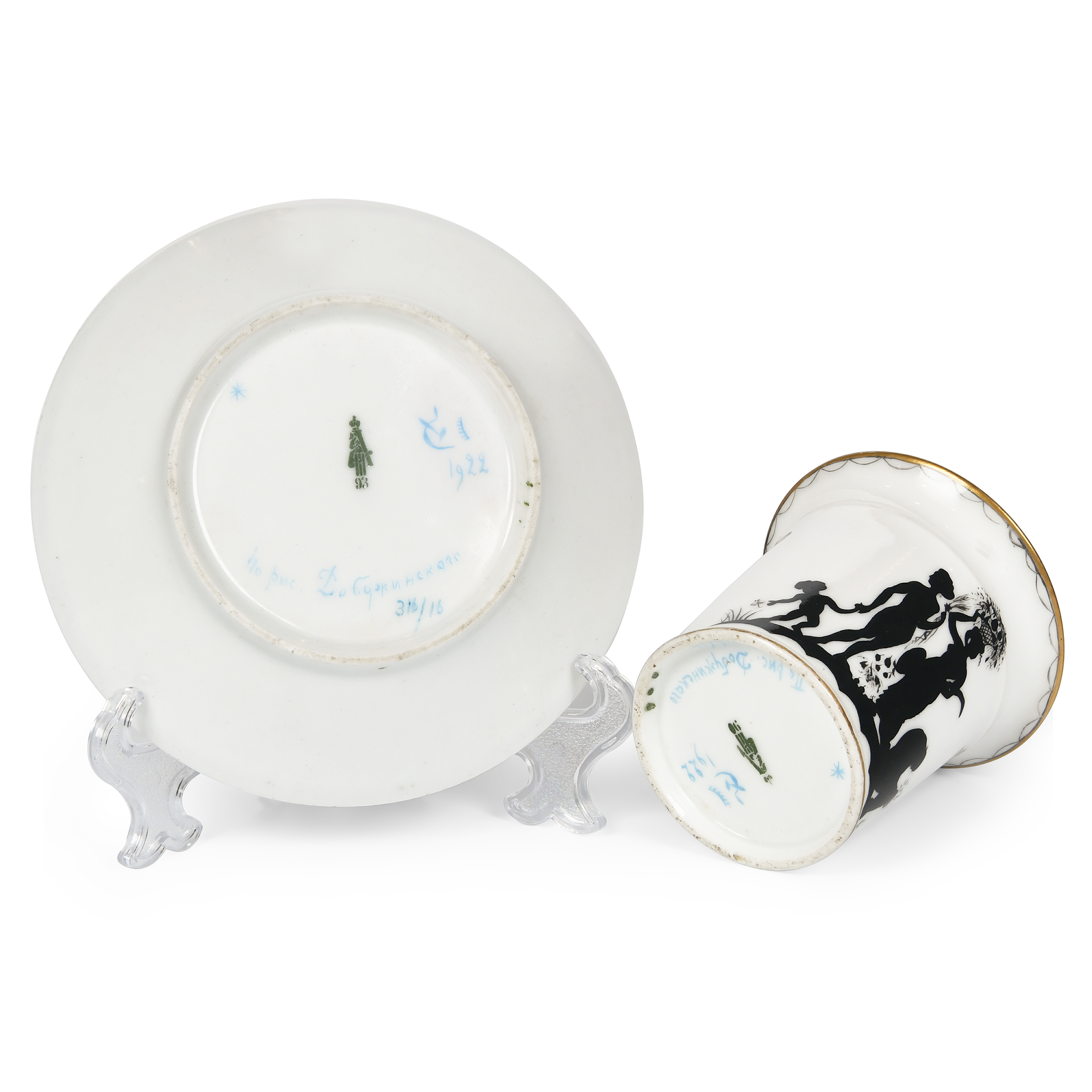 Фарфор, надглазурная монохромная роспись, золочение, цировка; марка зеленая подглазурная «А III 90» на чашке и «А III 93» на блюдце под императорской короной, синяя надглазурная от руки «серп, молот и часть шестерни» с указанием «1922» и надписью «По рис. Добужинскаго// 316/16», белье ИФЗ, автор росписи М. Б. Добужинский, роспись Е. Н. Потаповой; Россия. Высота чашки - 7 см, диаметр - 7,5 см, диаметр блюдца - 13,2 см.
