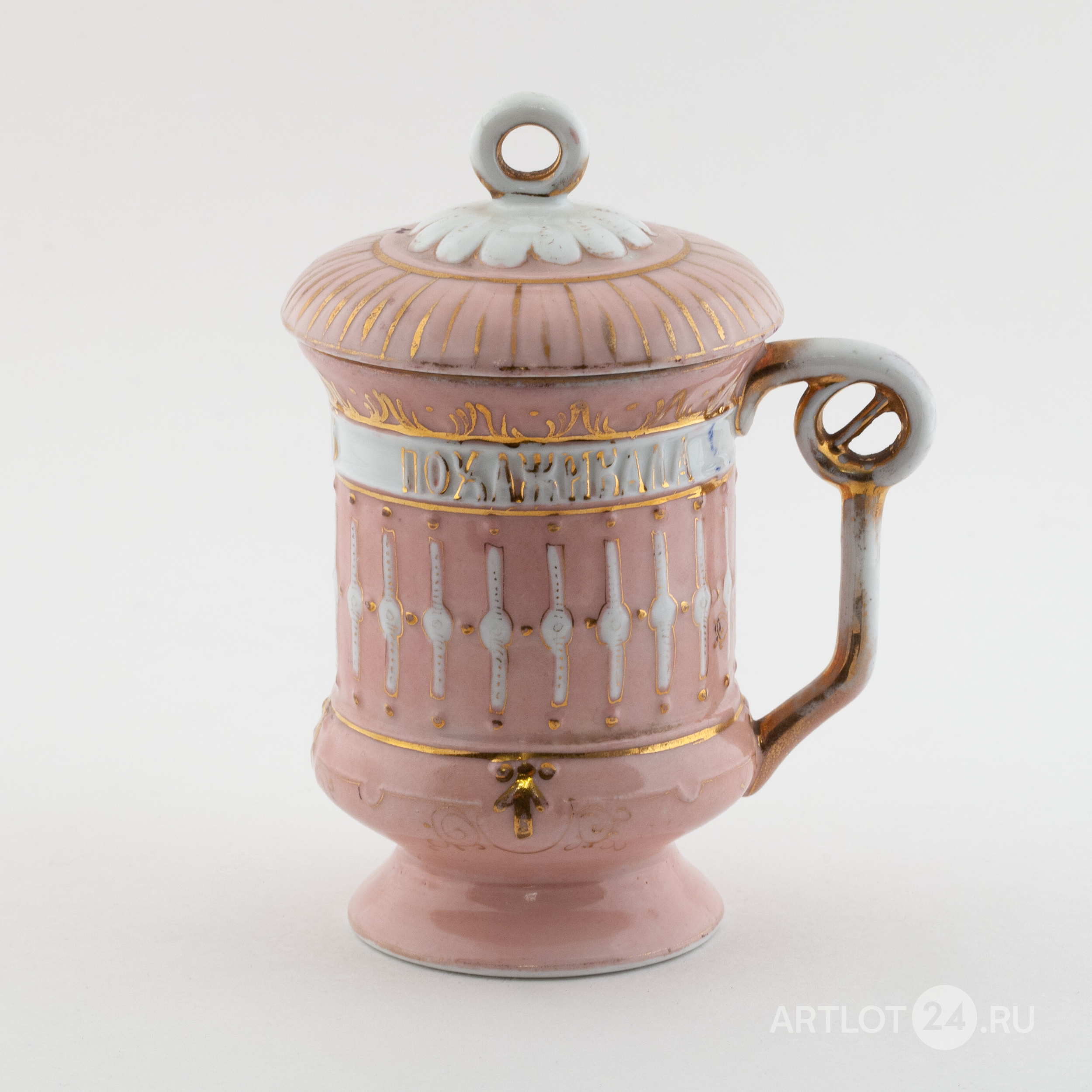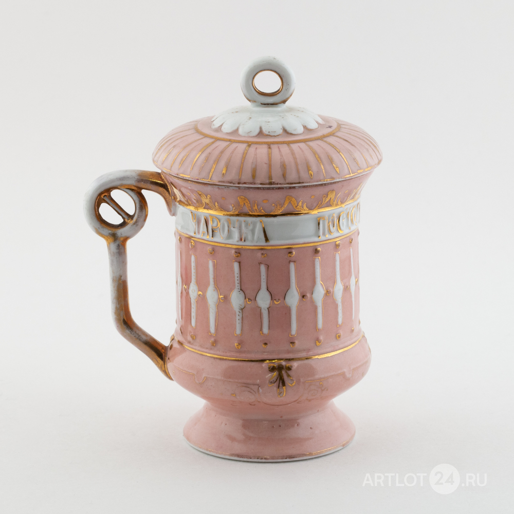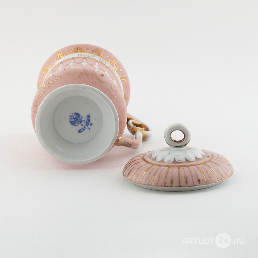 Фарфор, рельеф, лепка, монохромное крытье, золочение. Марка кобальтом печатно: «Т-ва М.С. Кузнецова Д.Ф» под двуглавым орлом, Россия, завод товарищества М.С. Кузнецова, 1892-1917 гг. Размер: высота - 11,5 см, ширина с ручкой - 12 см, диаметр горлышка - 8,