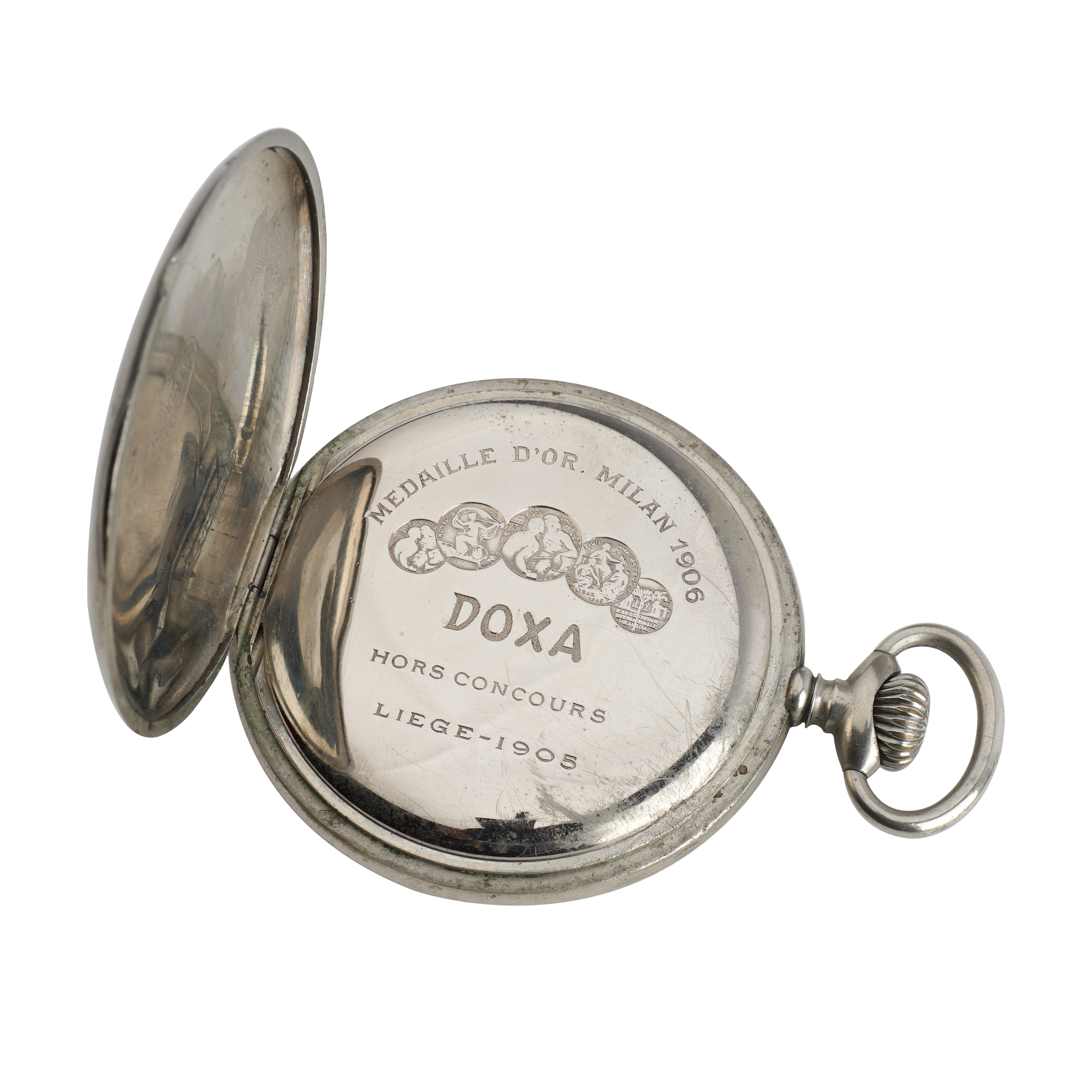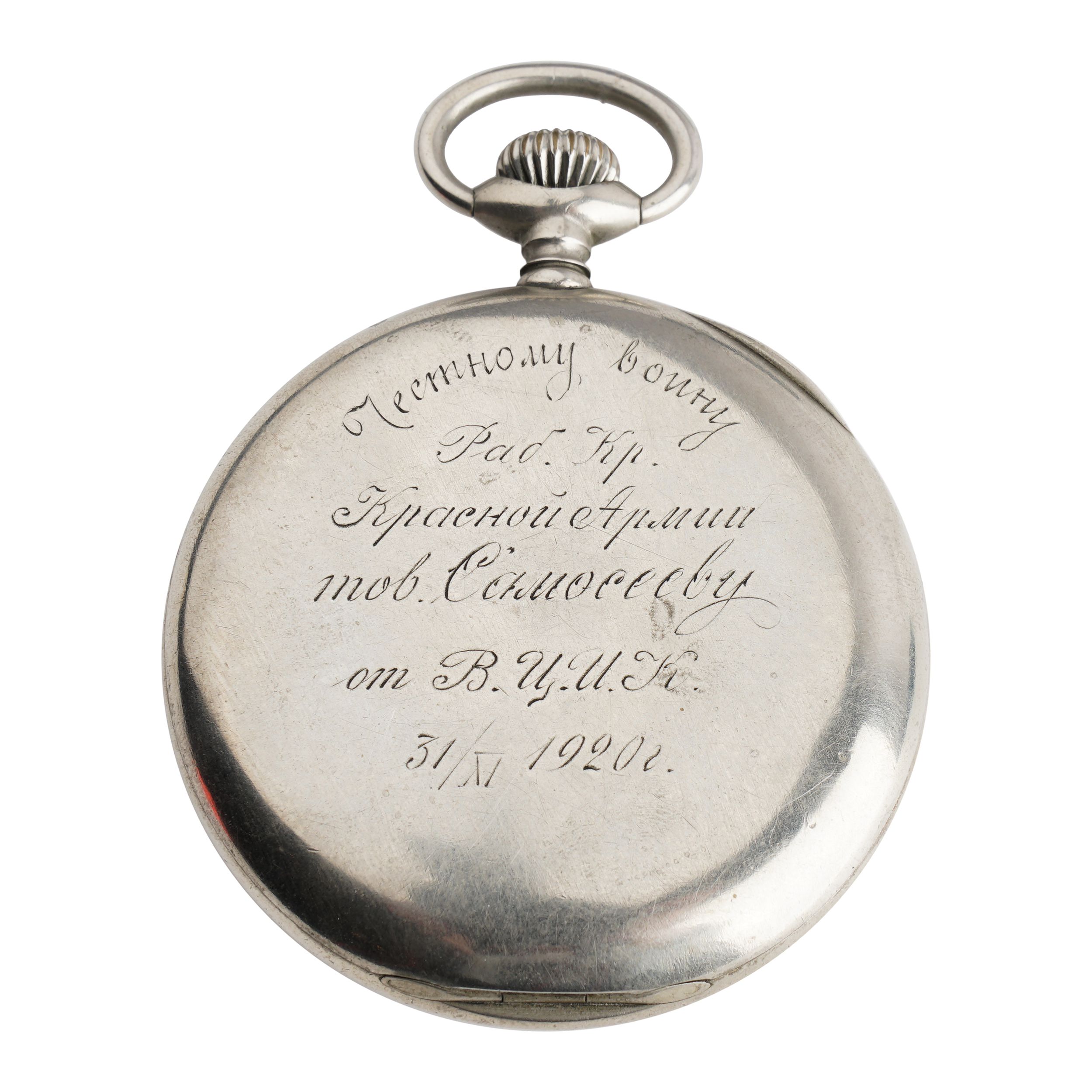 Металл, эмаль, гравировка, тип корпуса "мыло", ремонтуар. На задней крышке гравированная надпись "Стойкому бойцу особой Краснознаменной Дальне-Восточной Армии т. Чекризову А.Ф. от РВС СССР" Doxa, Швейцария, начало ХХ века, размер - 50 мм