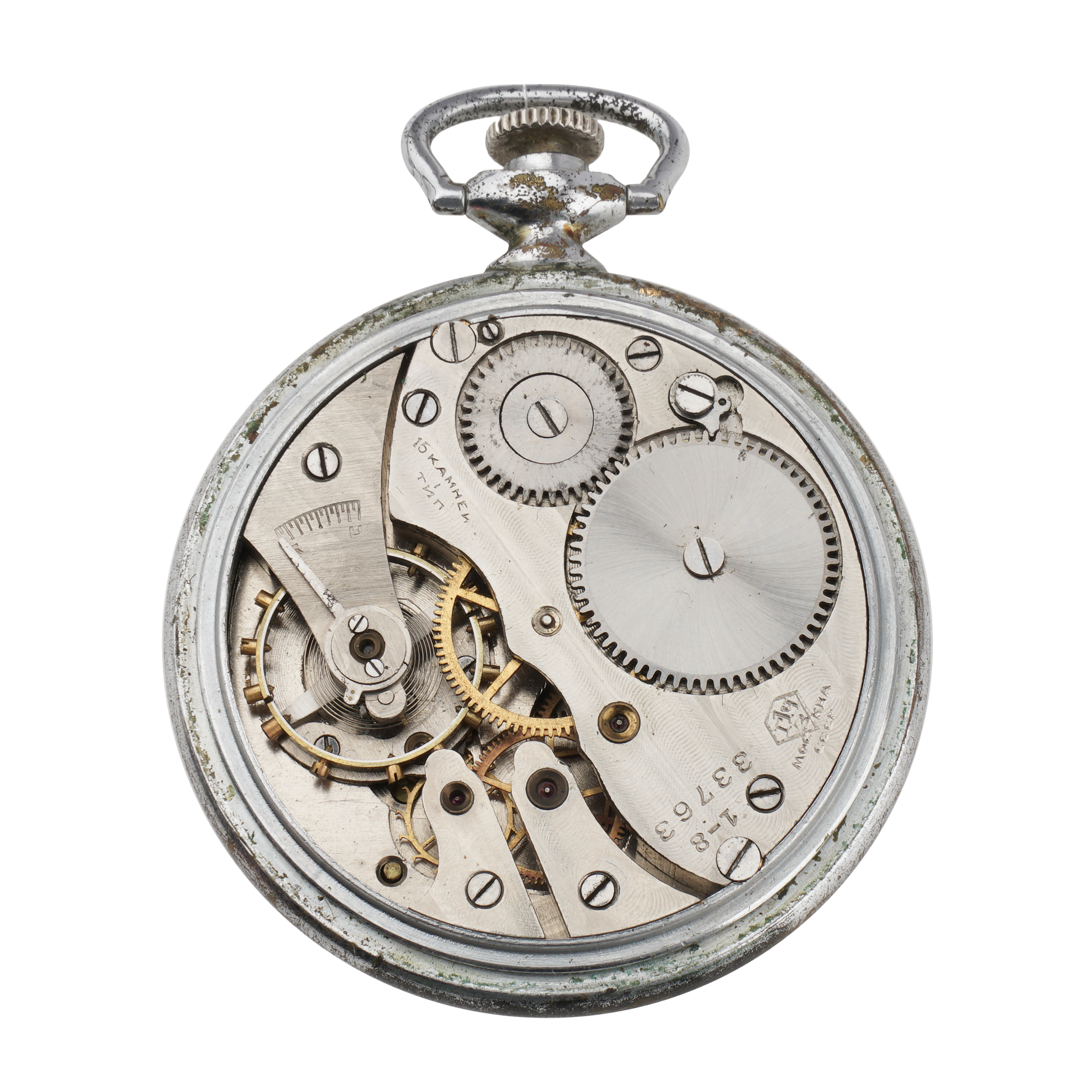 Никель, эмаль, гравировка, тип корпуса "мыло", ремонтуар. на задней крышке гравированная надпись "За отличное окончание ЦШ РКМ Мл. лейтенанту Милиции т.Шеф Г.К. от НКВД СССР 1938 г." 1-ГОСЧАСЗАВОД им. Кирова, Москва, 1935-1941 гг., размер - 50 мм