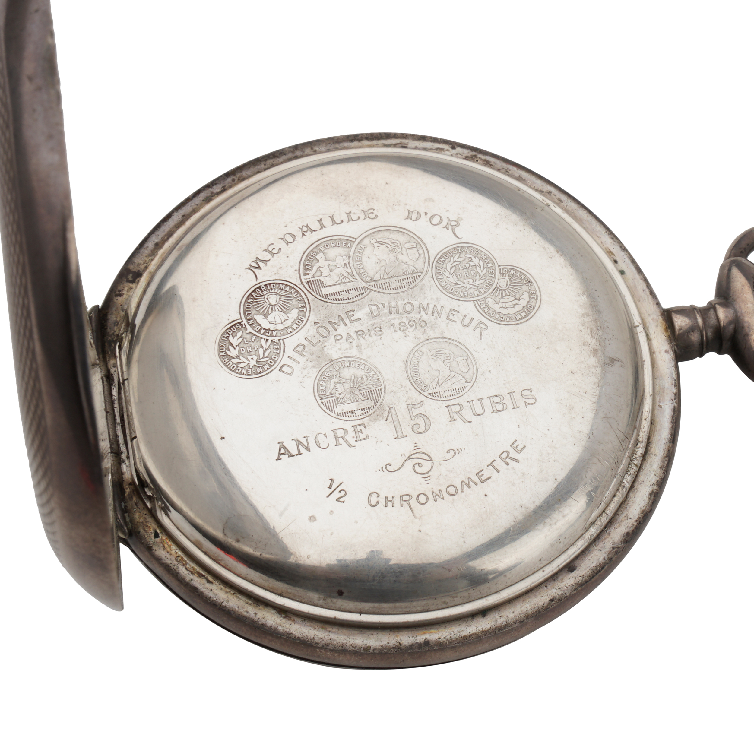 Серебро (84 проба), штамп, эмаль, гильоше, тип корпуса "мыло", ремонтуар. Гравированная надпись на внутренней стороне крышки "За охоту съ Государемъ 19го Сентября 1905 года Маш.Квар. 1 ст. К. Быценко". Швейцария, фирма "Pegasus", 1910-е годы, размер - 59 мм в диаметре, вес ± 130 грамм.