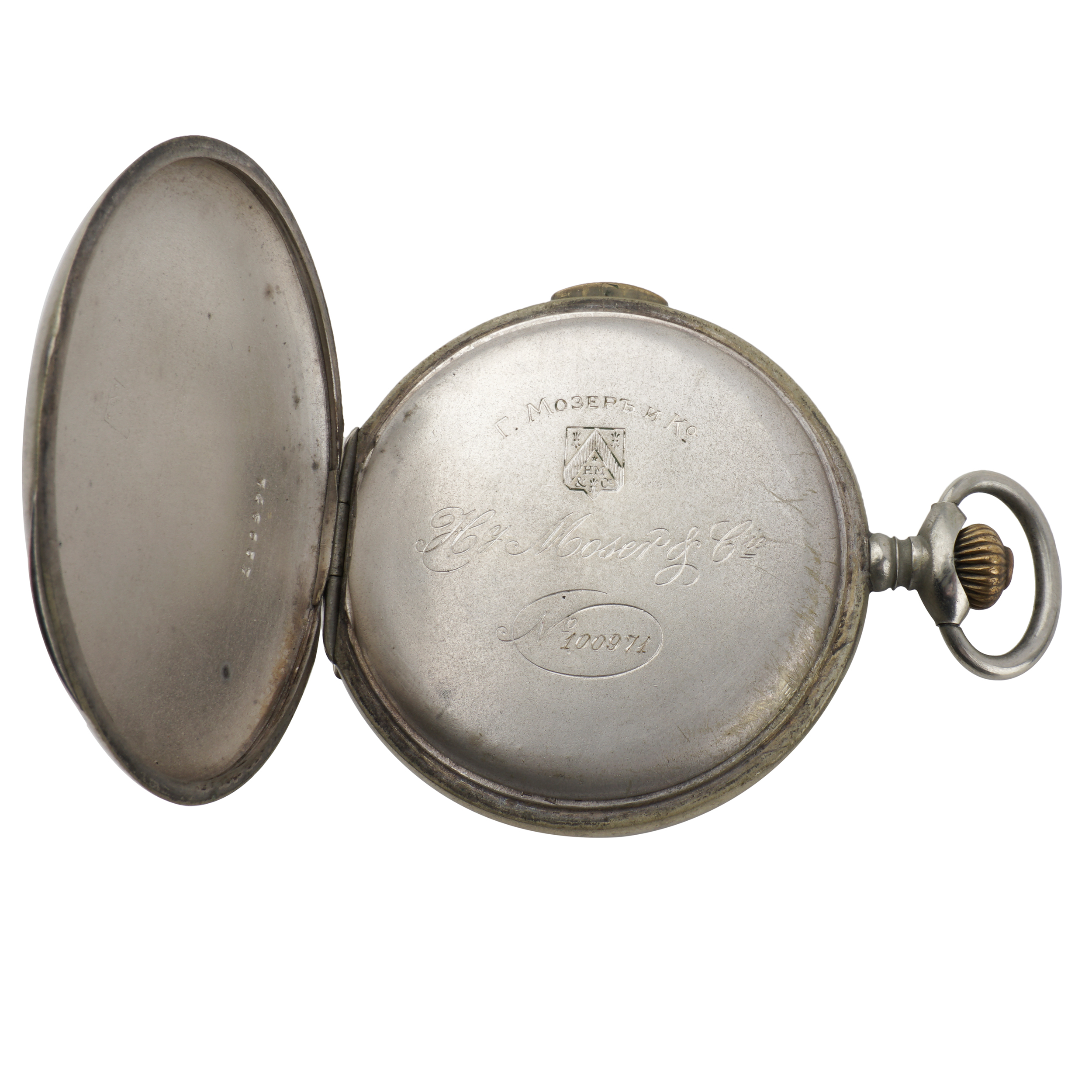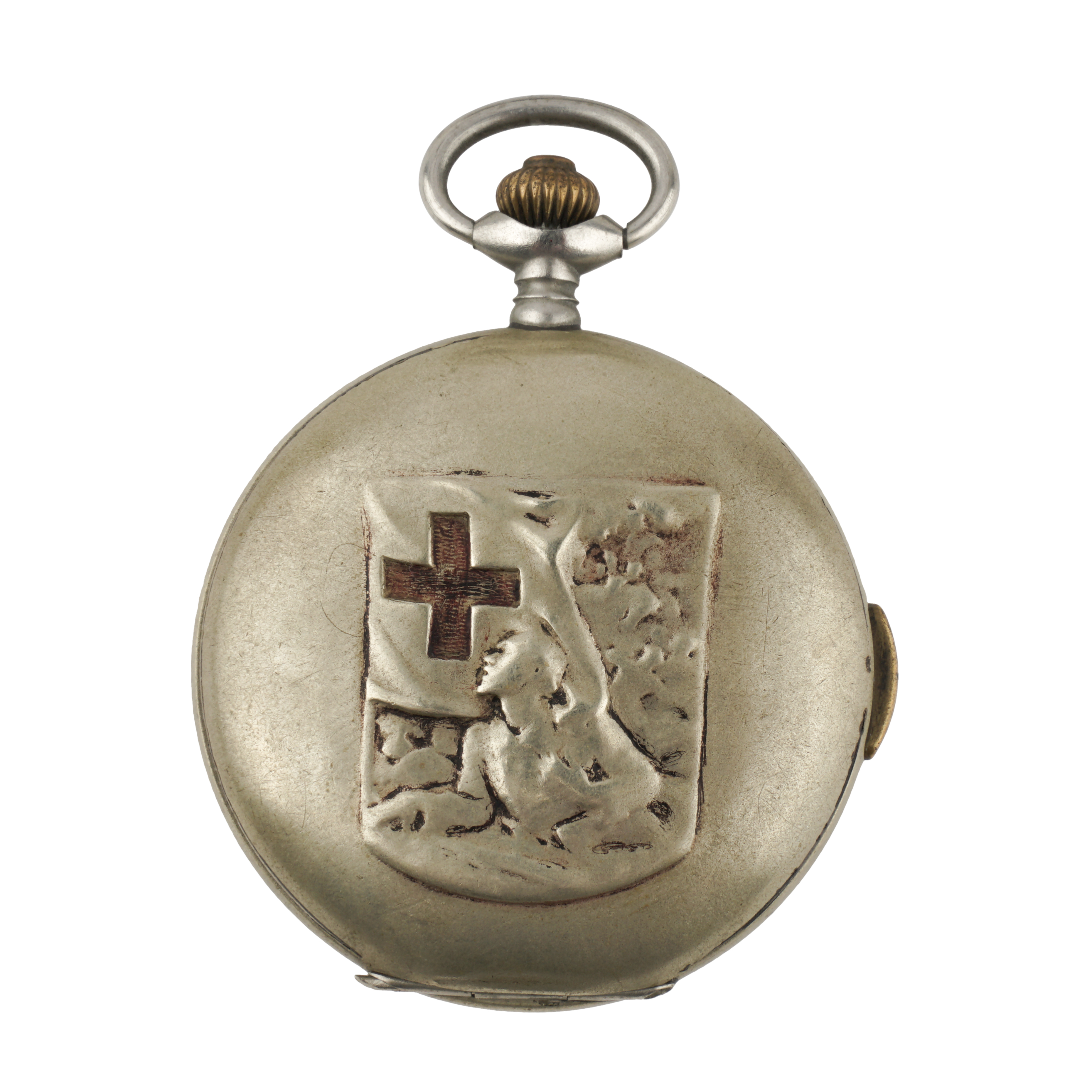 Часы закрытого типа (трёхкрышечные). Серебро, штамп, гравировка, тип корпуса «мыло», ремонтуар. На верхней крышке штампованное выпуклое изображение раненого воина на поле сражения, слева вверху за его головой - знамя с красным крестом, Россия, торговый дом «Генрих Мозер и К», конец 1916 - начало 1917 года, размер - 54 мм, вес ± 115 грамм