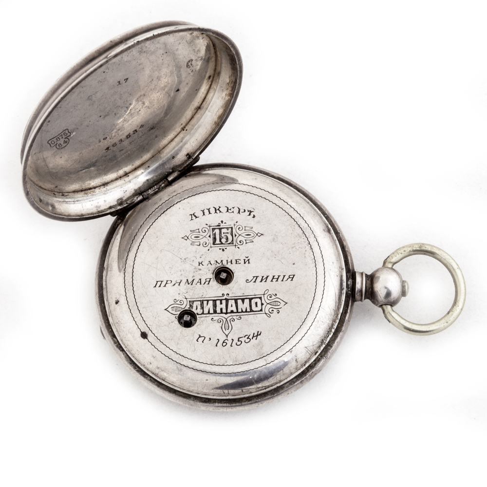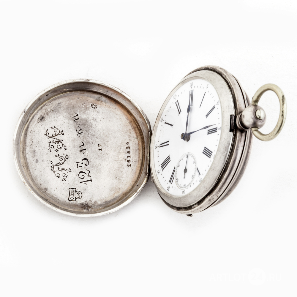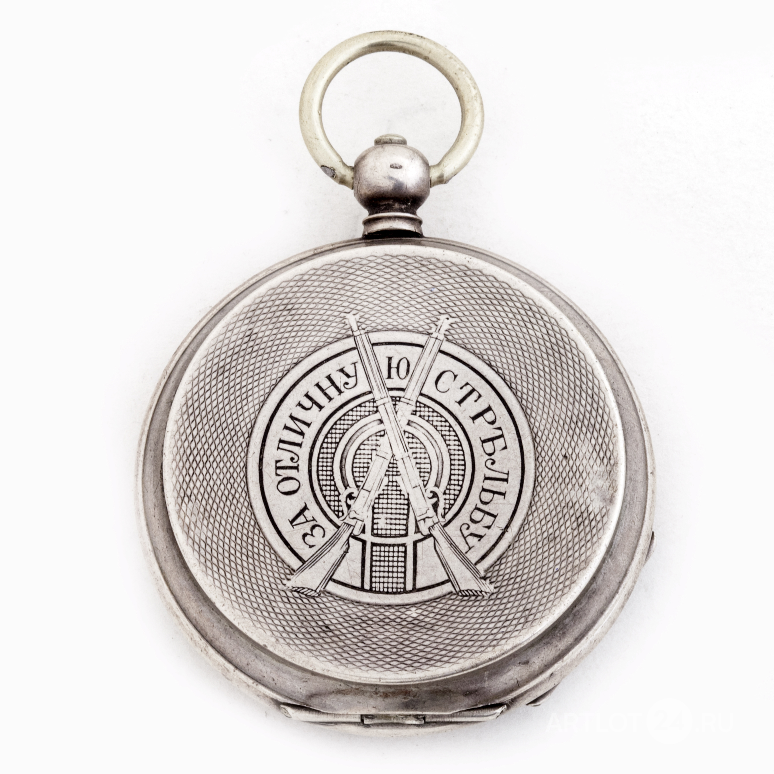 Белый металл (84 проба), штамп, гильоше, тип корпуса "барабан", завод ключом. На верхней крышке штампованное изображение скрещенных винтовок на фоне мишени и надпись "ЗА ОТЛИЧНУЮ СТРЕЛЬБУ", гравированная надпись на внутренней стороне крышки "П.И. 123 п.к.