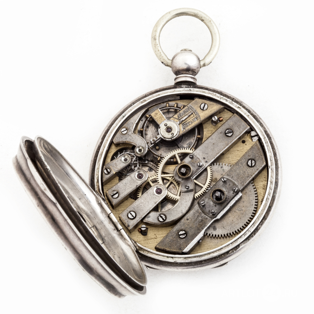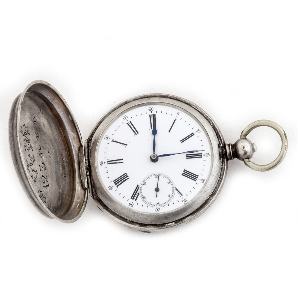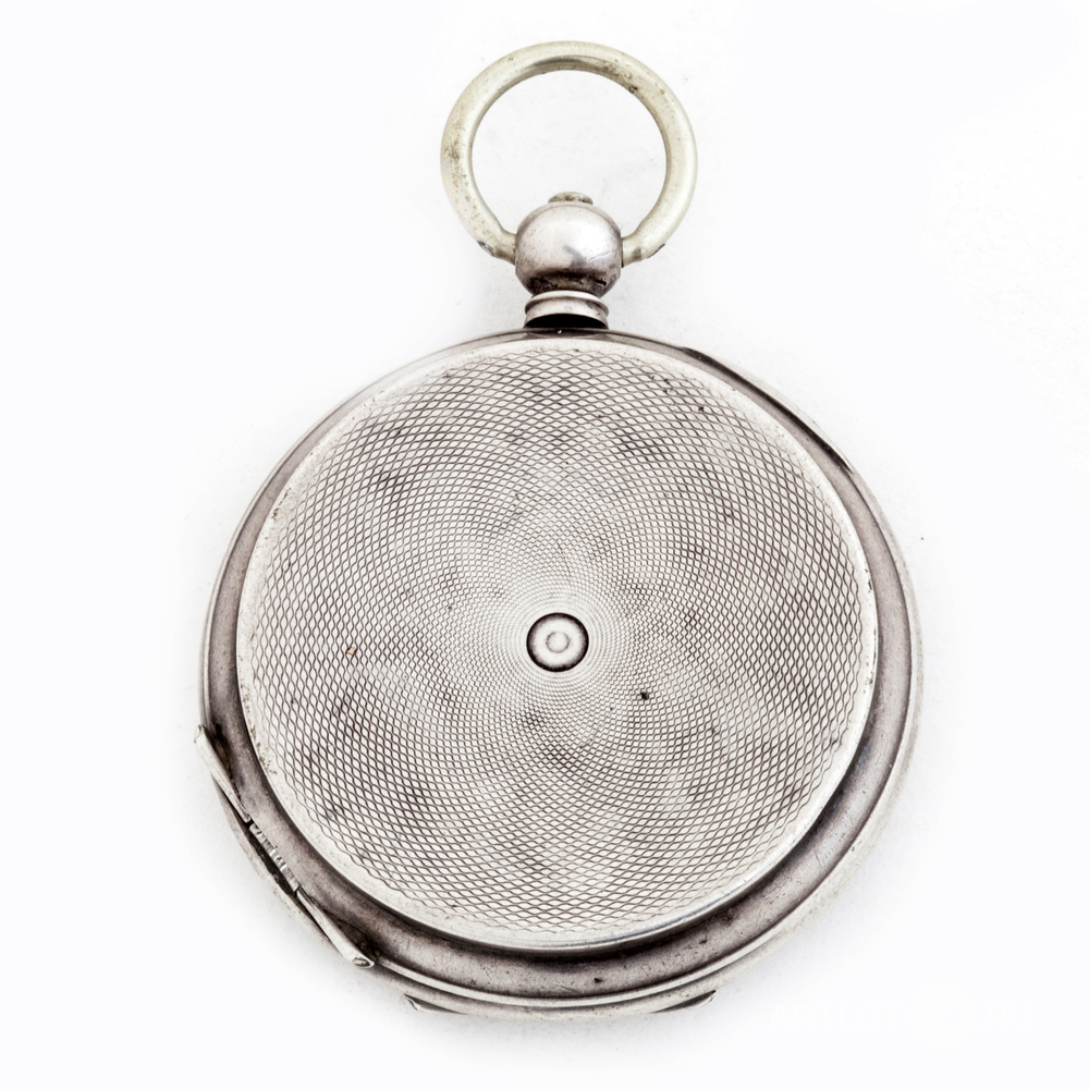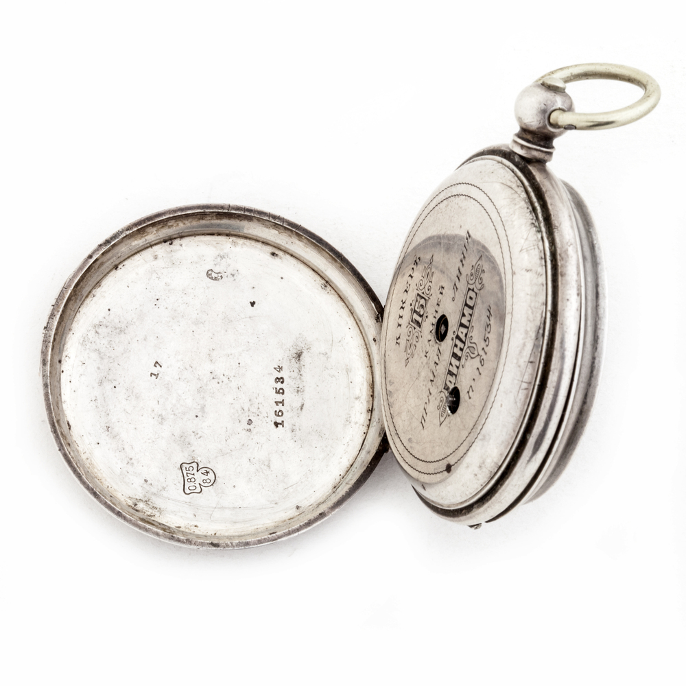 Белый металл (84 проба), штамп, гильоше, тип корпуса "барабан", завод ключом. На верхней крышке штампованное изображение скрещенных винтовок на фоне мишени и надпись "ЗА ОТЛИЧНУЮ СТРЕЛЬБУ", гравированная надпись на внутренней стороне крышки "П.И. 123 п.к.