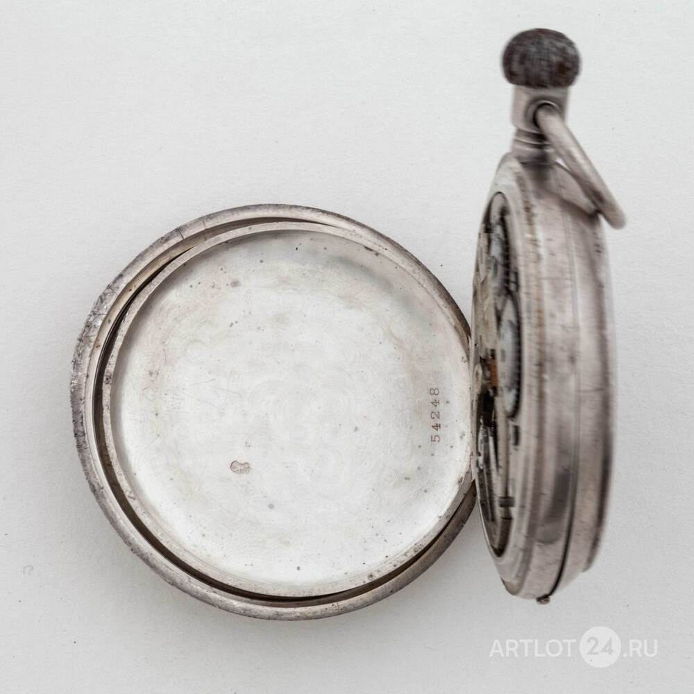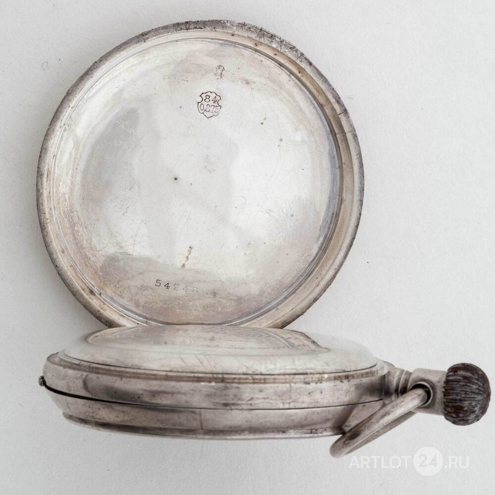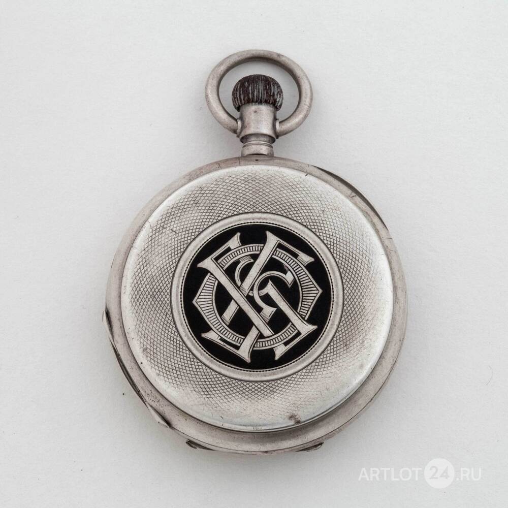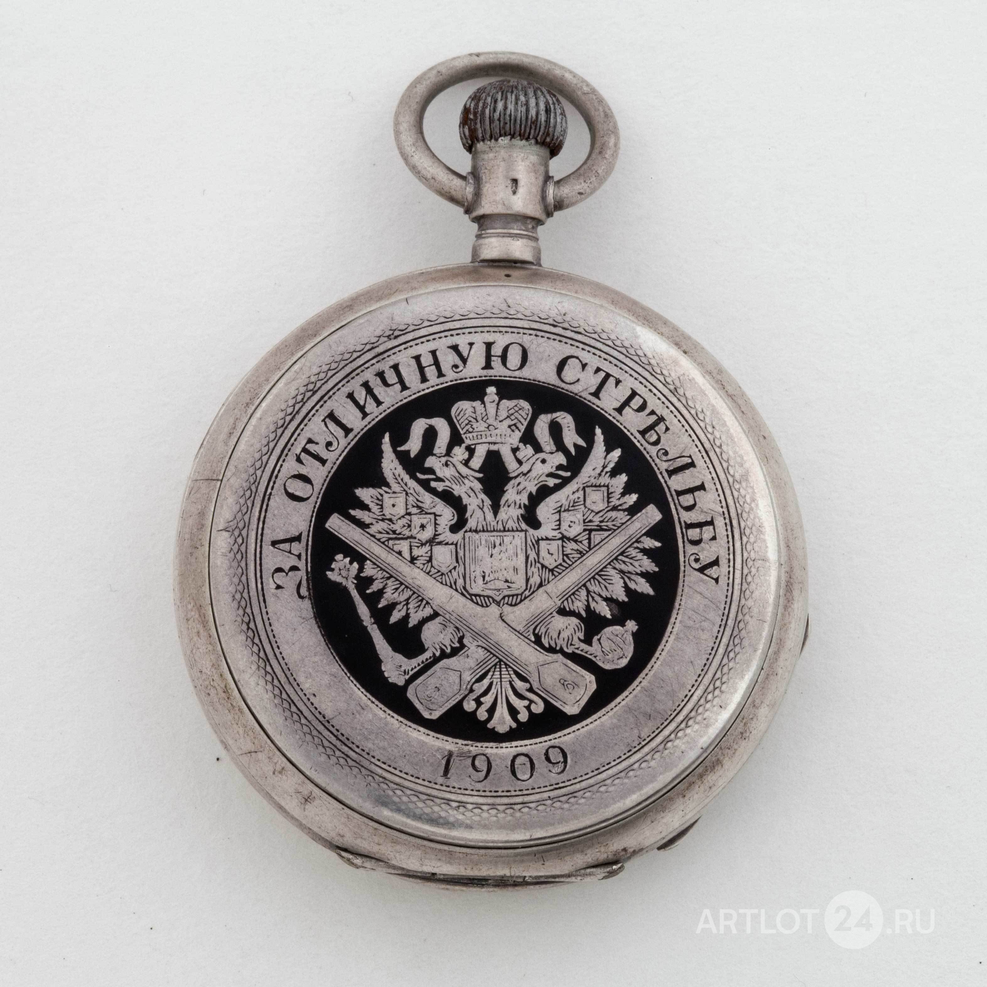 Белый металл (84 проба), штамп, чернение, гильоше, тип корпуса "барабан", ремонтуар. На верхней крышке штампованное изображение перекрещенных пушек на фоне государственного герба, надпись "ЗА ОТЛИЧНУЮ СТРЕЛЬБУ 1903", гравированная надпись на внутренней ст