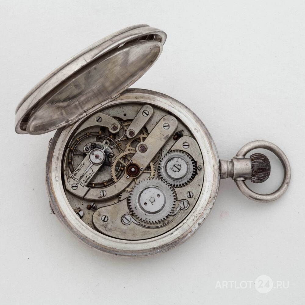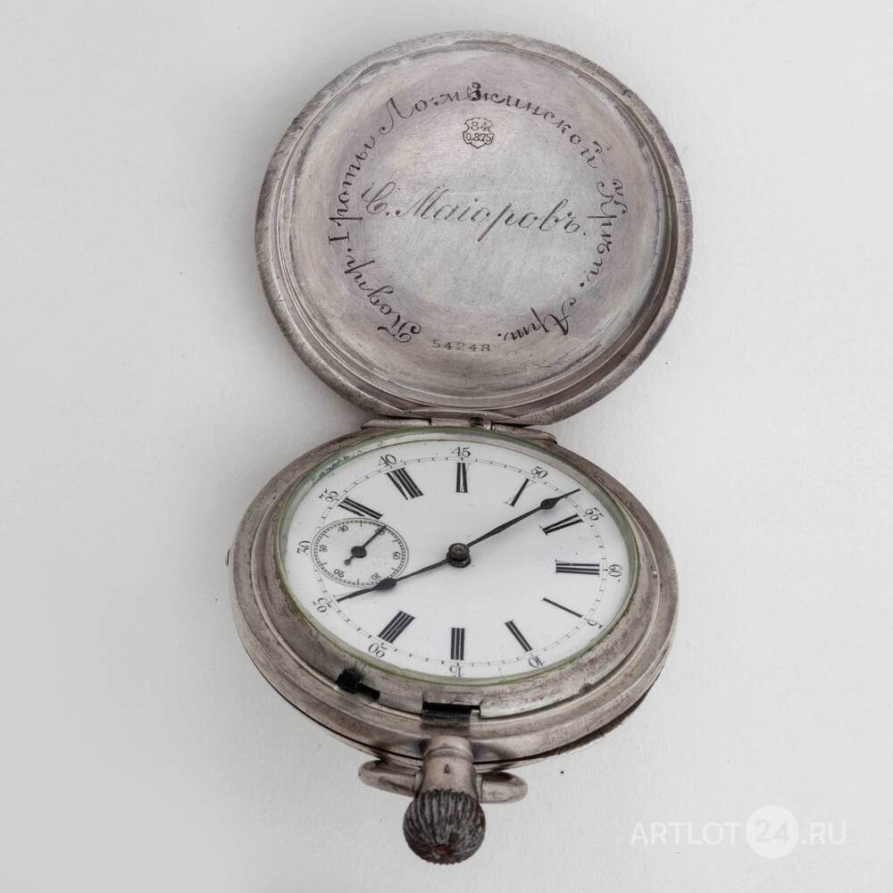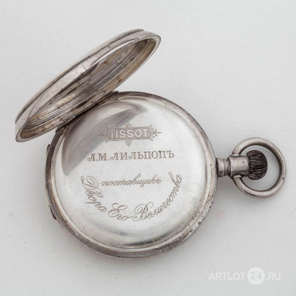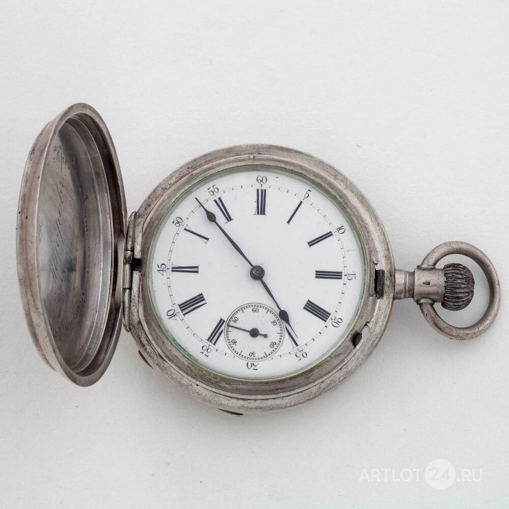 Белый металл (84 проба), штамп, чернение, гильоше, тип корпуса "барабан", ремонтуар. На верхней крышке штампованное изображение перекрещенных пушек на фоне государственного герба, надпись "ЗА ОТЛИЧНУЮ СТРЕЛЬБУ 1903", гравированная надпись на внутренней ст