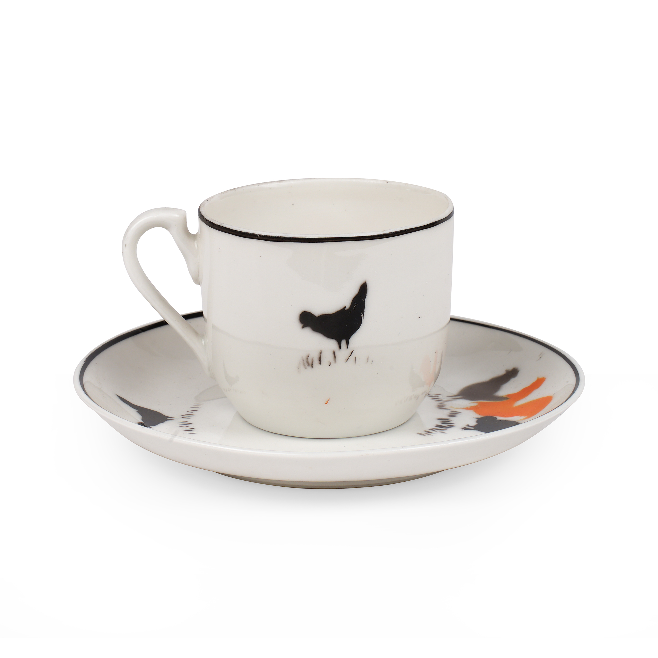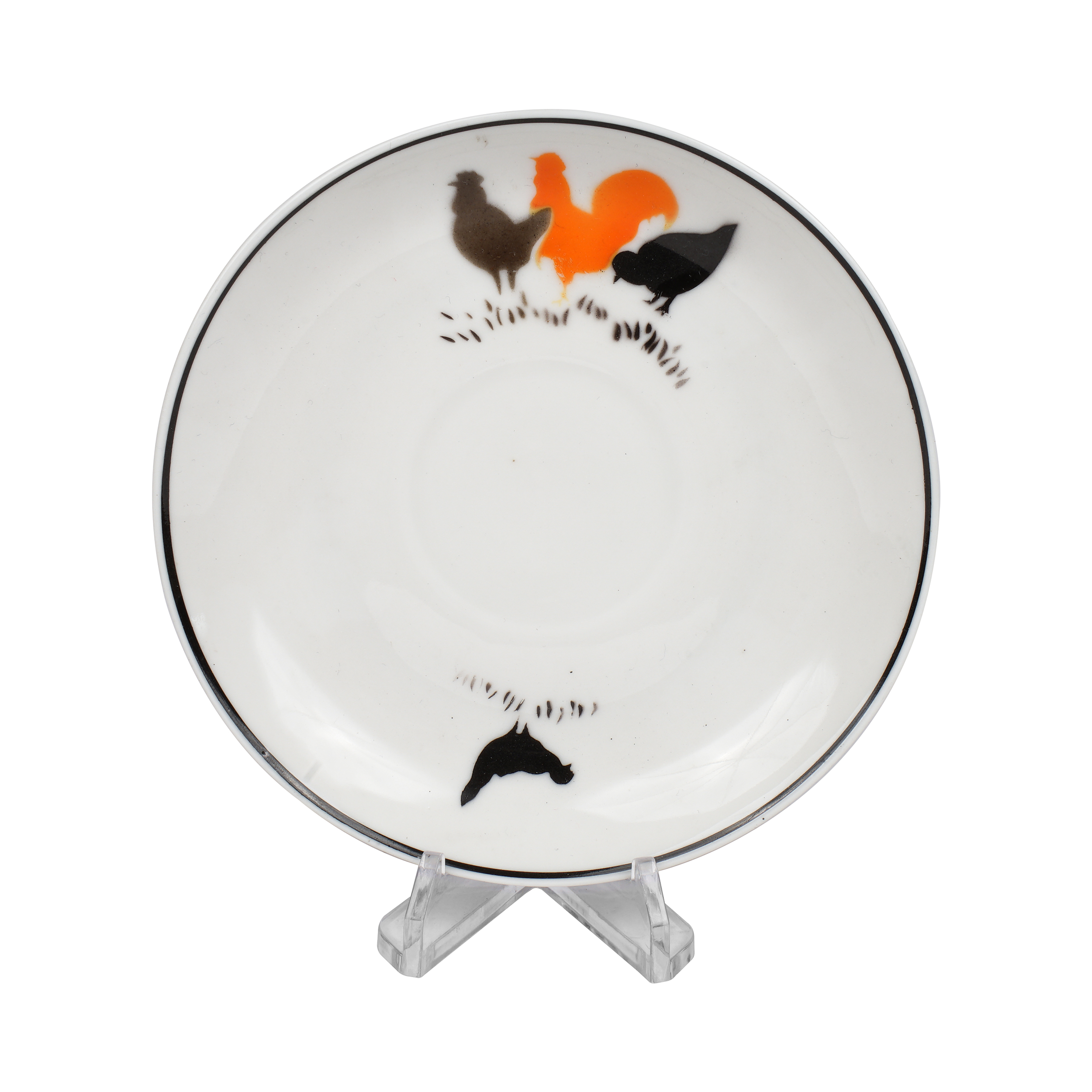 Фарфор, роспись по трафарету, надглазурное красное печатное клеймо Дулёвского фарфорового завода «РСФСР НКМП Фарфор з-д Дулево Сорт 2», СССР, 1937-1947 годы, высота – 6 см, диаметр блюдца – 13 см