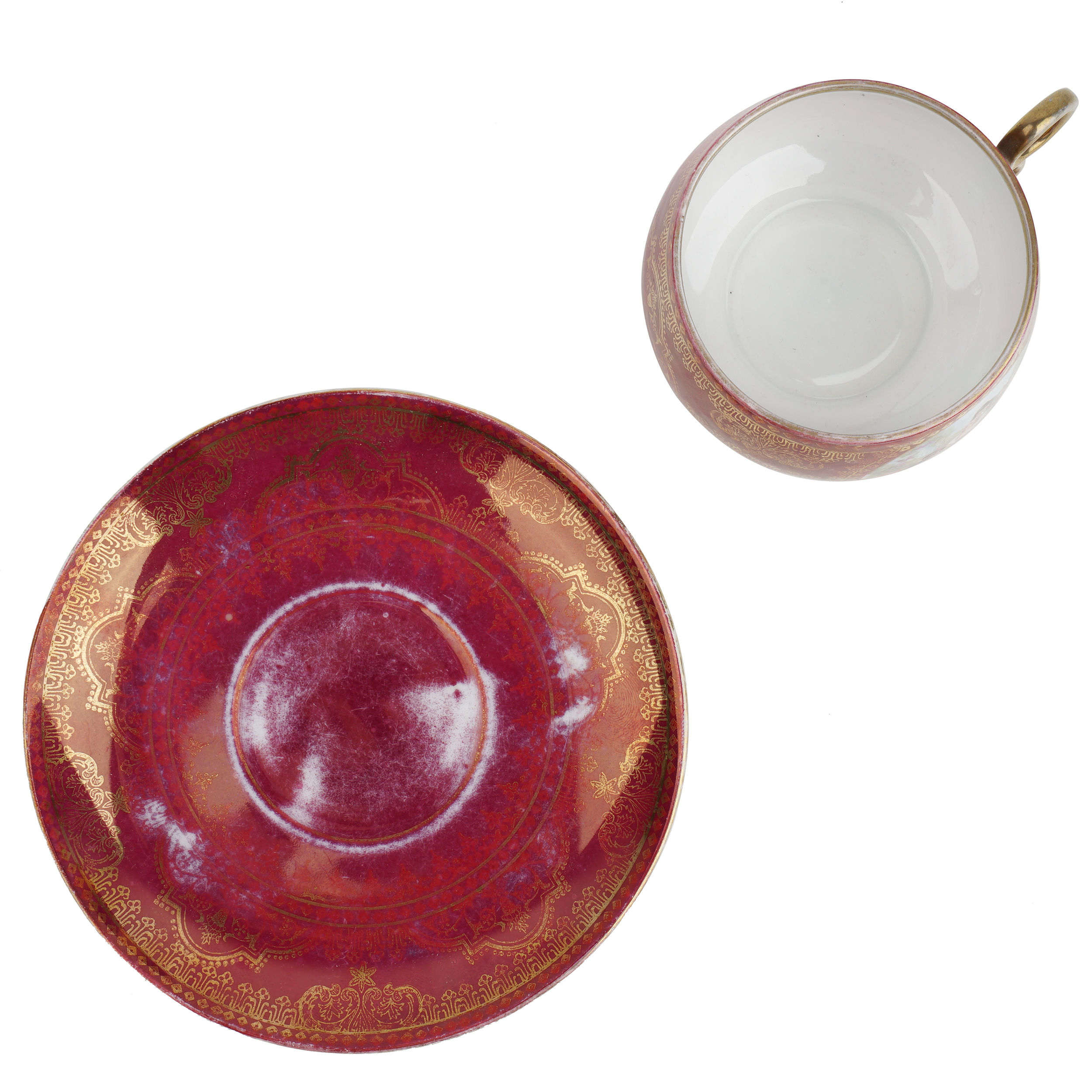Марки: зеленым на чашке: Comte Harrach; на блюдце: синим: щит