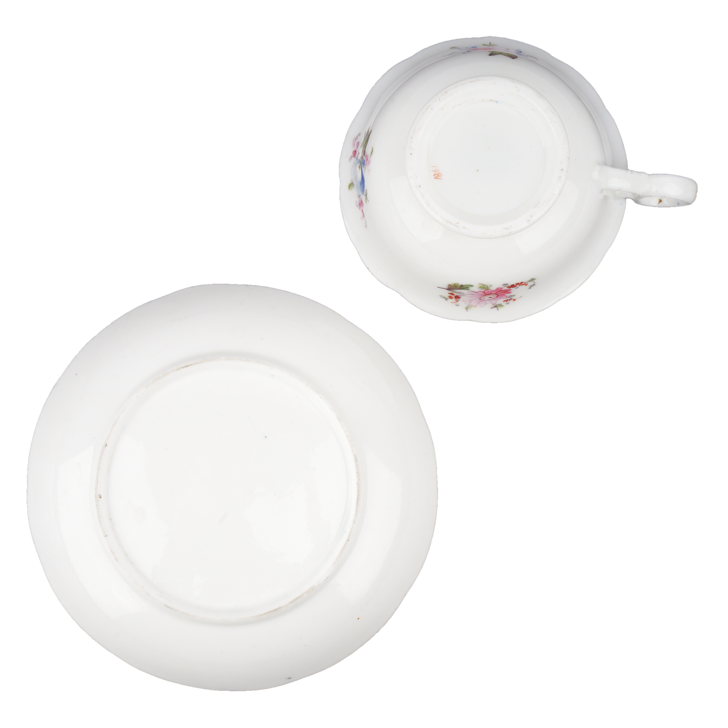 Фарфор, рельеф, синее монохромное крытье, надглазурная полихромная роспись, золочение, Европа (предположительно Англия) XIX век. Размеры: высота – 5 см, диаметр чашки – 10,5 см, блюдца – 14,8 см.