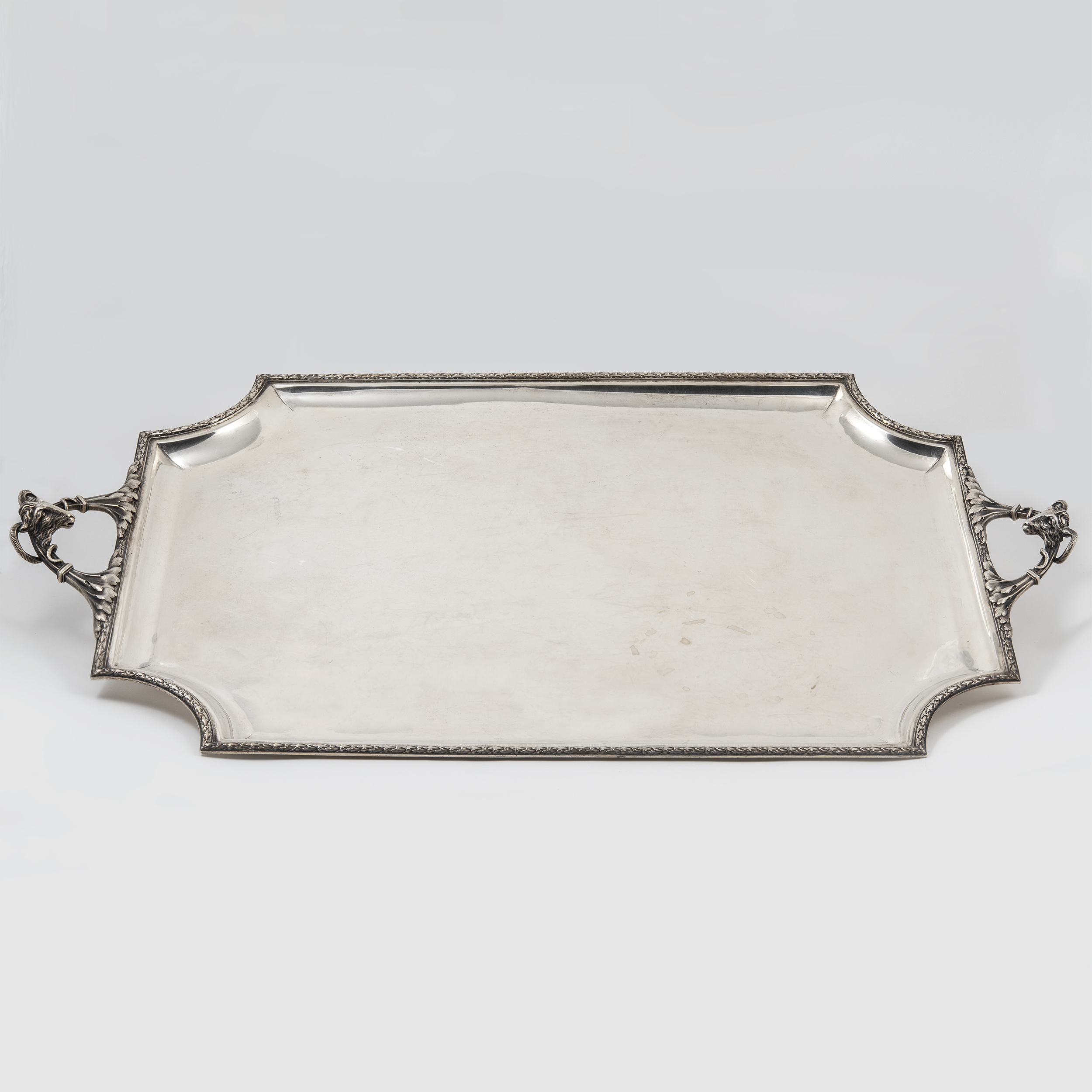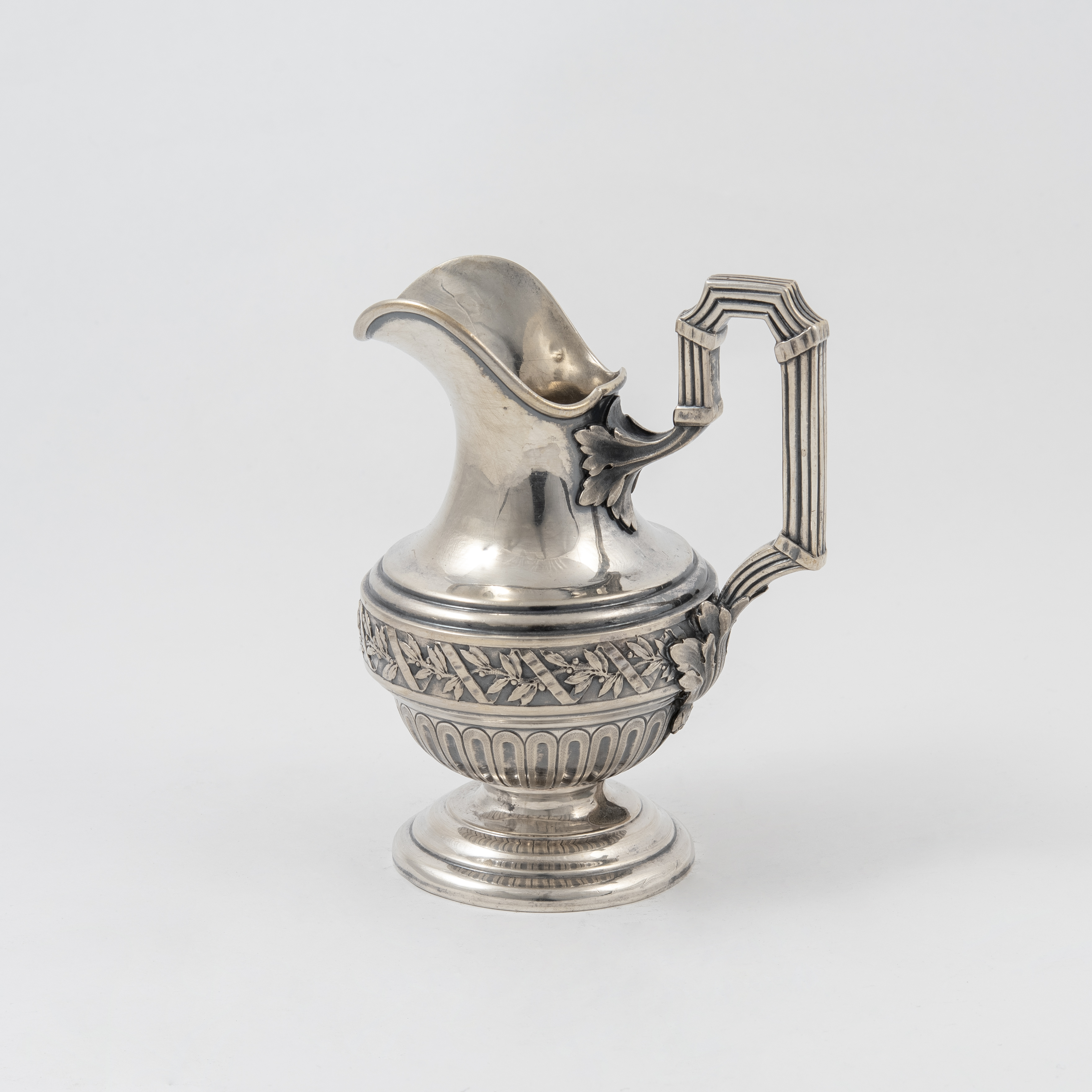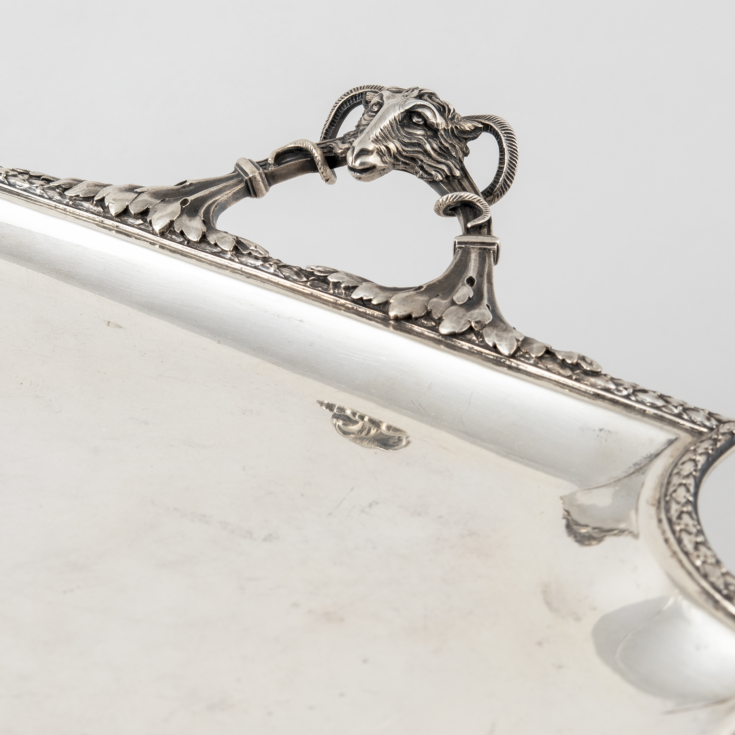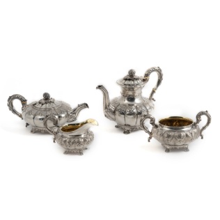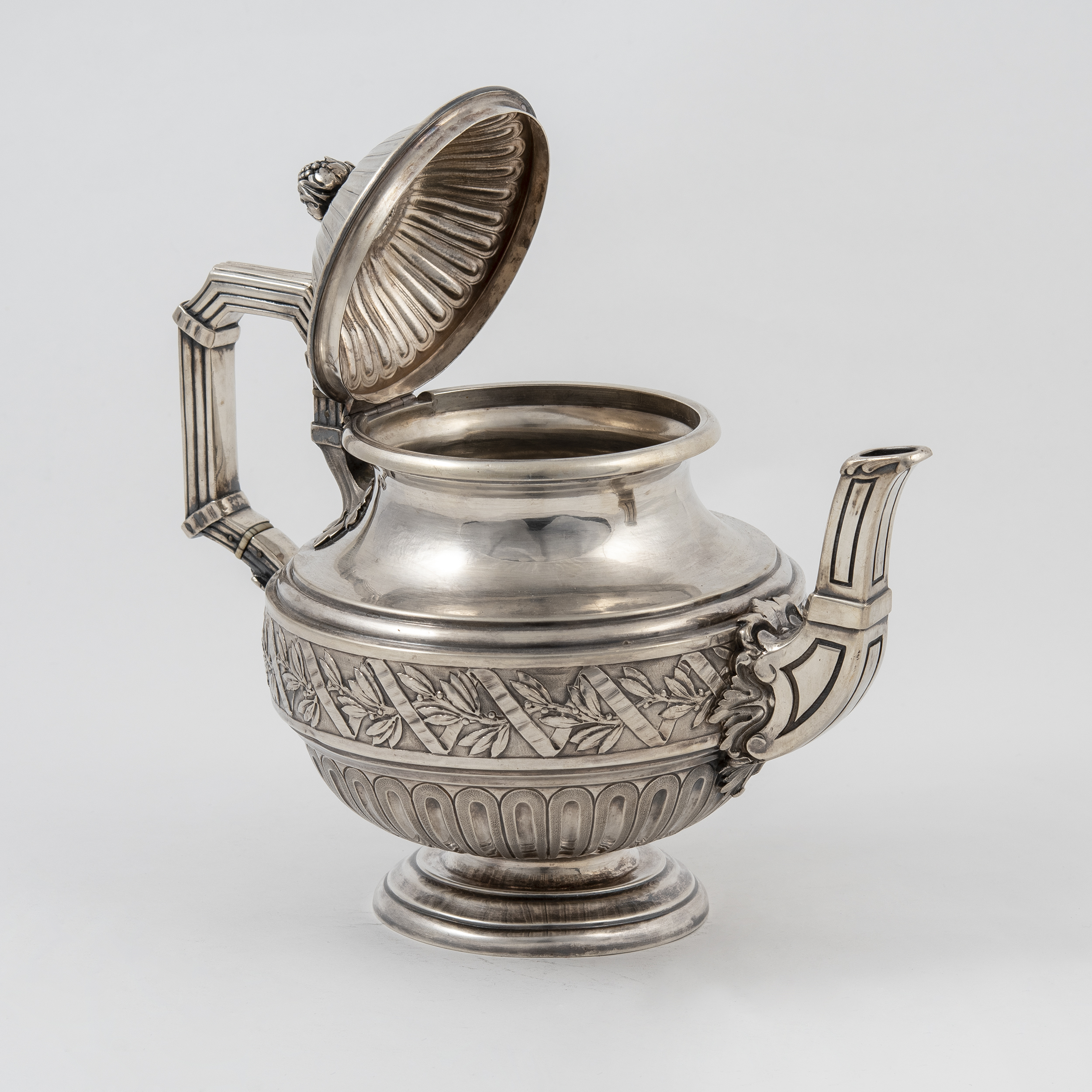 Чайник, молочник, сахарница с крышкой, бульотка со спиртовкой, украшенные лавровыми гирляндами и лентами; прямоугольный поднос с ручками, декорированными маскаронами «голова барана»;