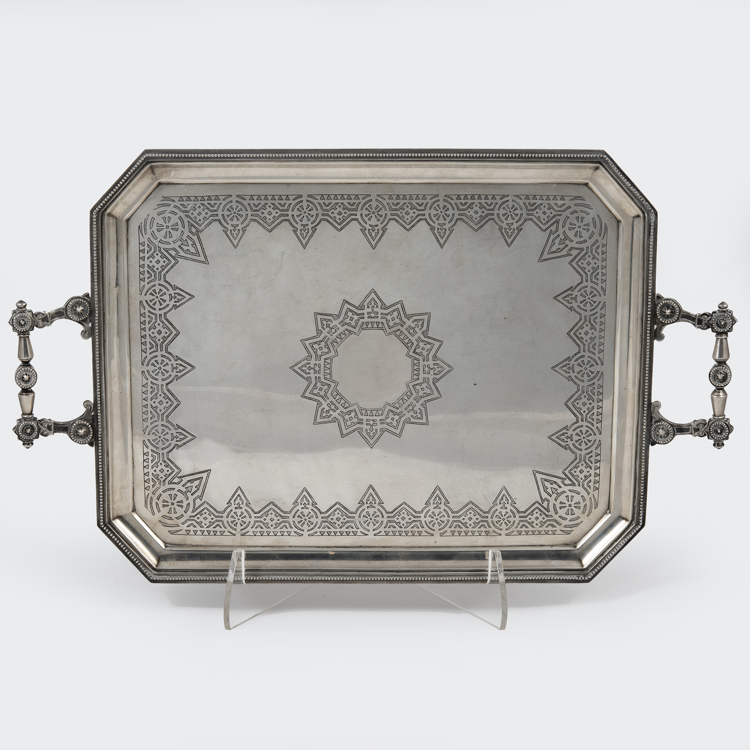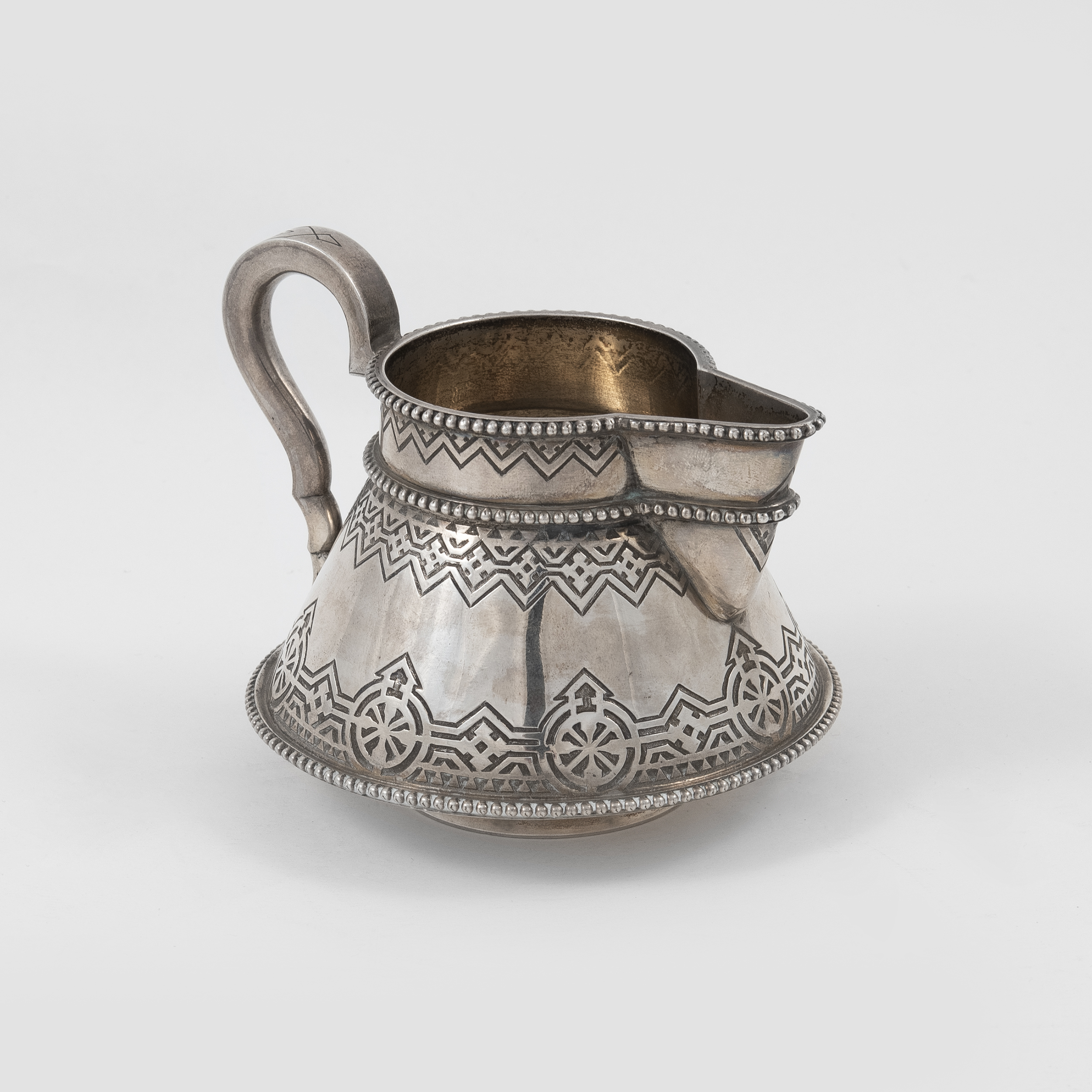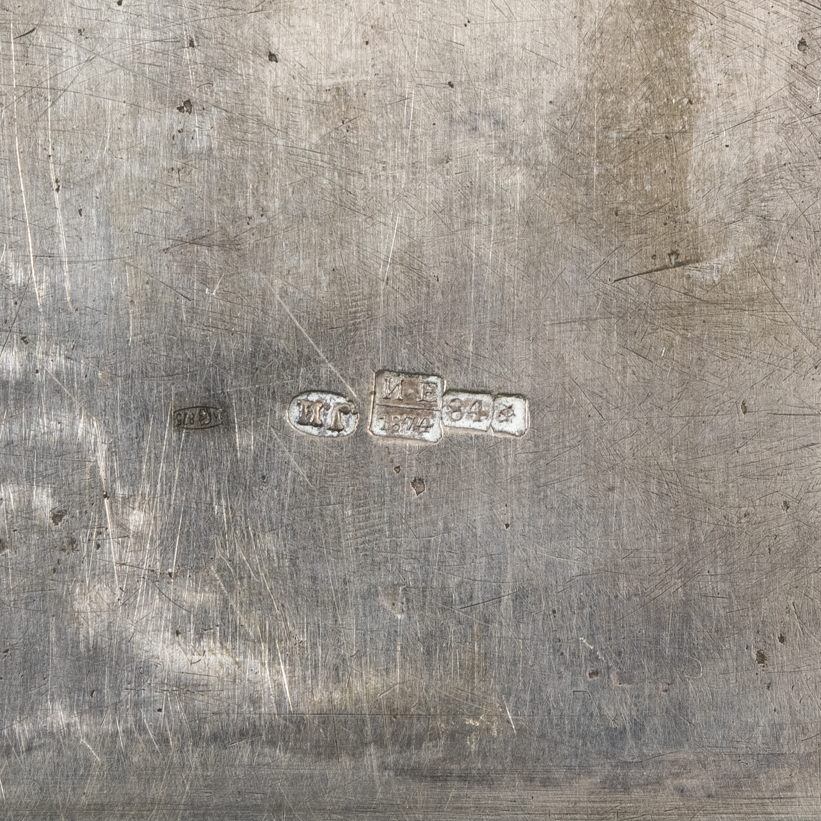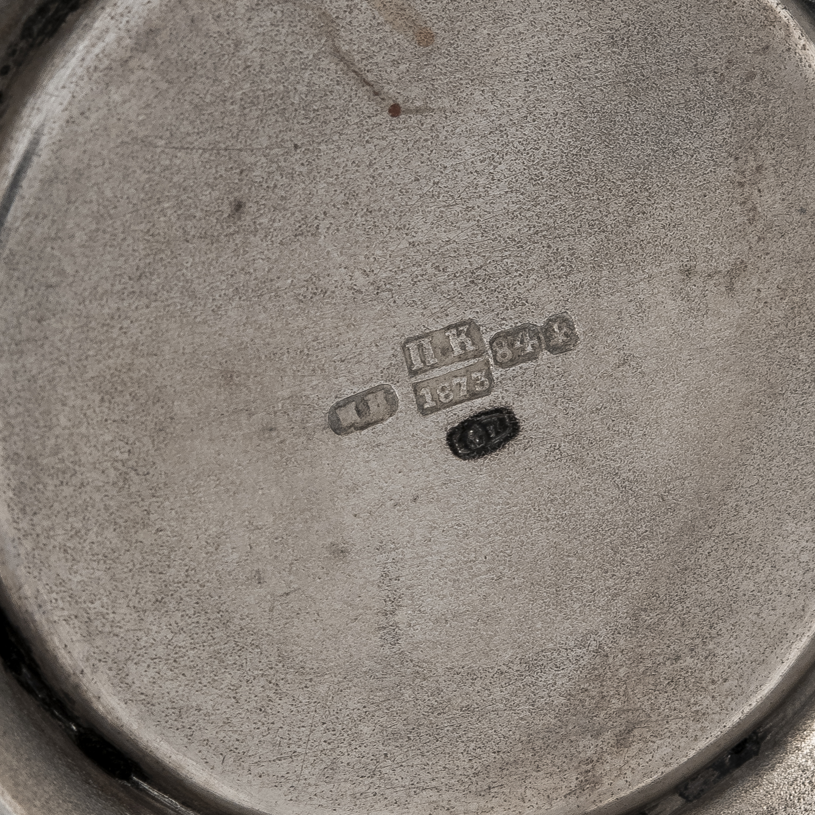 Клейма: 84 пробы, герб города Санкт-Петербурга «Два якоря и скипетр»; инициалы пробирного мастера «П.К» над датой «1873»; именник мастера «Н.Н» Николая Никитина; клейма на подносе: 84 проба, «Два якоря и скипетр» в щитке, инициалы пробирного мастера «И.Е» над датой 1874, клеймо «J.H» петербургского мастера серебряного дела Иогана Хейнойна (Johann Heinoin). Российская империя.