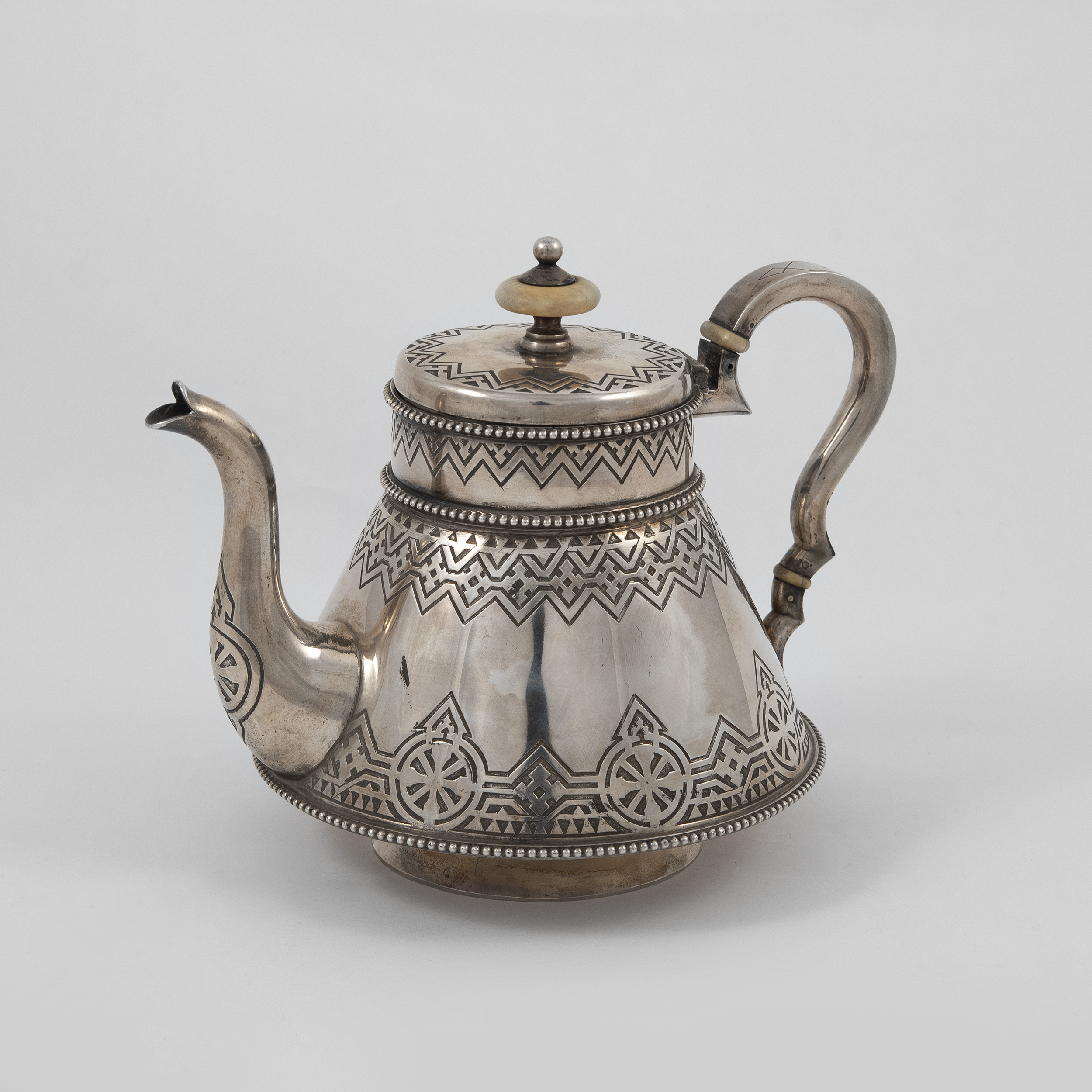 Чайник, кофейник, сахарница, сливочник и поднос.