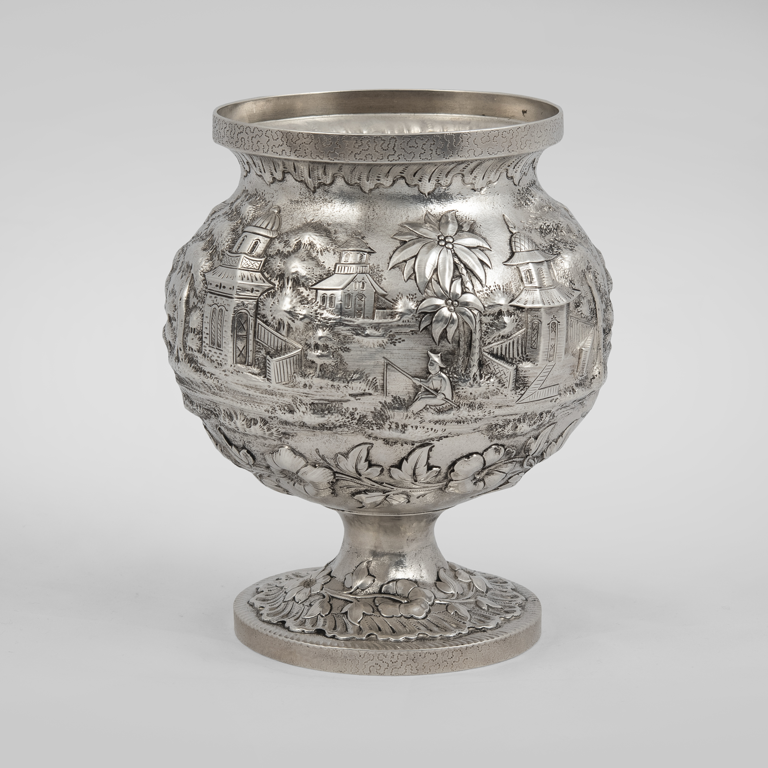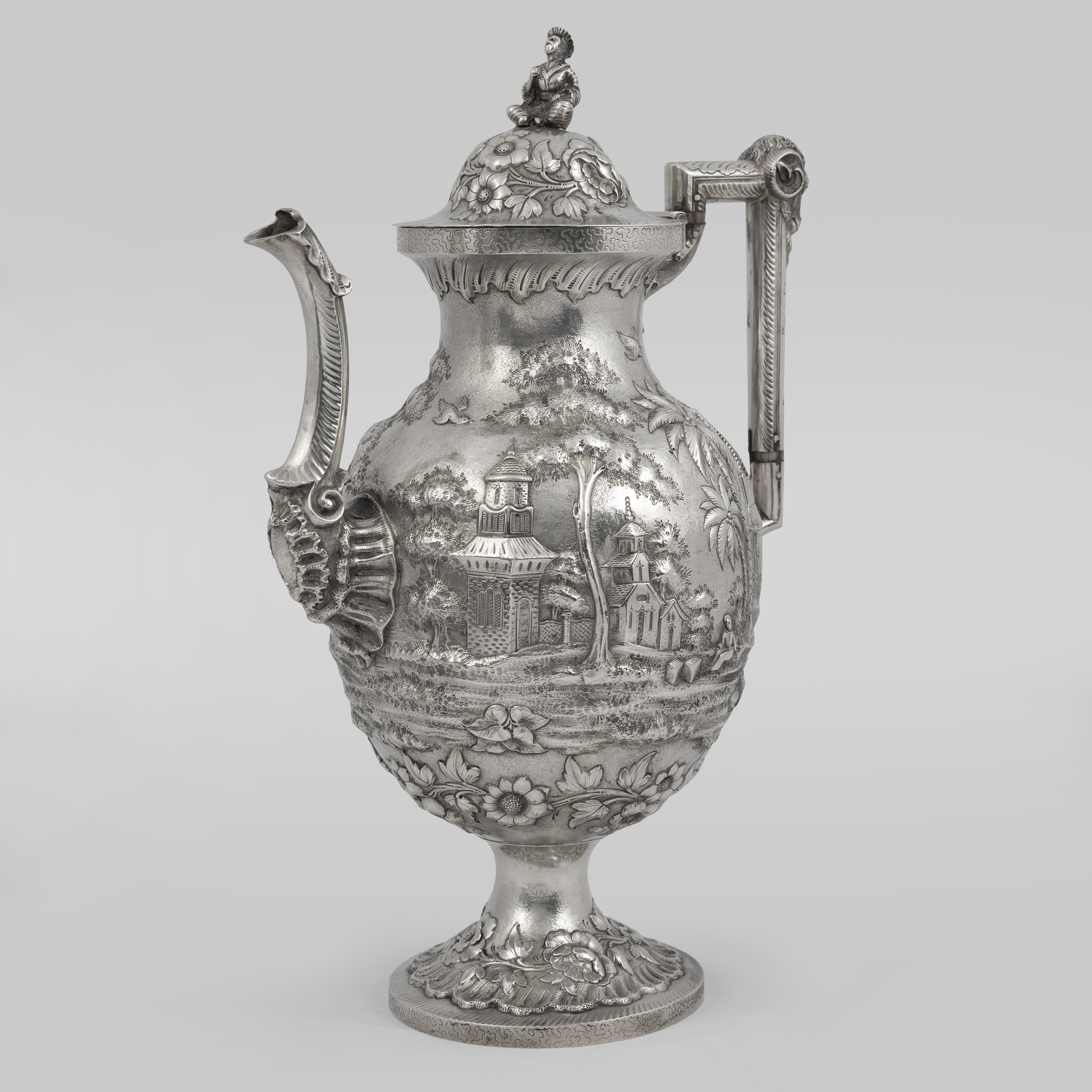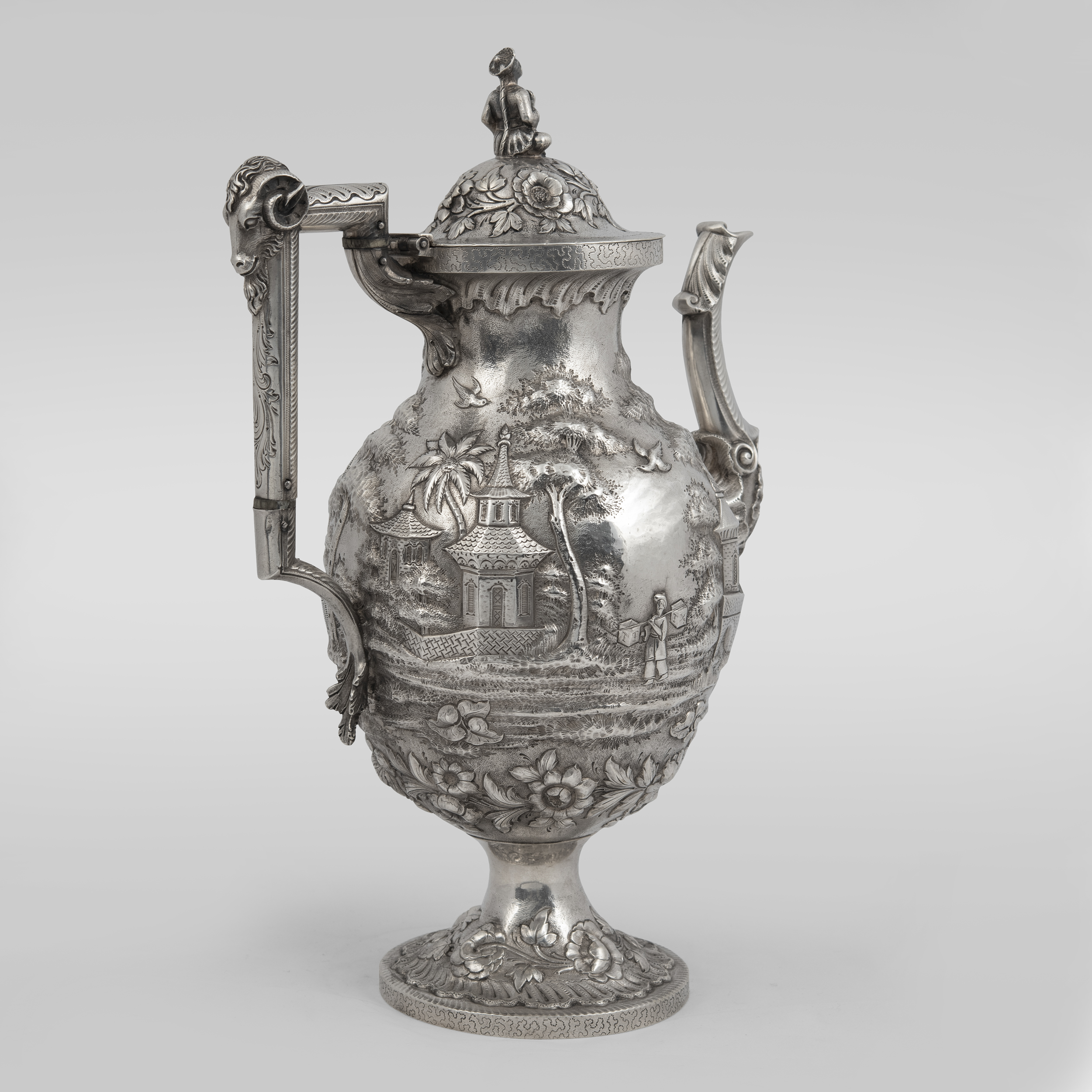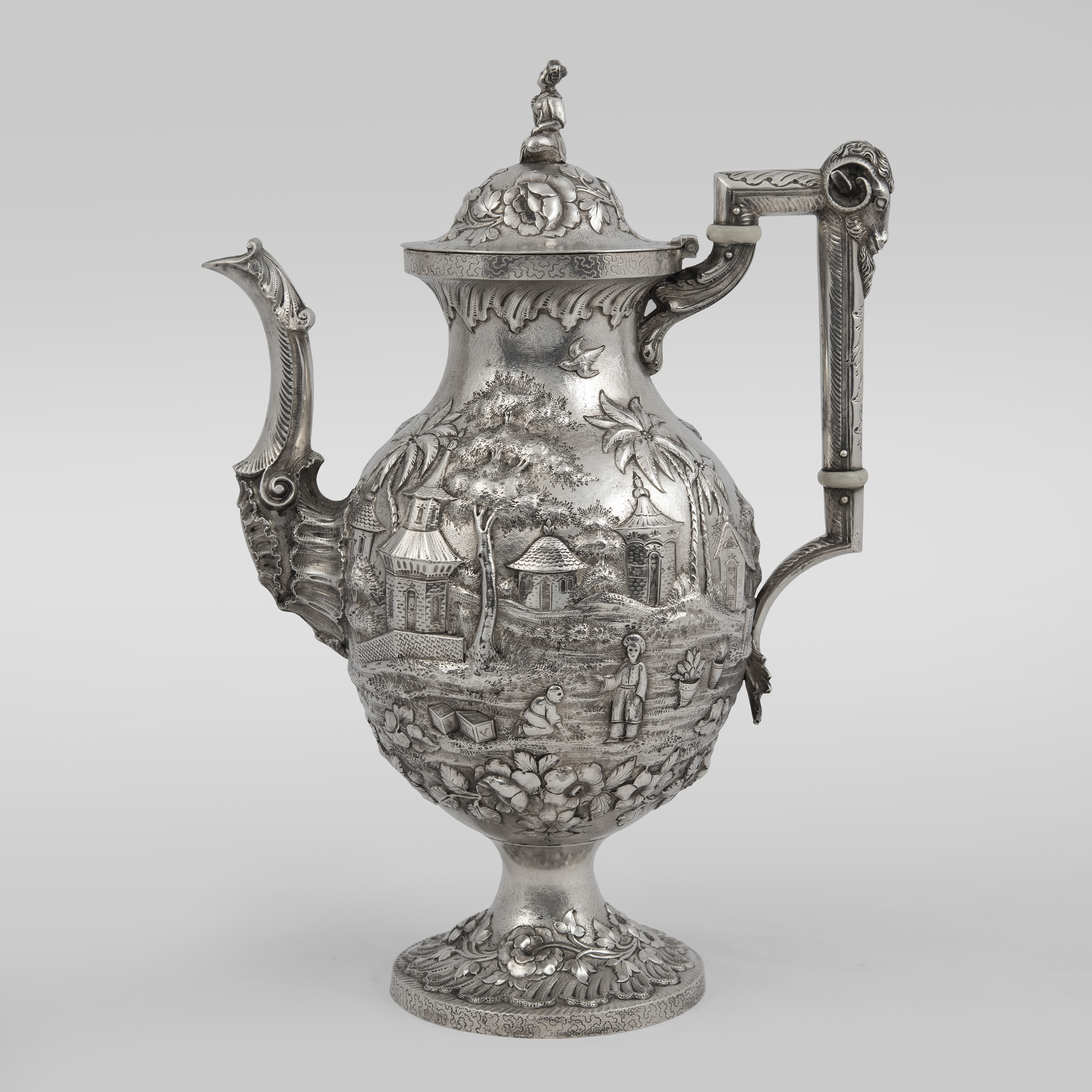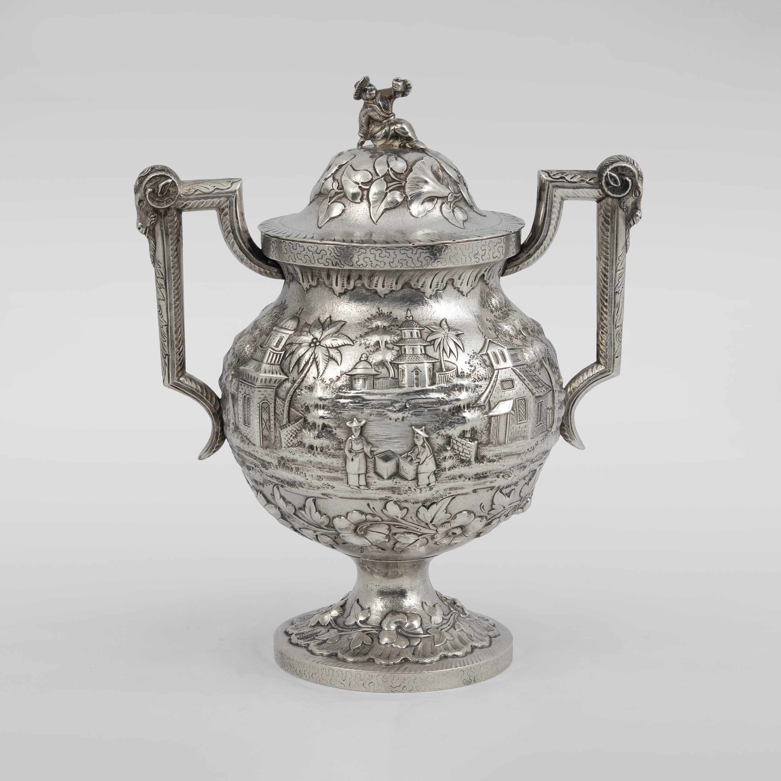 Украшен экзотическими пейзажами в высоком рельефе, а также фигурками в национальных китайских костюмах на крышках;
