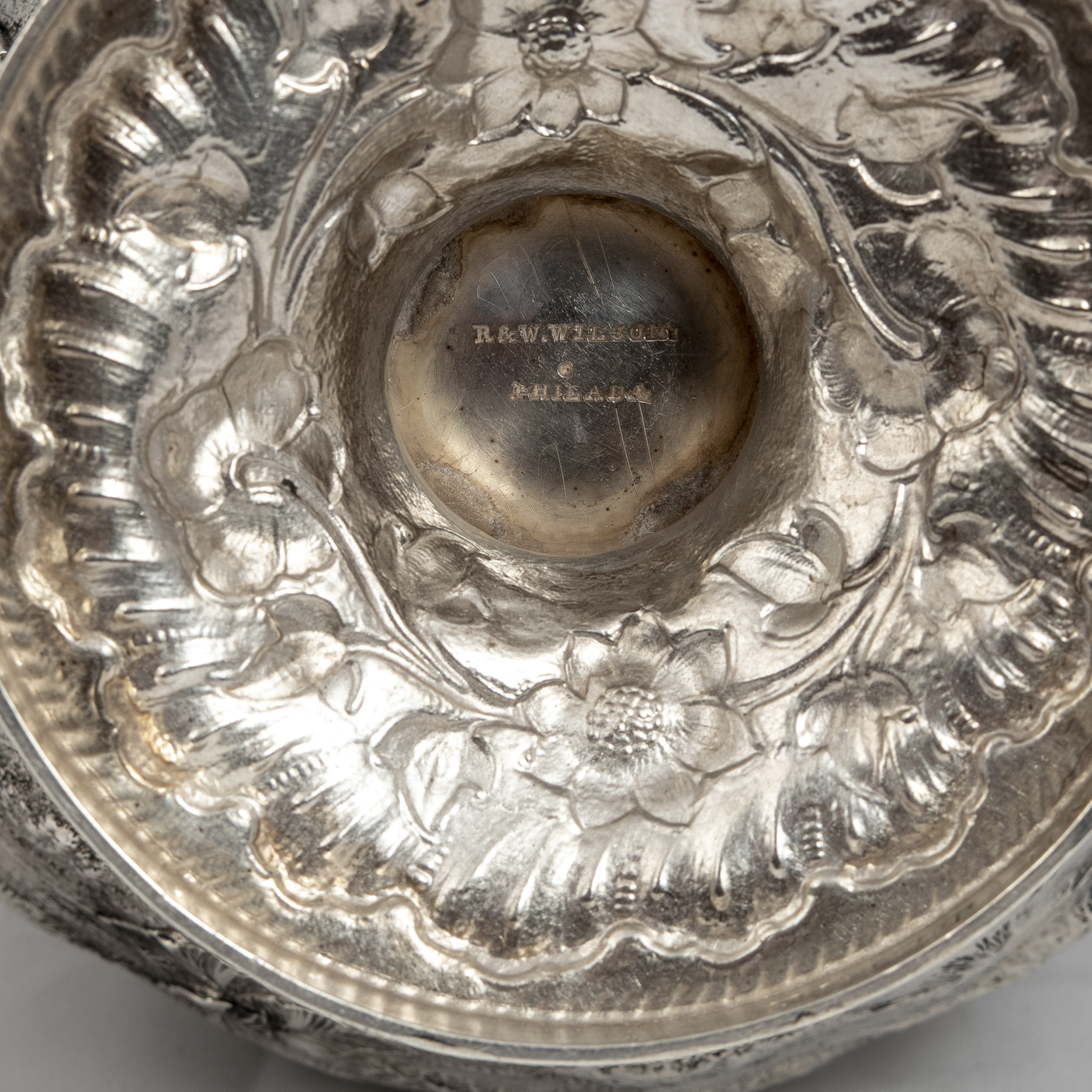 Клейма: 875 проба, именник «R&Wilson Philada» - фирма Роберта и Уильяма Уилсонов; клеймо 1825-1877 годов;