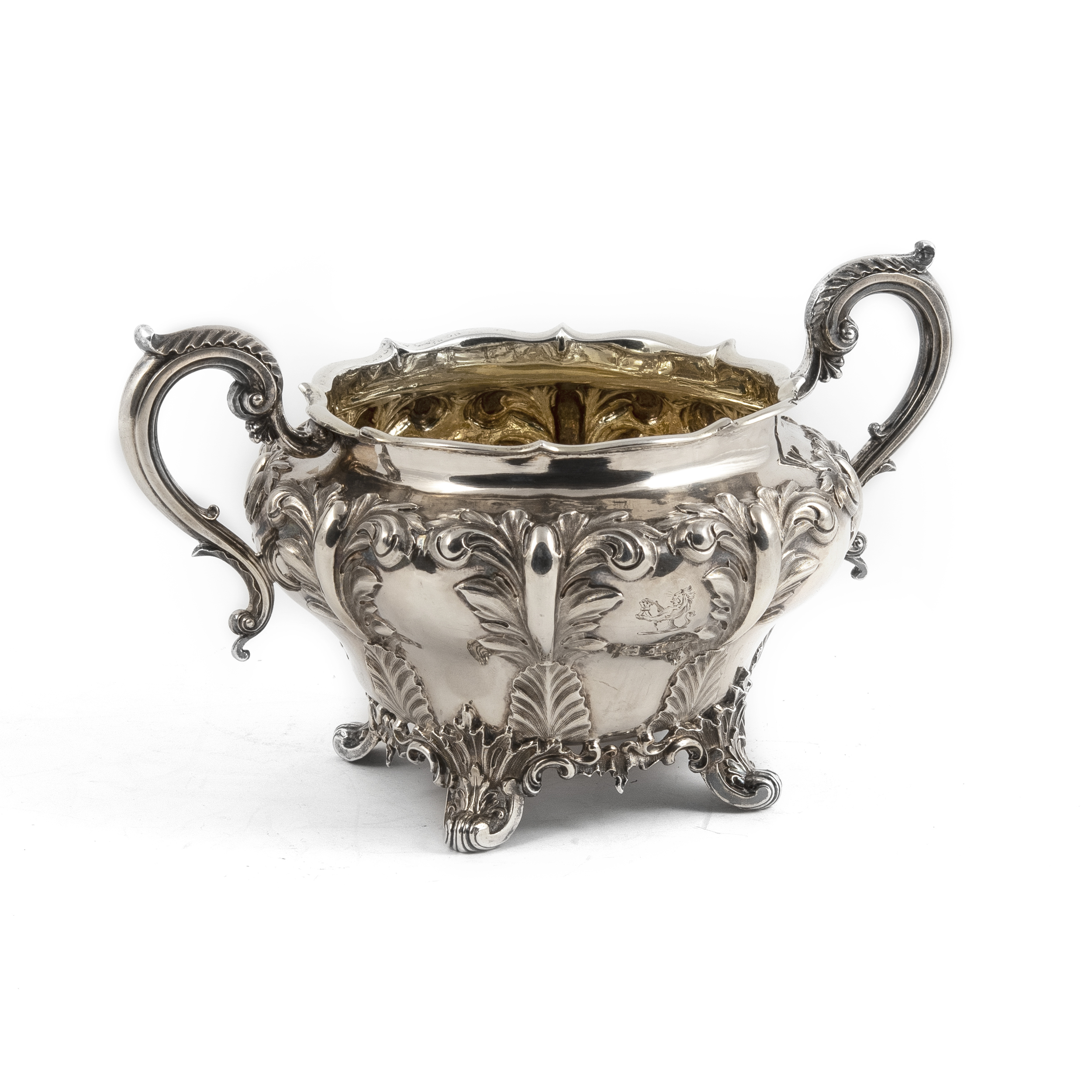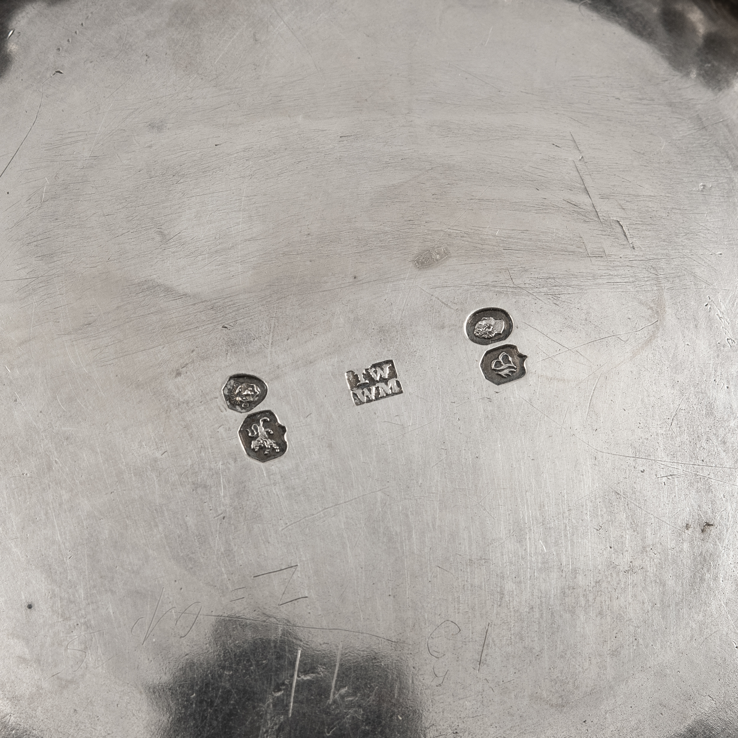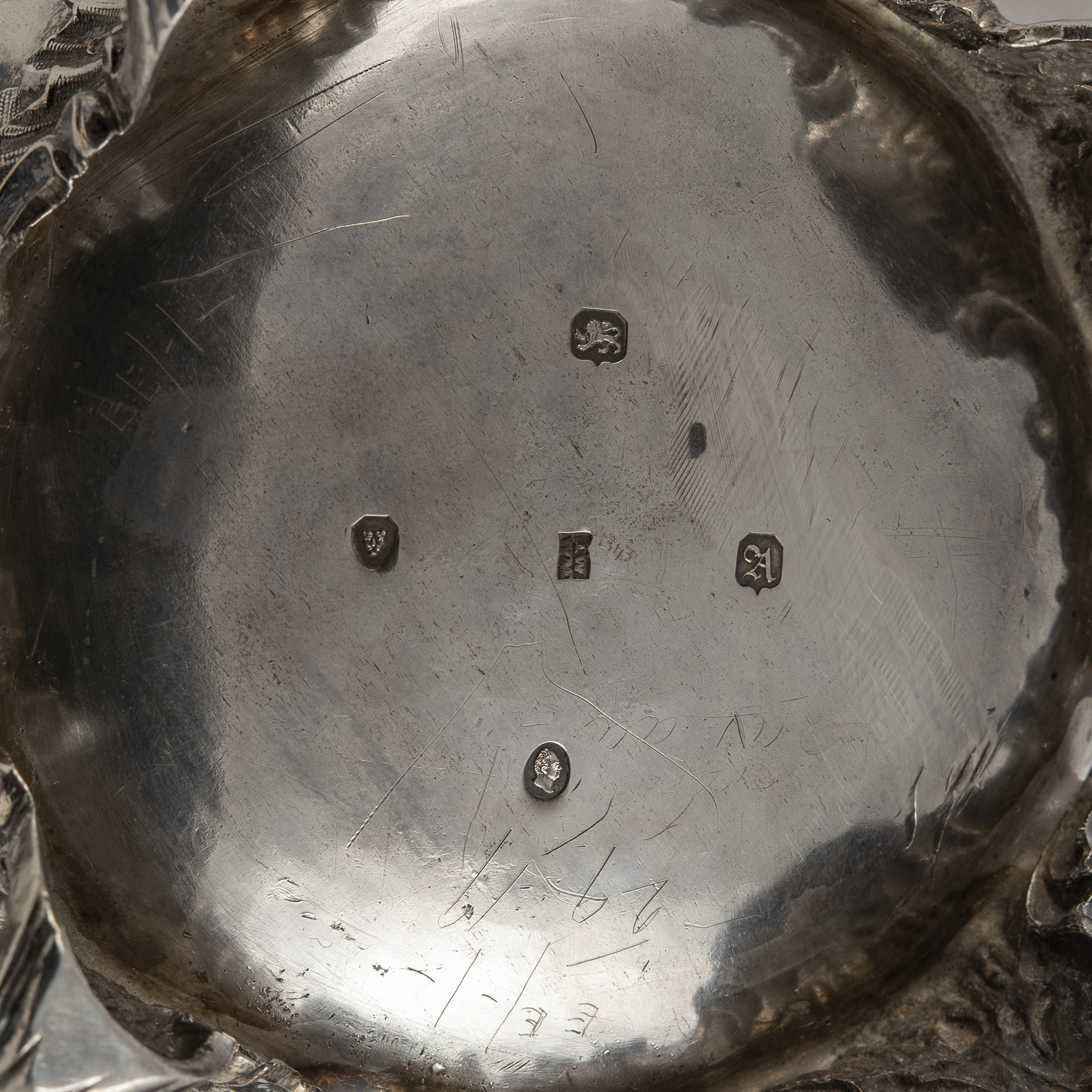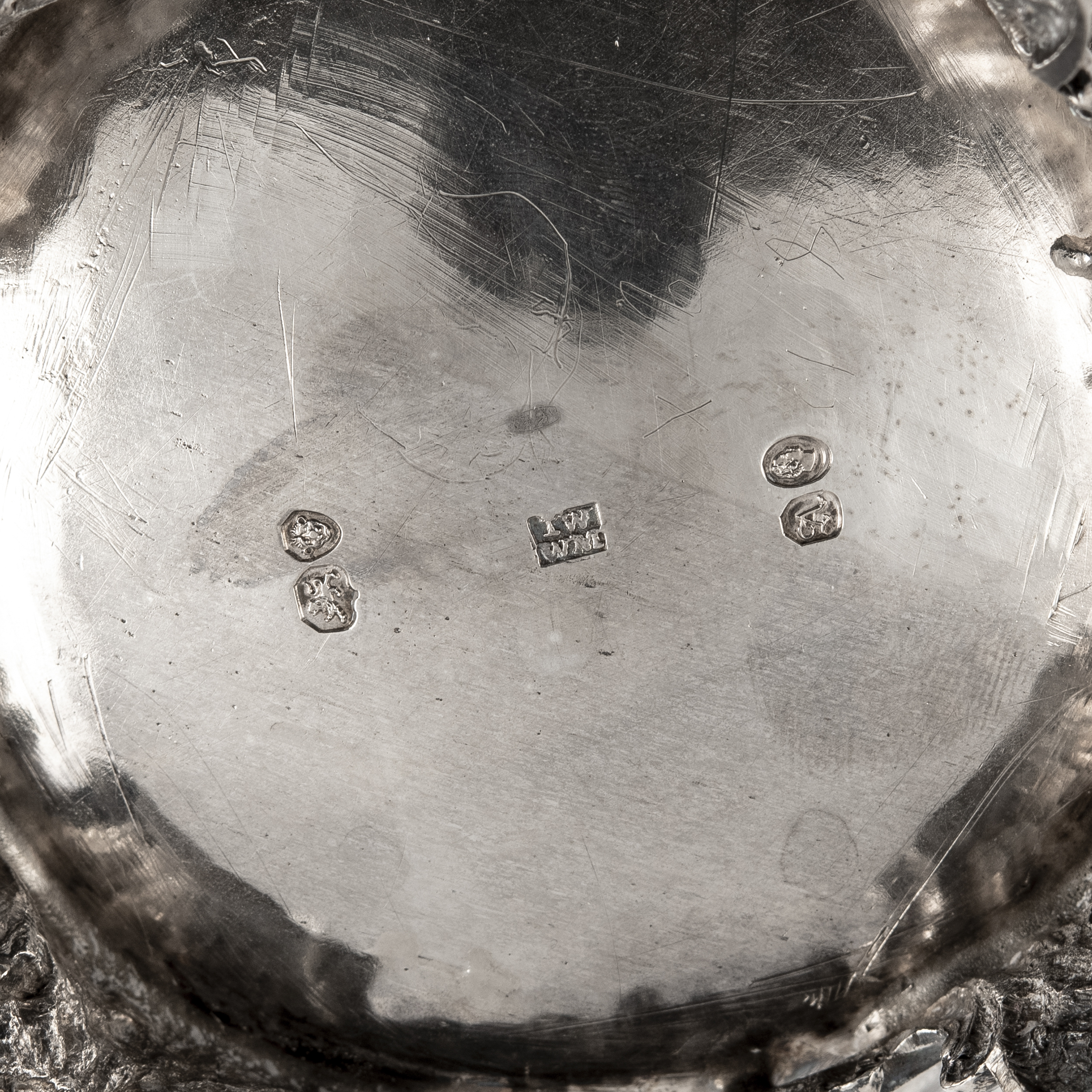 Клейма: проба 925, пробирные клейма Англии: в щитке «лев, идущий с поднятой правой передней лапой», голова леопарда - городское клеймо Лондона; буква «А» в фигурном щитке - дата; голова Королевы Виктории - знак уплаты госпошлины; мастерской «IW WM» в фигурном щитке, фирма «Wrangham & Moulson»; на тулове чайника владельческий герб в виде льва;