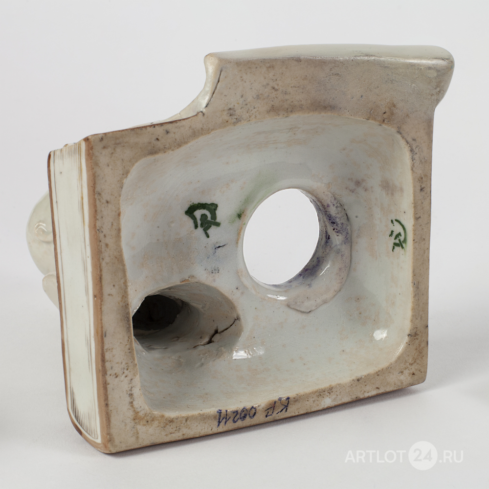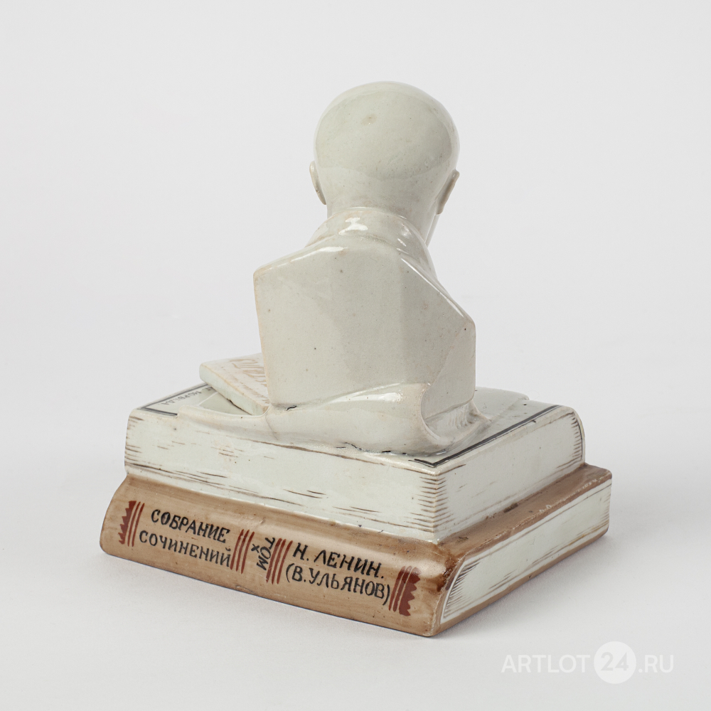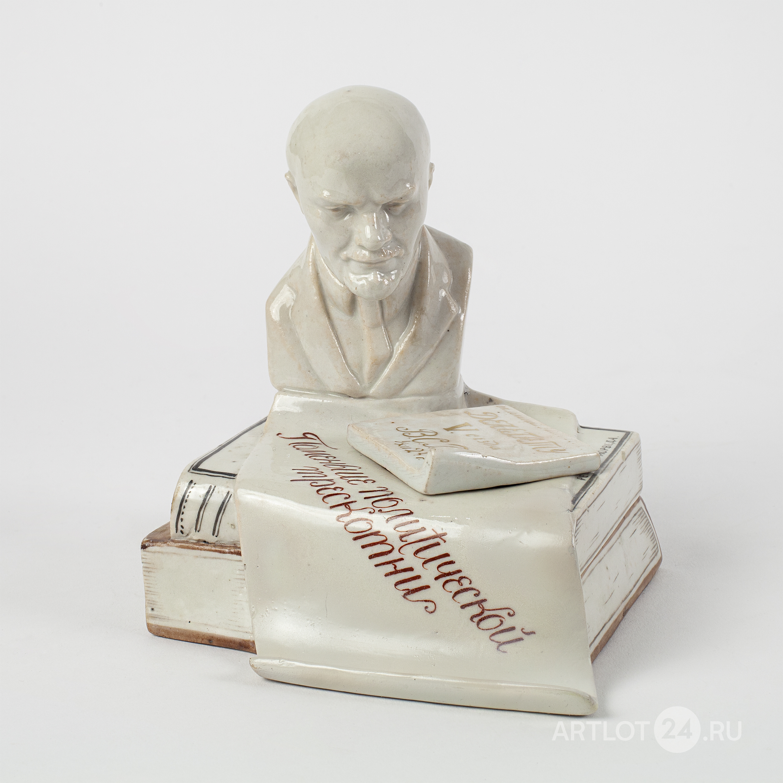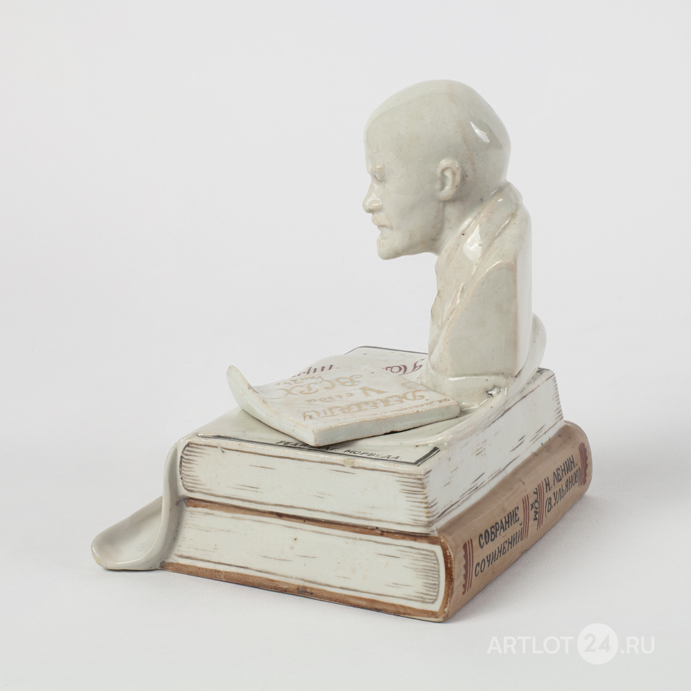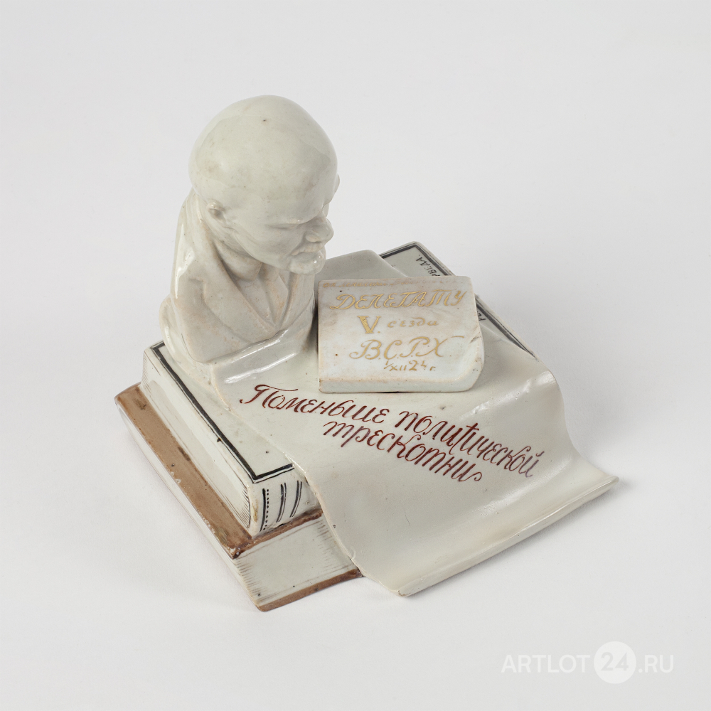 На постаменте надписи: «РЕДИЗДАТ МОРВЕДА» и «Собрание сочинений. Н. Ленин (В. Ульянов) Том Х». Фарфор, надглазурная роспись, на крышке надпись золотом «от Ленинград. Гуп. Отдела С.Х. Делегату V съезда В.С.Р.Х. 1/xii 24 г.», автор формы Н.Я. Данько, два зеленых подглазурных клейма в виде серпа, молота и части шестерни от руки, Государственный фарфоровый завод, 1924 год, размер(в/д/ш): 14 х 13 х 11,5 см