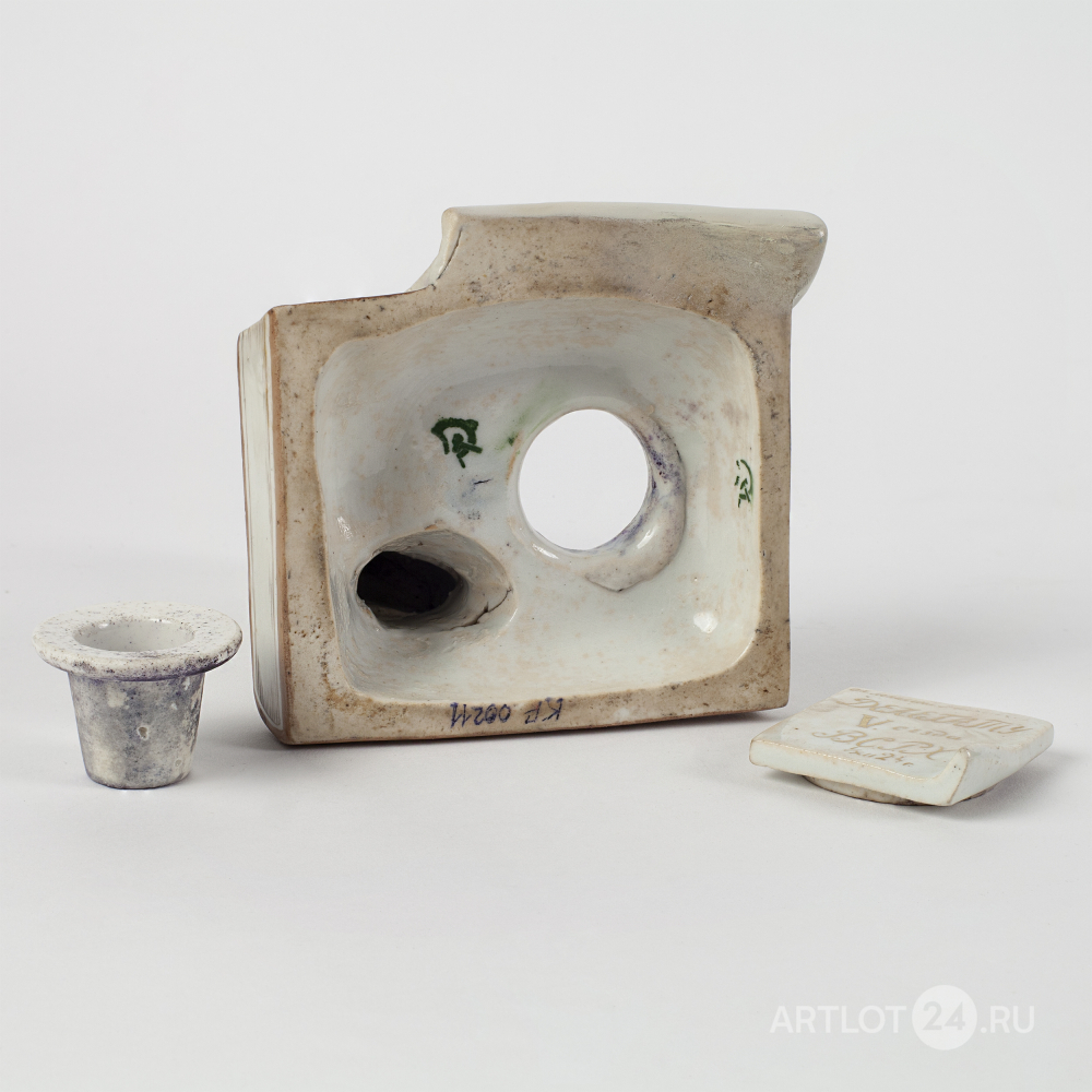Состояние: Реставрация края чернильницы, по небольшому сколу на крышке с внутренней и внешней сторон; следы технологических дефектов