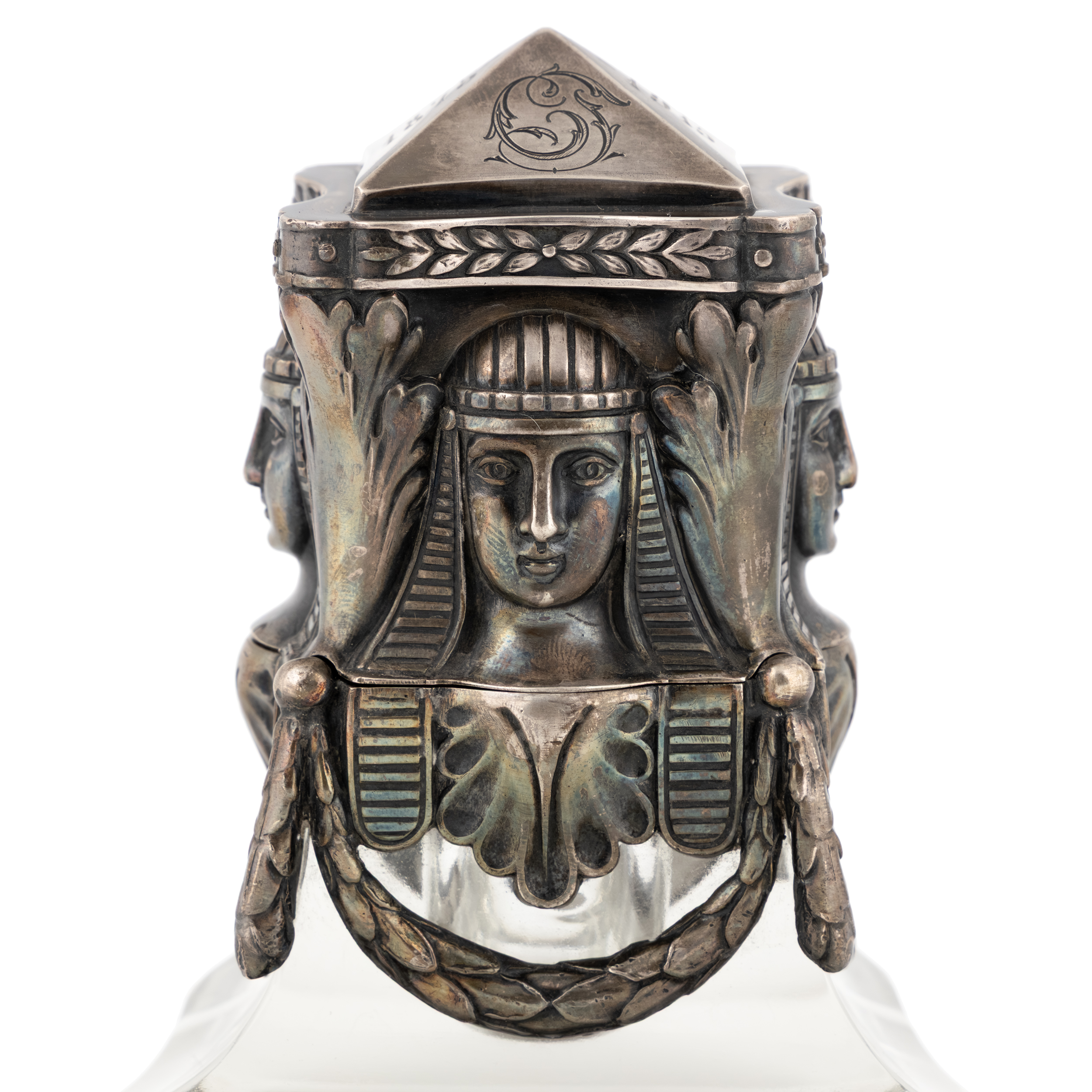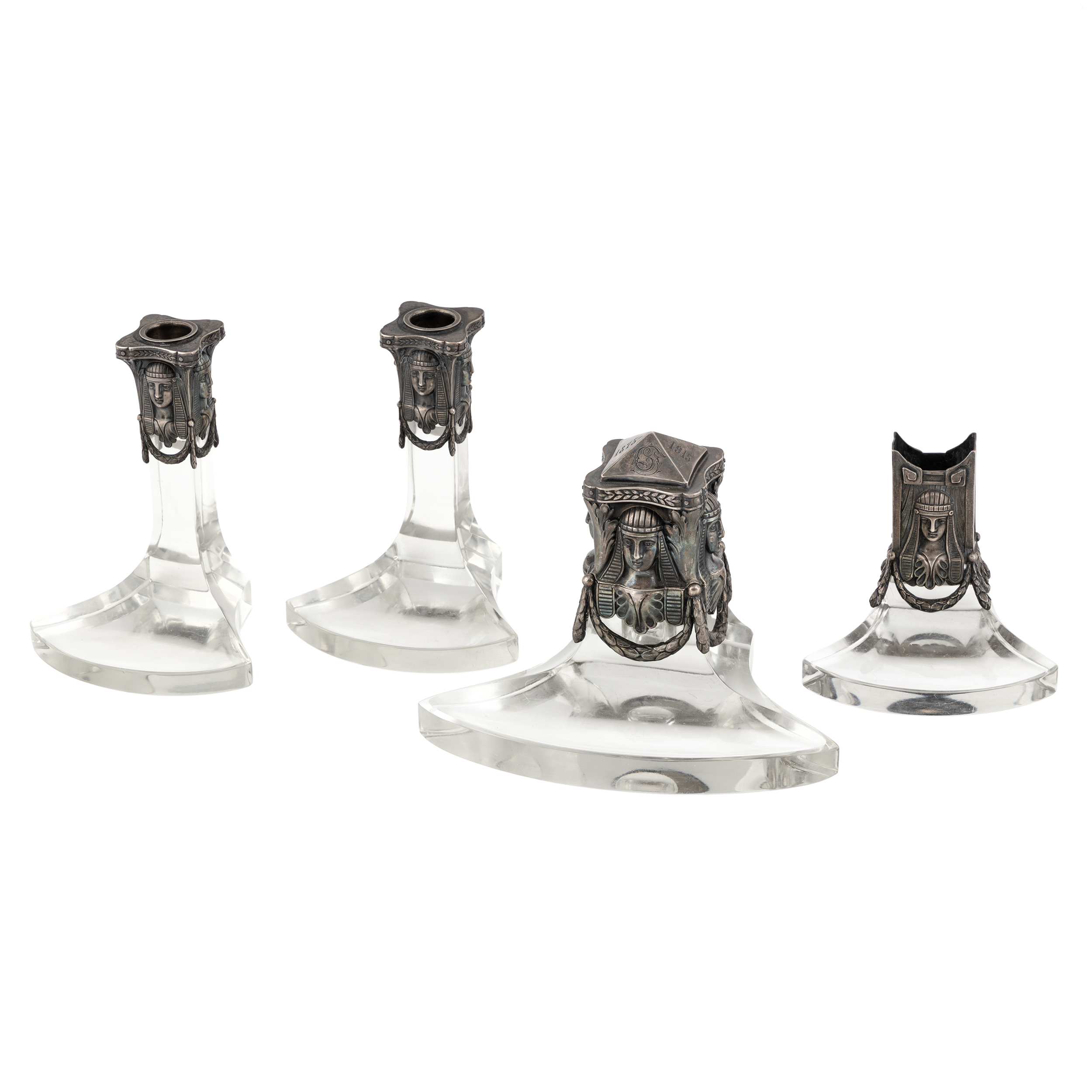 Серебряный настольный чернильный прибор в египетском стиле, состоит из 4х предметов: чернильницы, двух подсвечников и спичечницы.
