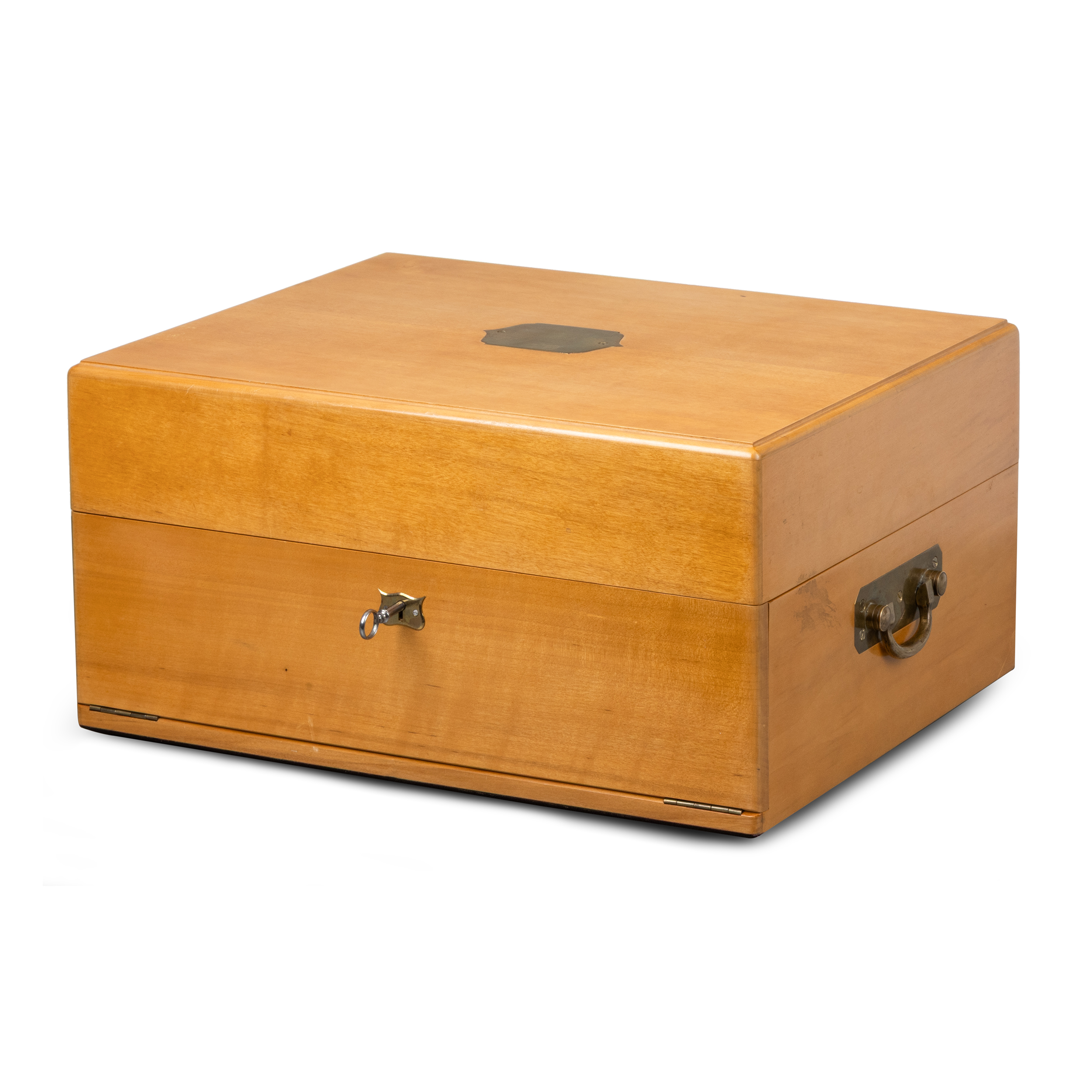 Имеет родную упаковку с откидной крышкой, замком и двумя латунными ручками. Внутри коробка отделана натуральной замшей. На крышке дарственная надпись, изготовленная ручной гравировкой. Вся фурнитура упаковки выполнена на высоком профессиональном уровне и находится в идеальном состоянии. Есть клейма.