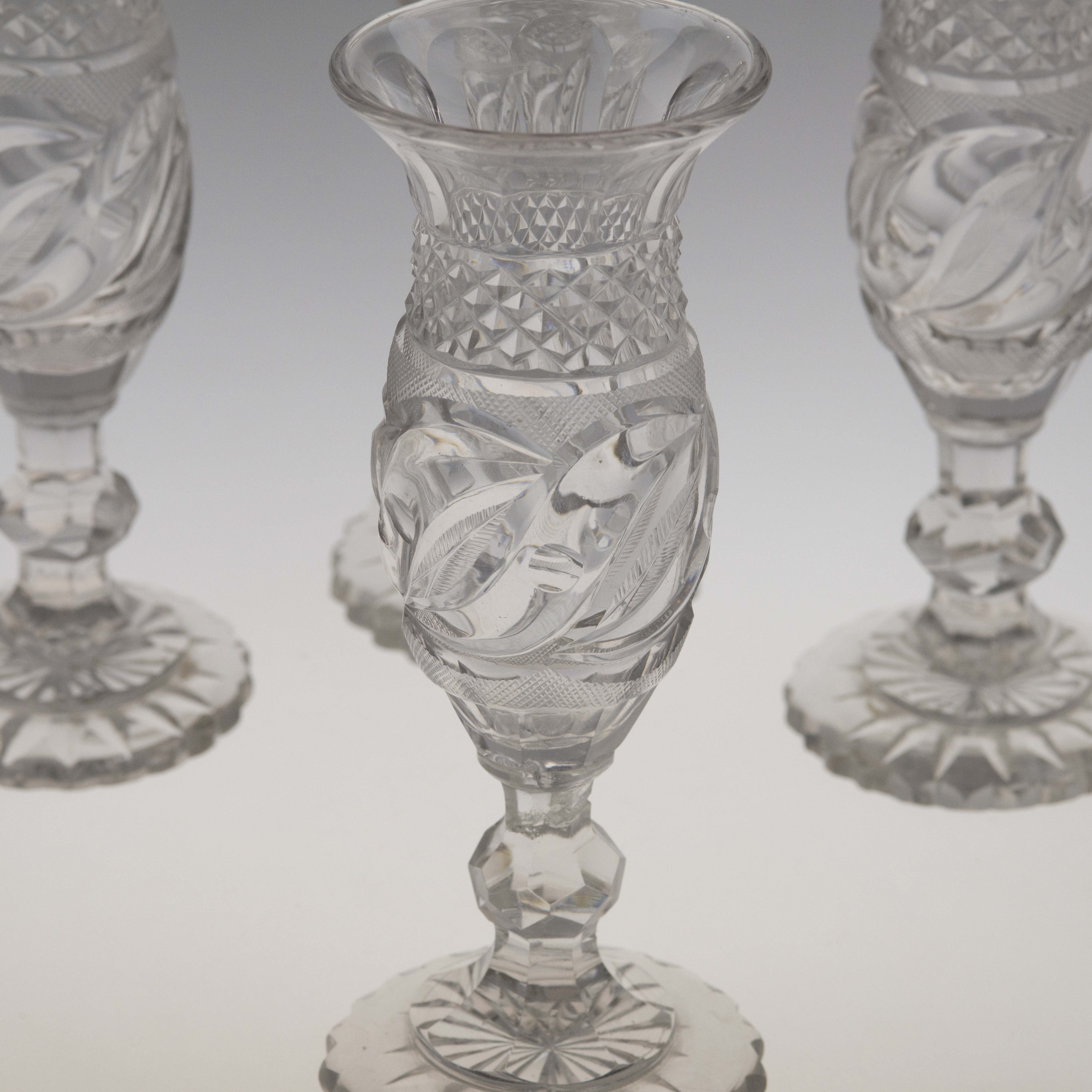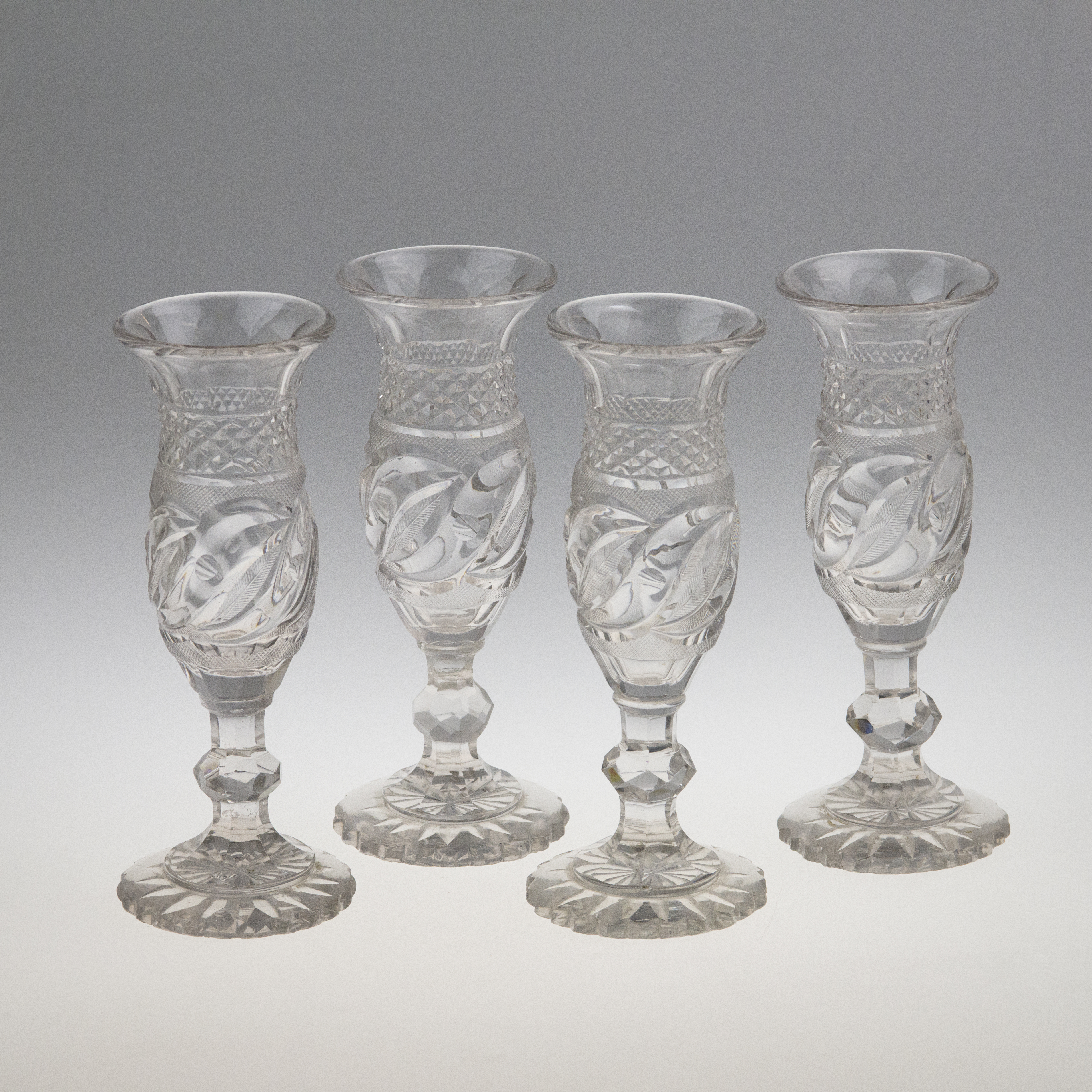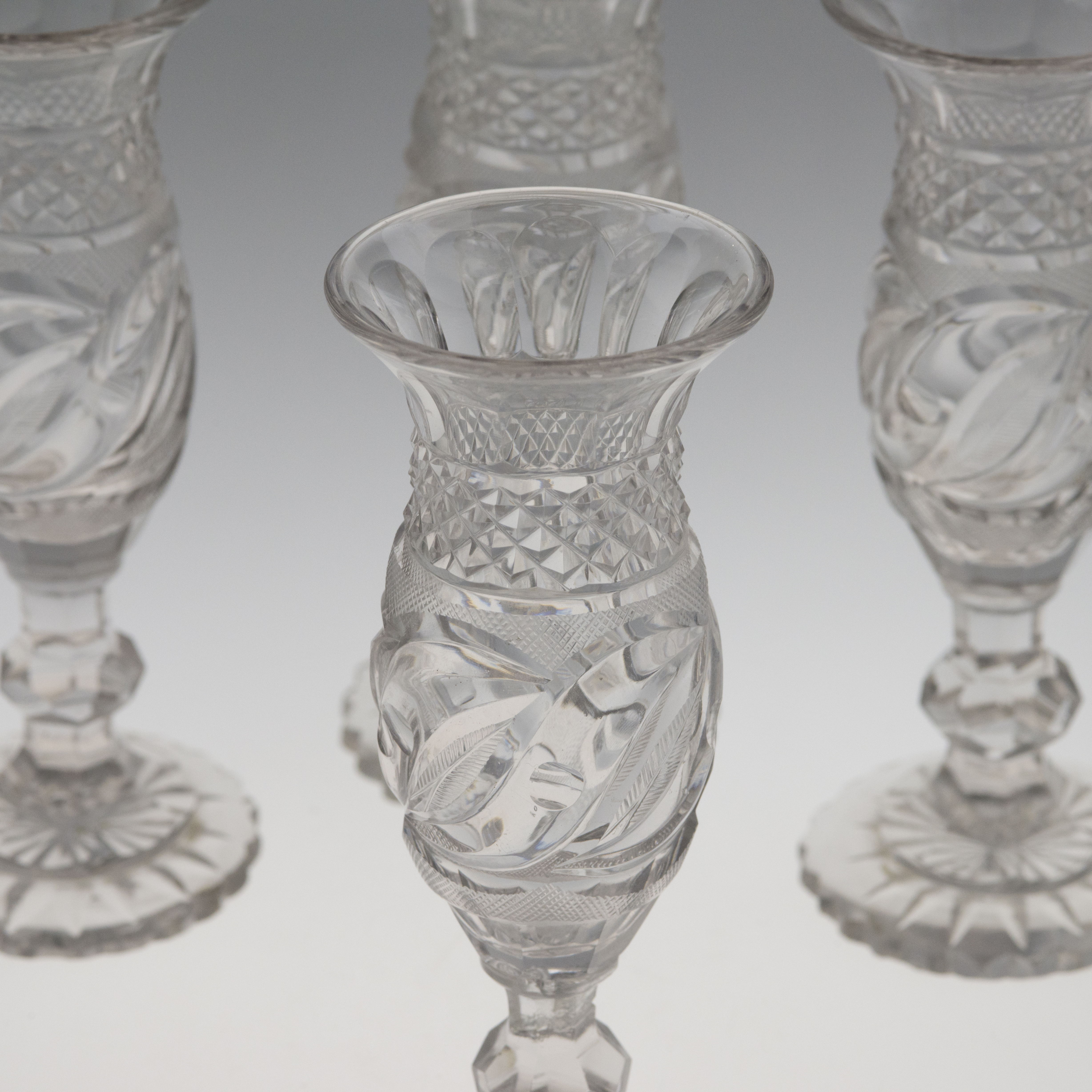 Предметы Пригородного «Гранного» сервиза. Бесцветный хрусталь, выдувание в форму, гранение – «павлинье перо», шлифовка; высота бокалов – 17,9 см.