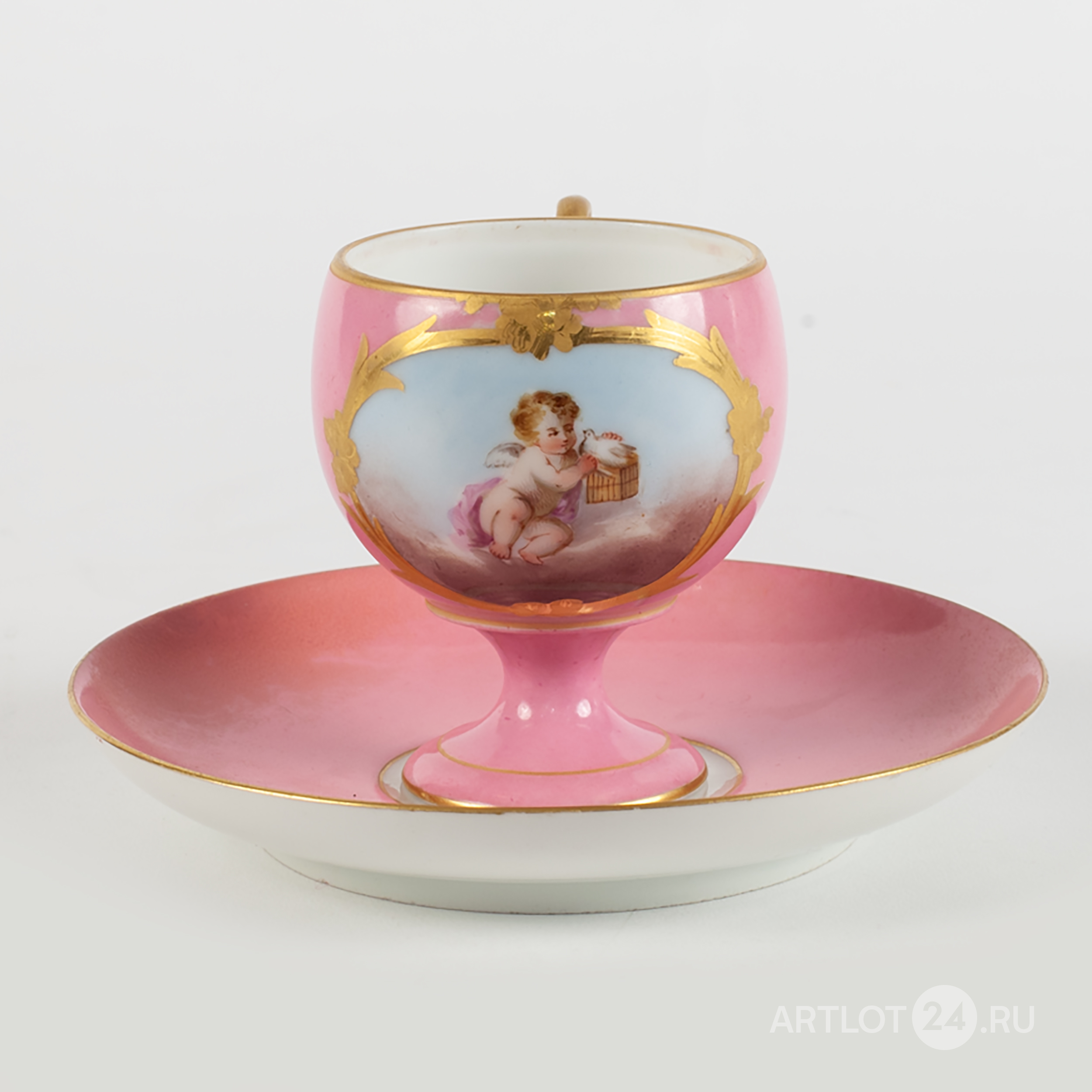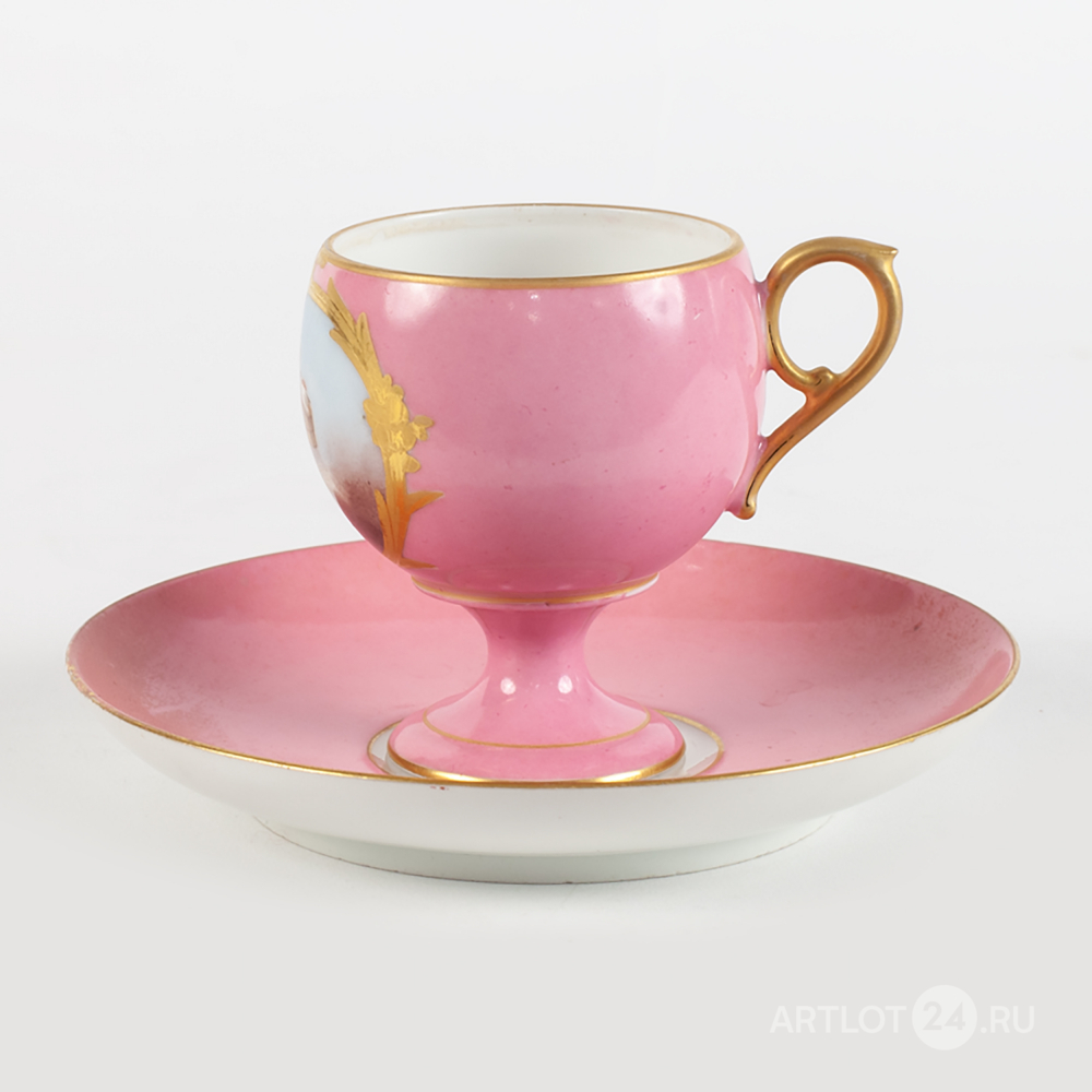 Фарфор, розовое крытье, полихромная надглазурная роспись, метка в тесте «217», без клейма, Европа, высота чашки - 7 см, диаметр - 5,8 см, диаметр блюдца - 13,5 см