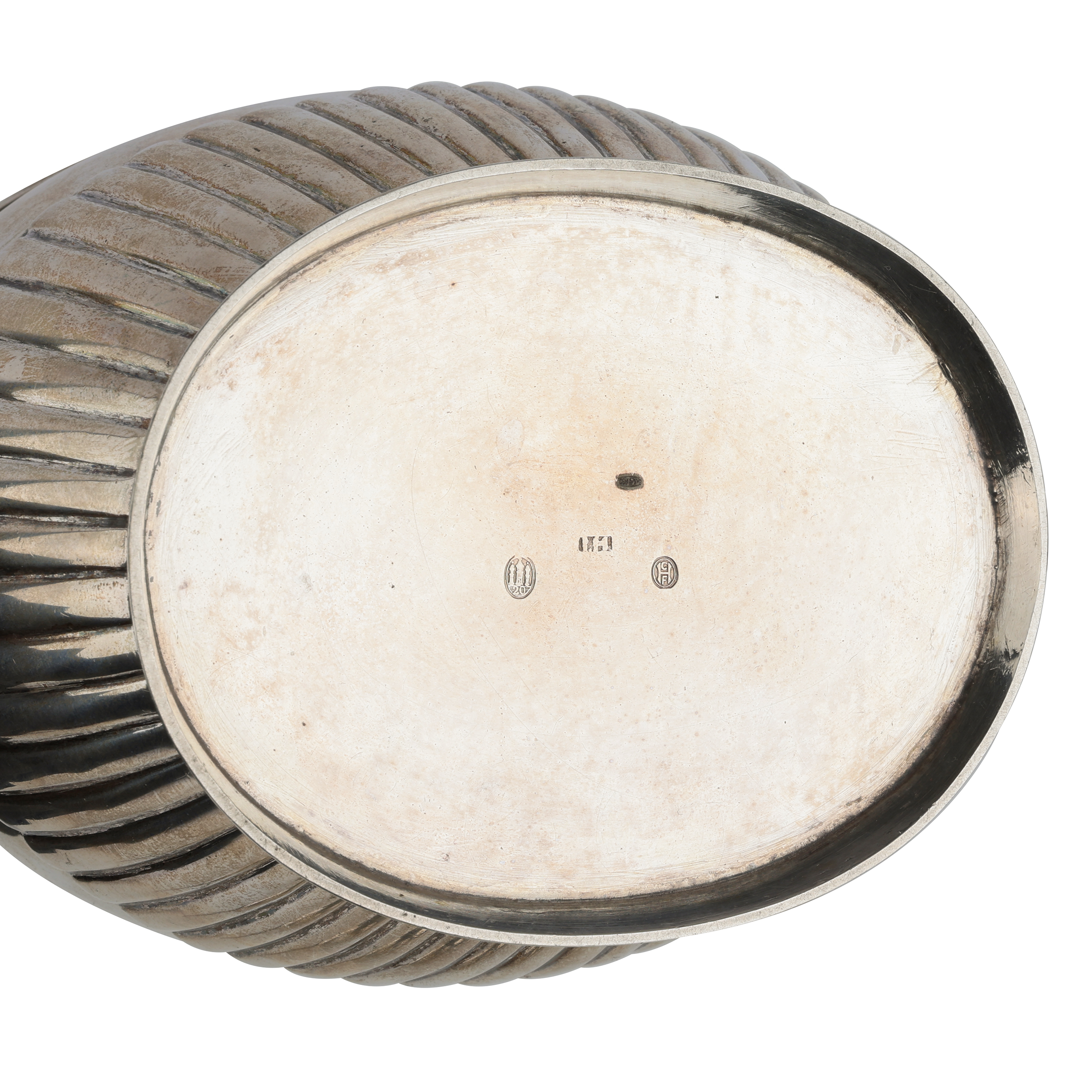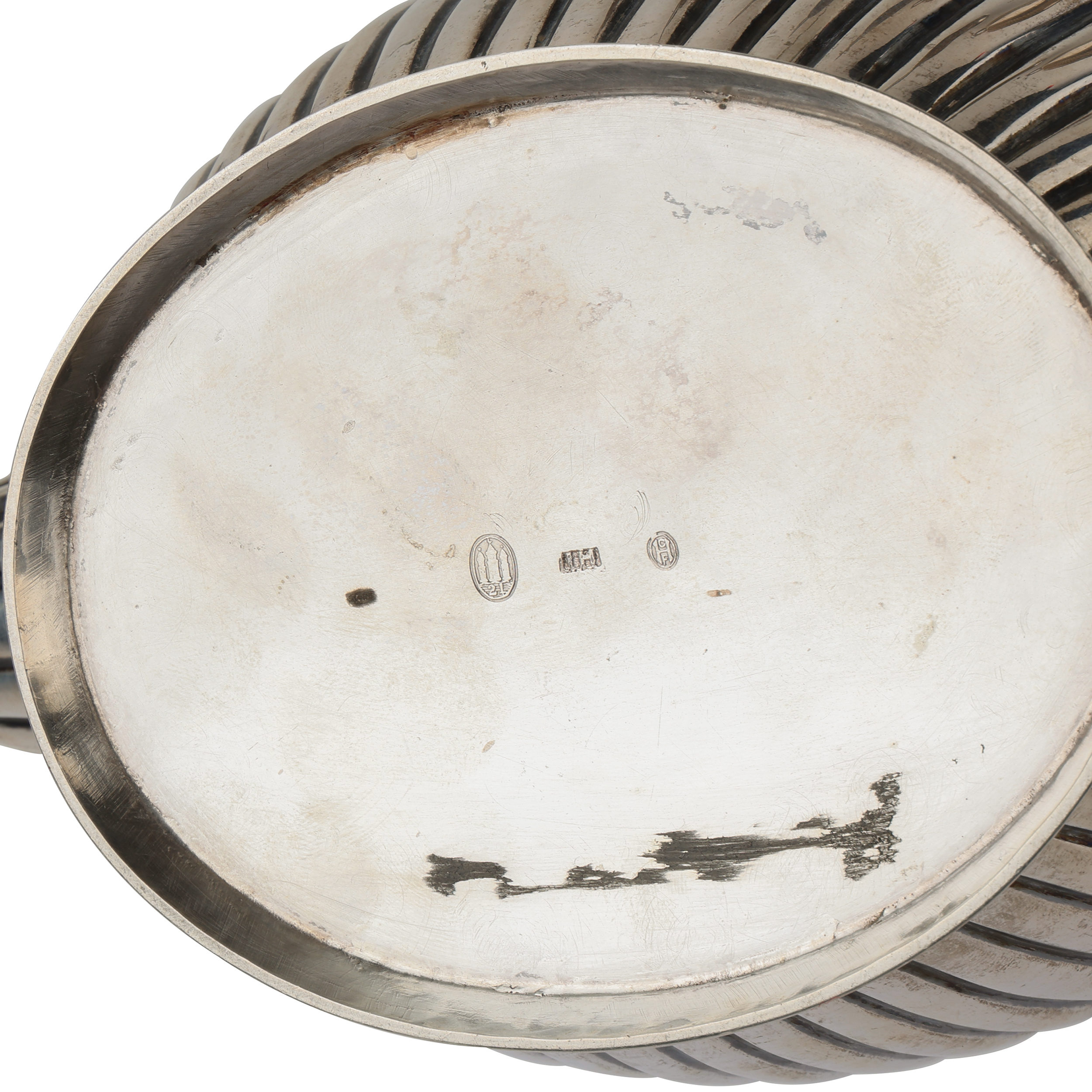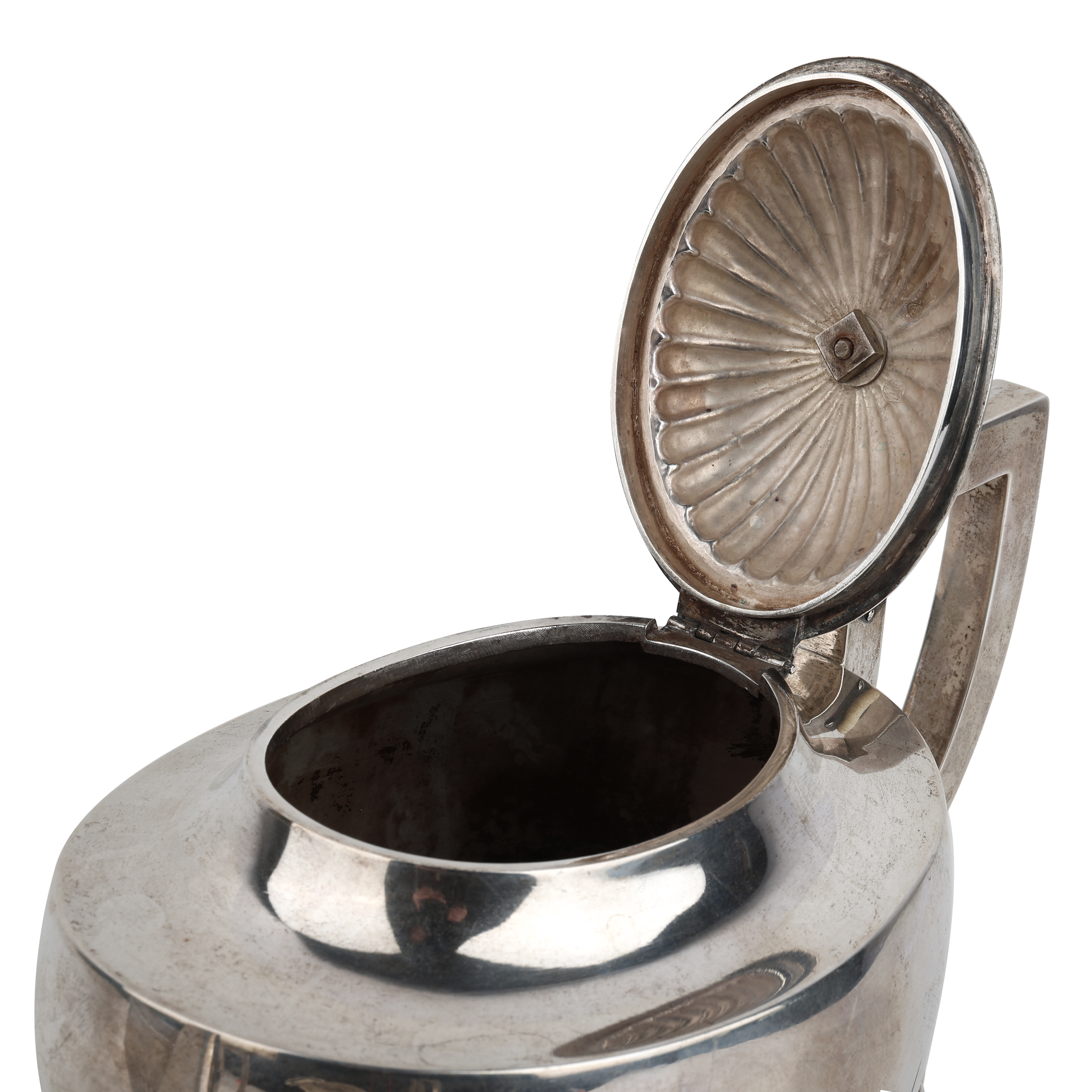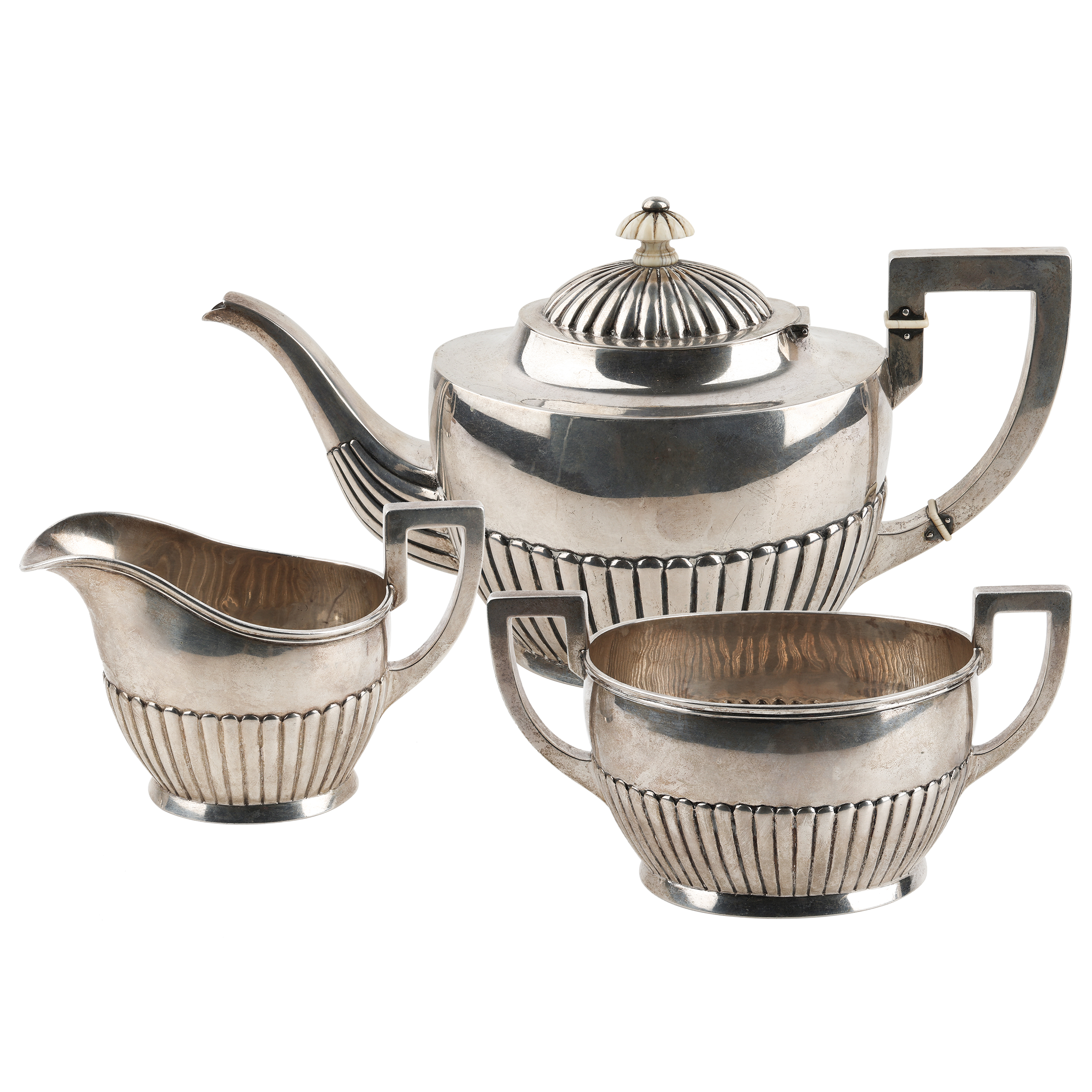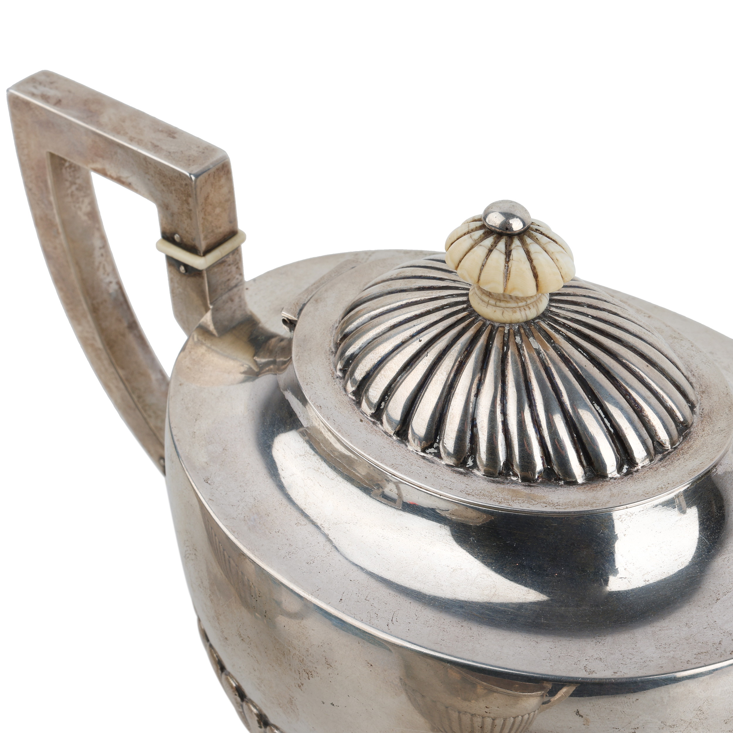 Чайник, сахарница и сливочник. Серебро, литье, шлифовка, монтировка, клейма: «Три башни» - городское клеймо Копенгагена, «CHF» - клеймо начальника пробирной палаты Кристиана Ф. Хейса (Christian F. Heise, 1904-1932)