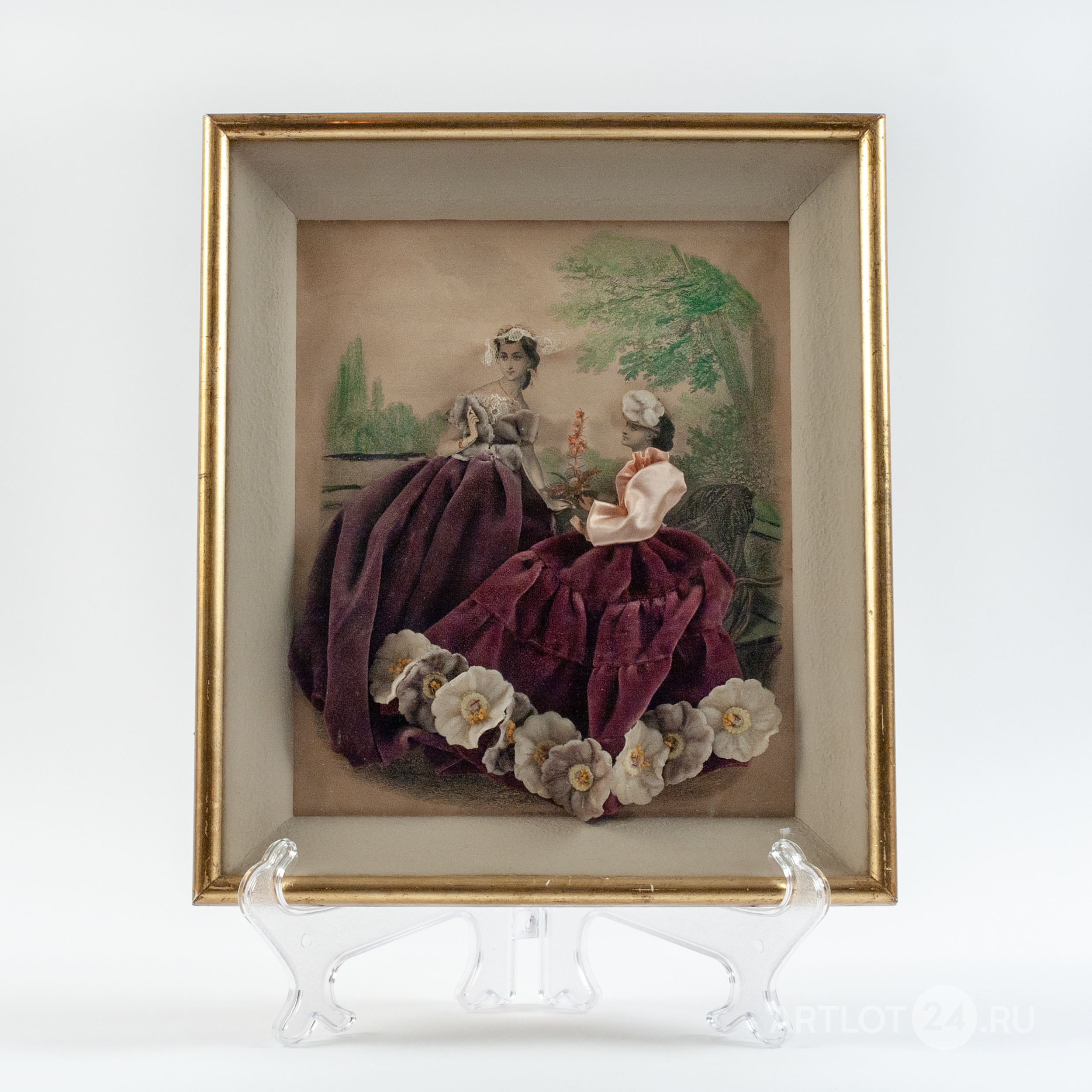 В основе раскрашенная литография французского журнала XIX века «La Mode Illustree», под изображением «Leroy Imp Paris». Бумага, ткани, бархат, кружево, вышивка, размер: 35,5 х 30 см