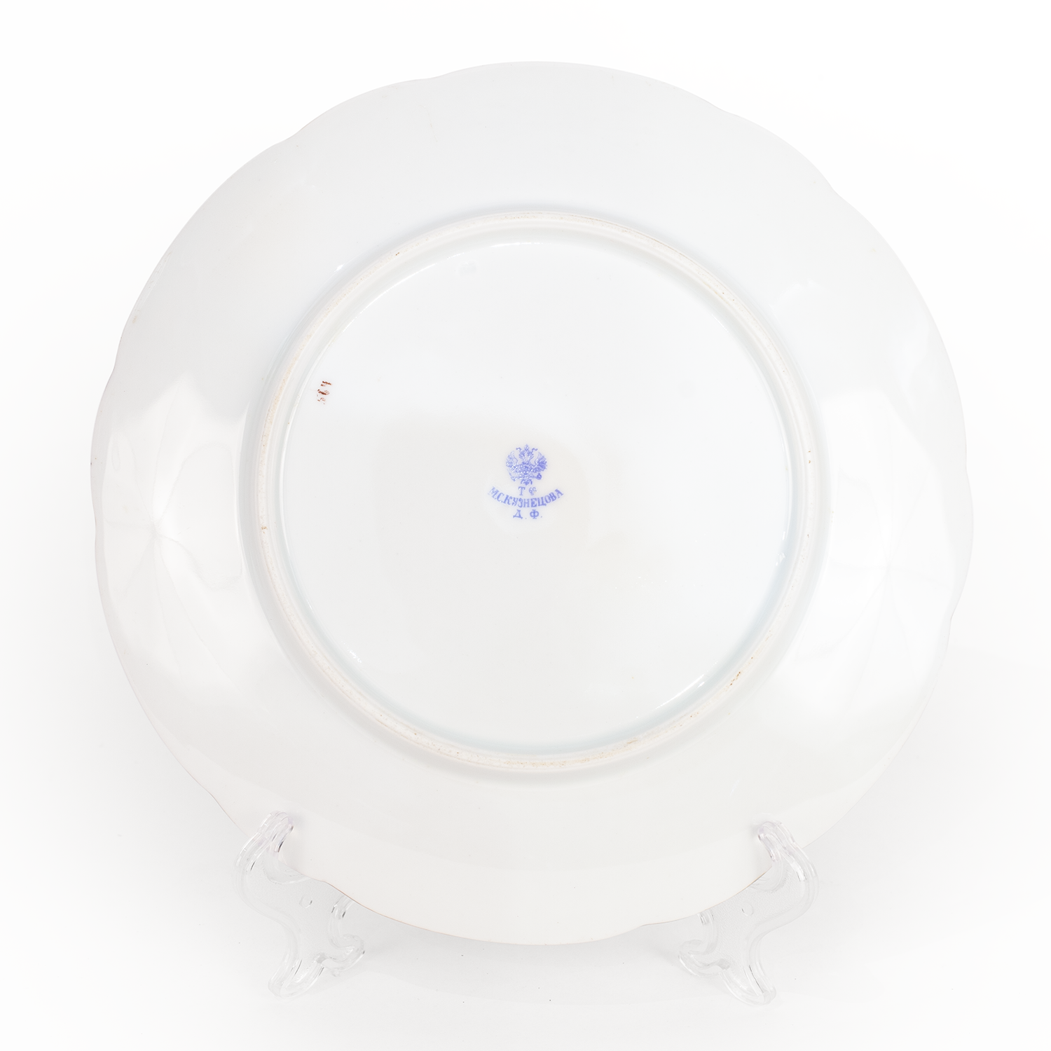 Закусочная тарелка с изображением букета полевых цветов, птицы и бабочки. Фарфор, деколь с подрисовкой, золочение, марка: синим печатная «Т-ва М.С. Кузнецова Д.Ф.» под двуглавым орлом. Россия, село Вербилки Дмитровского уезда Московской губернии, завод М.С. Кузнецова, 1891-1917-е гг. Размер: диаметр 24 см.