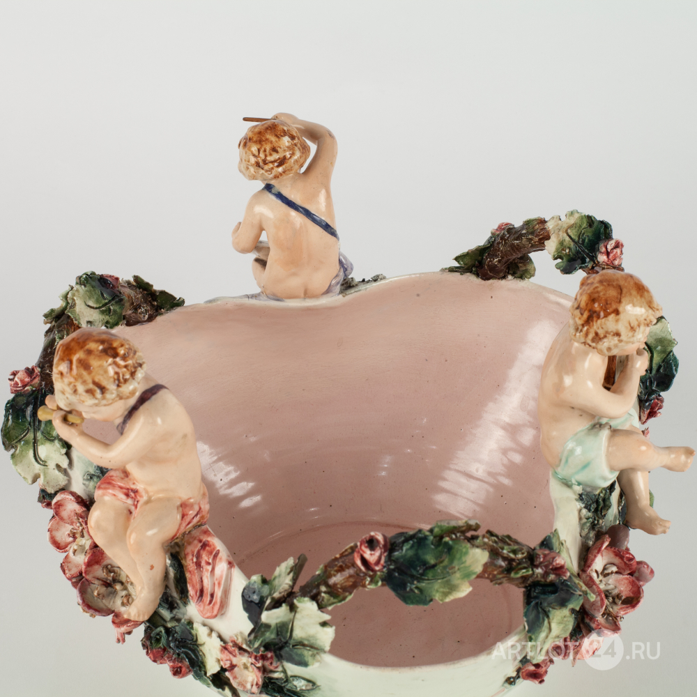 Ваза с тремя декоративными ручками, лепным цветочным декором и фигурами музицирующих. Фаянс, подглазурная полихромная роспись, цифры «3», «3206» в тесте, Европа, конец XIX – начало ХХ века, высота – 22 см, диаметр – 27 см