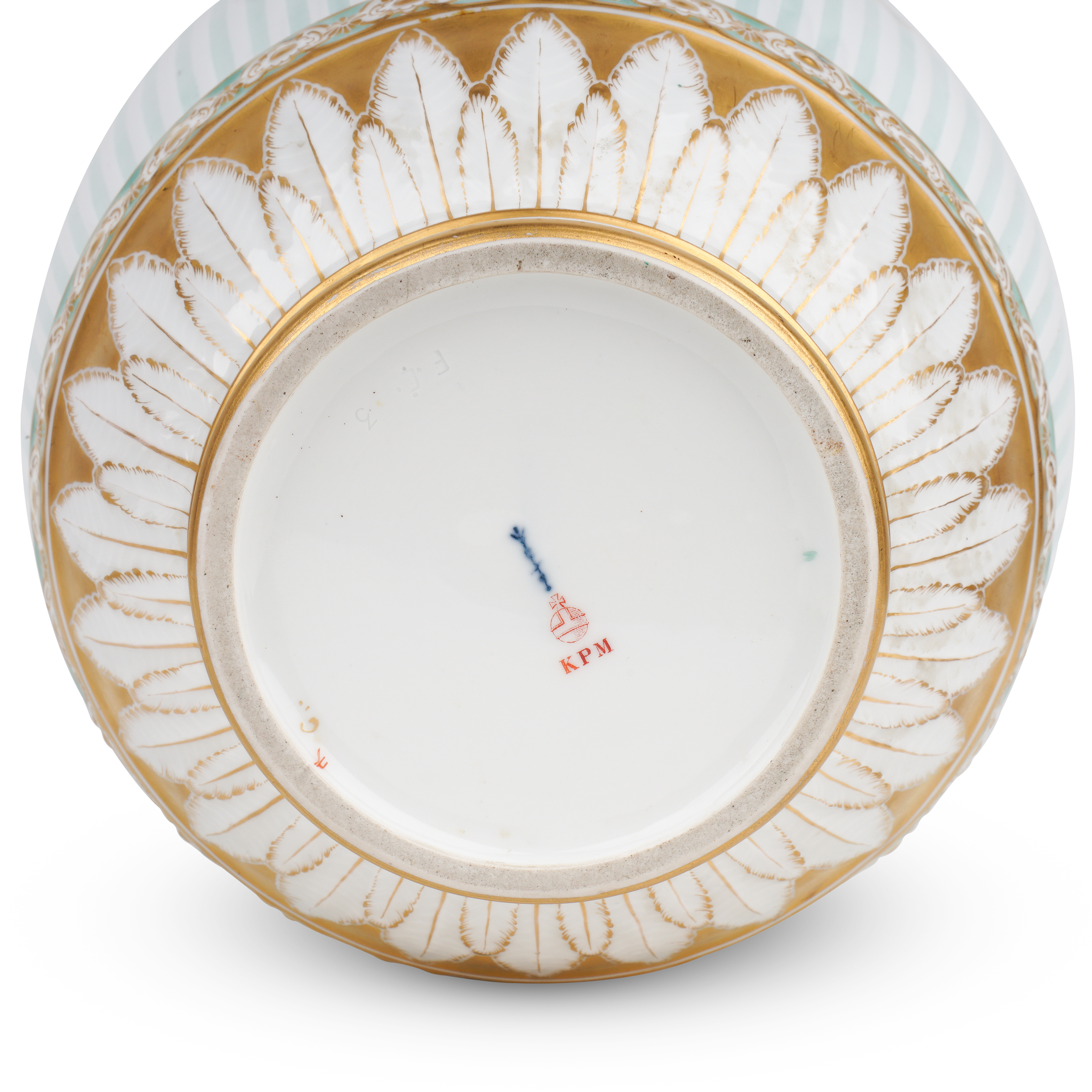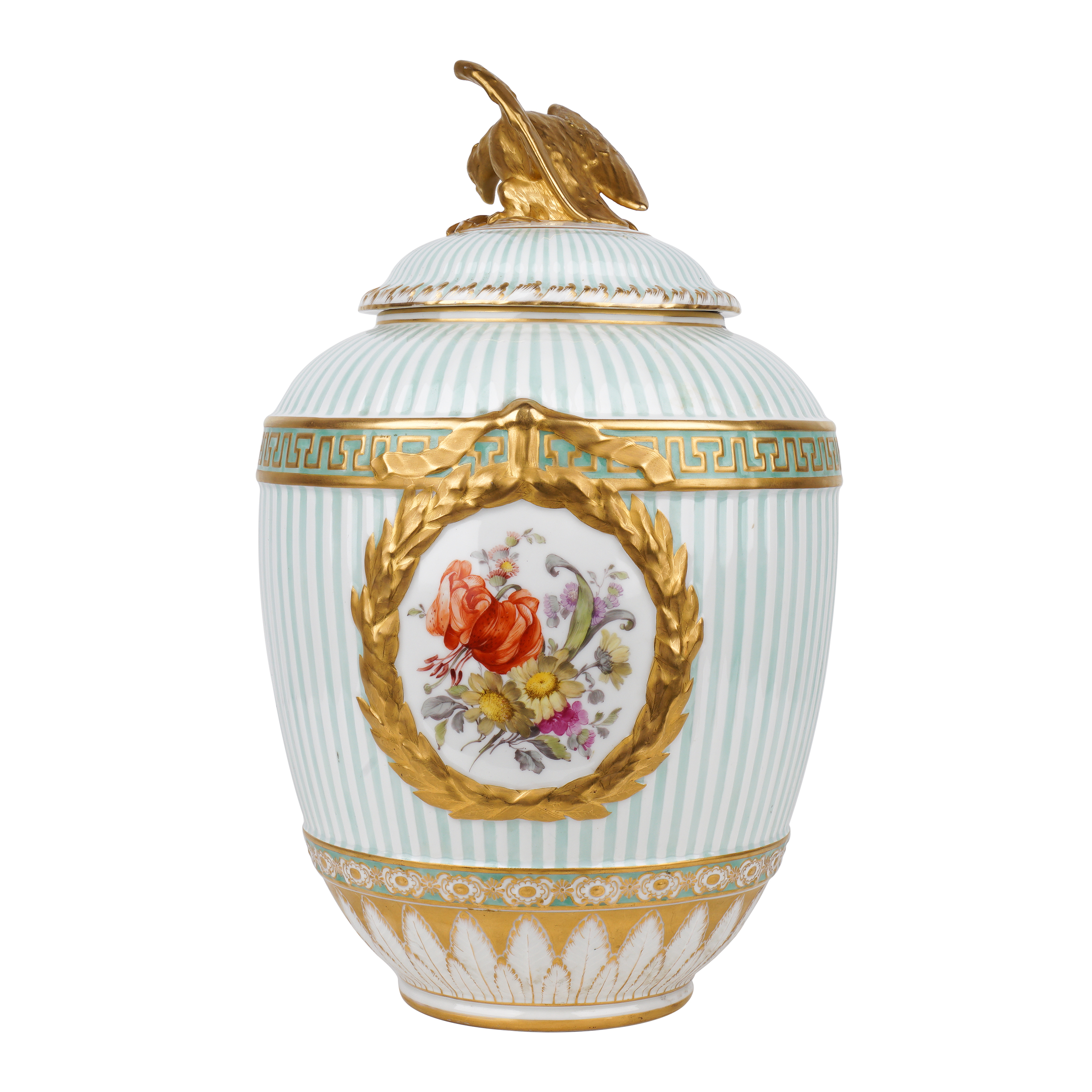 Ваза с цветочными букетами в медальонах и фигурой орла на крышке. Выполнена по модели 1779 года скульптора Фридриха Элиаса Мейера Старшего (1723-1785), мастера-модельера Королевской фарфоровой мануфактуры в Берлине. Фарфор, лепка, рельеф, надглазурная полихромная роспись, золочение, цировка, синее подглазурное клеймо в виде скипетра, красное надглазурное печатное в виде державы с «KPM», «F», «3» в тесте, метка художника по росписи золотом, Королевская Берлинская фарфоровая мануфактура (KPM), Германия, конец XIX - начало XX века, высота - 31 см, диаметр тулова – 22,5 см